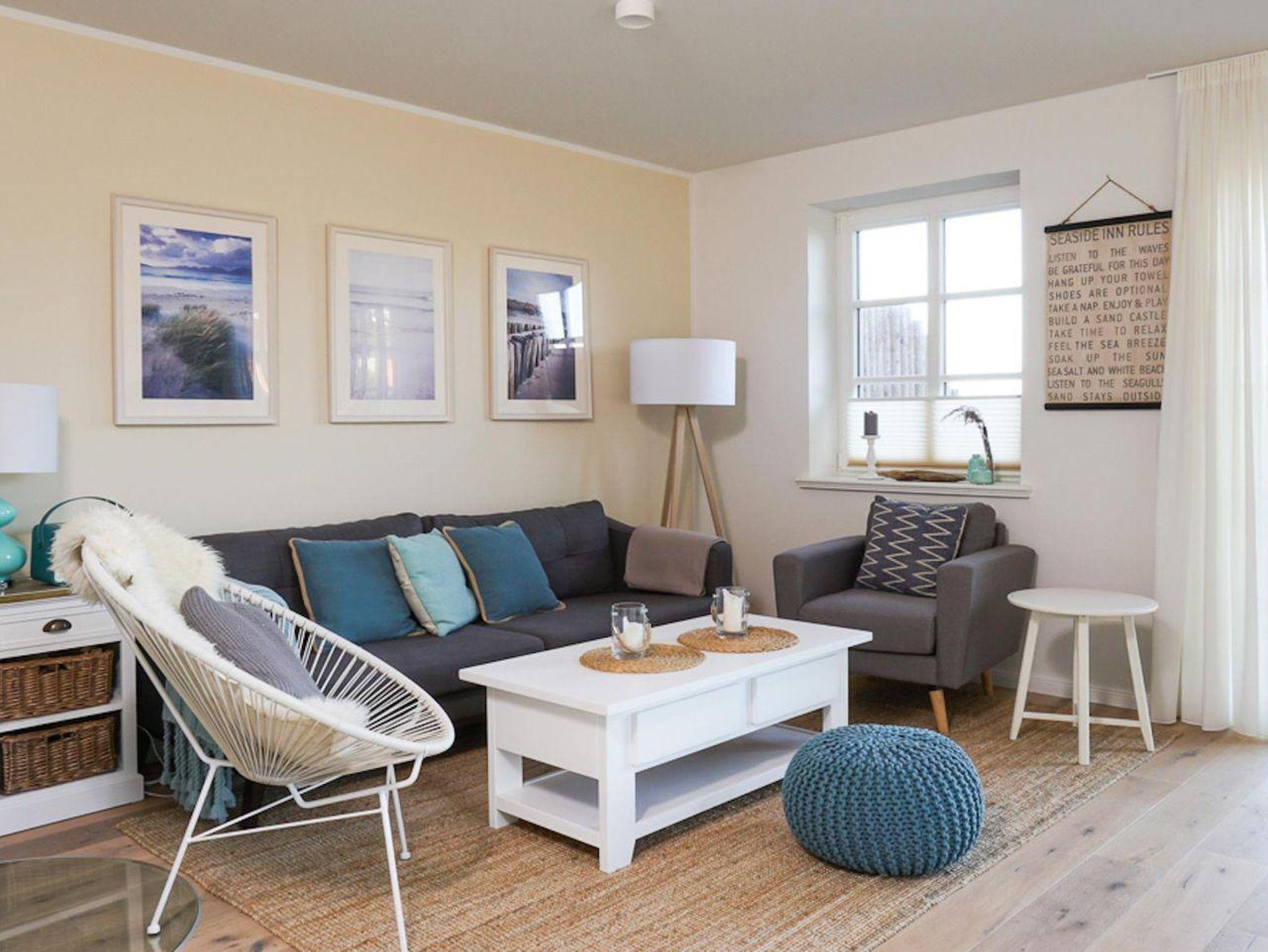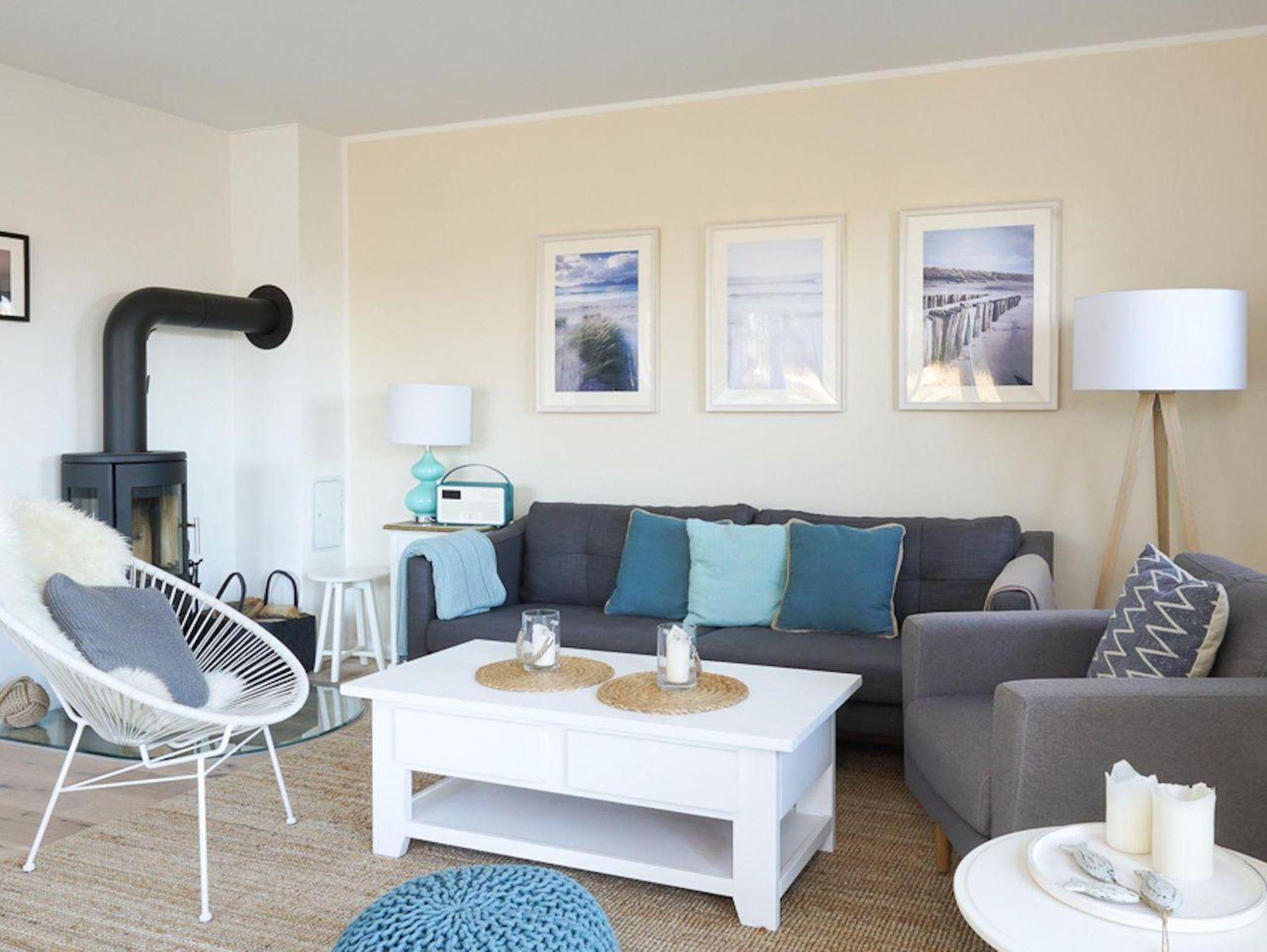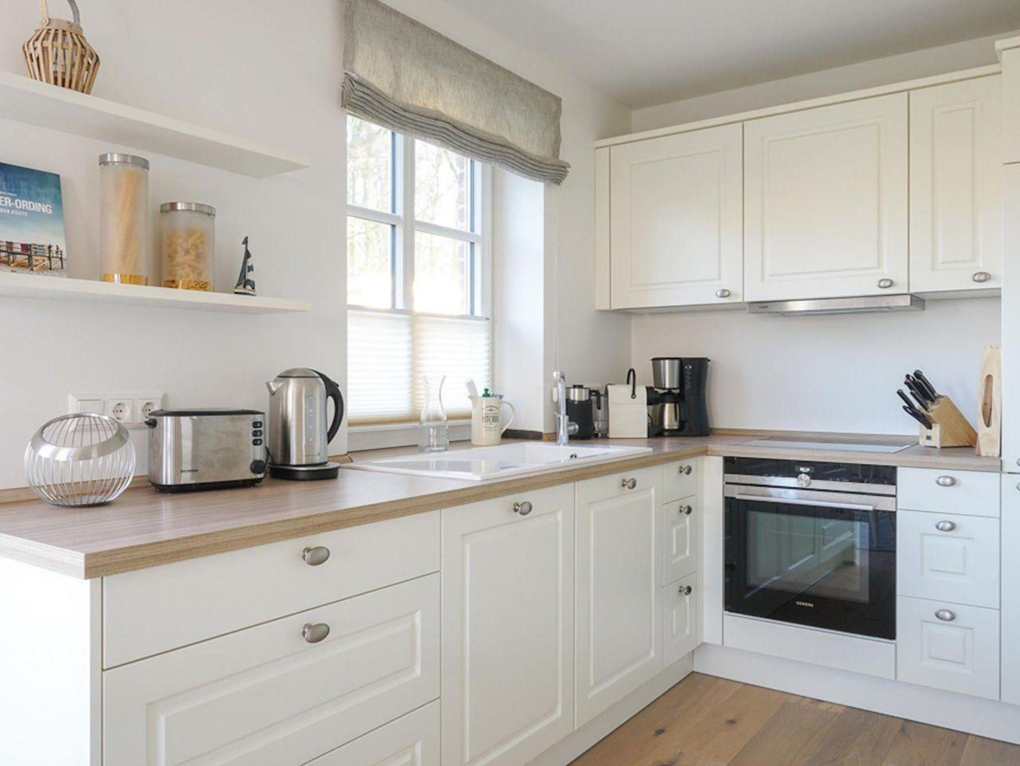 Im Erdgeschoss befindet sich der lichtdurchflutete Wohnraum mit TV, Apple TV, kleine Musikanlage mit Dockingstation für iPhone, Kaminofen, einer offenen Küche sowie einem stilvollen hellen Essbereich mit Blick auf die Düne. Die Wohnräume sind mit exklusiven Möbeln ausgestattet. Die Küche verfügt über hochwertige Elektrogeräte und lässt von der Nespressomaschine über ein Waffeleisen bis zur Salatschleuder keinen Wunsch offen. An den Wohnbereich schließen sich ein Flur mit eingebauter Garderobe, ein Hauswirtschaftsraum mit Waschmaschine und Trockner und ein Duschbad an. Das gesamte Erdgeschoss verfügt über ein hochwertiges weiß gekalktes Eichenparkett, welches über Fußbodenheizung beheizt werden kann.