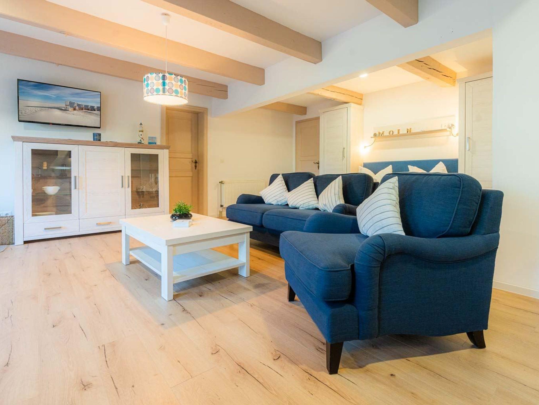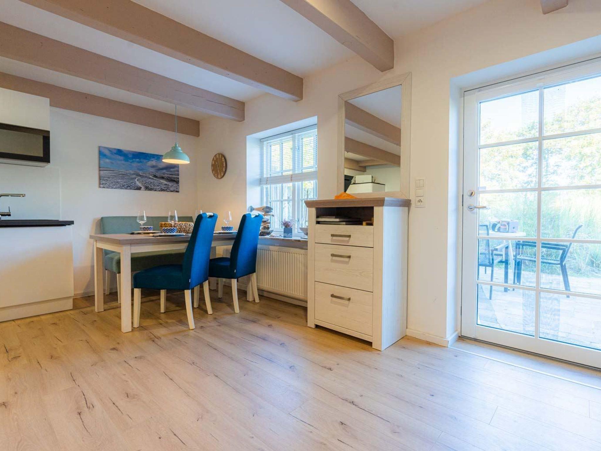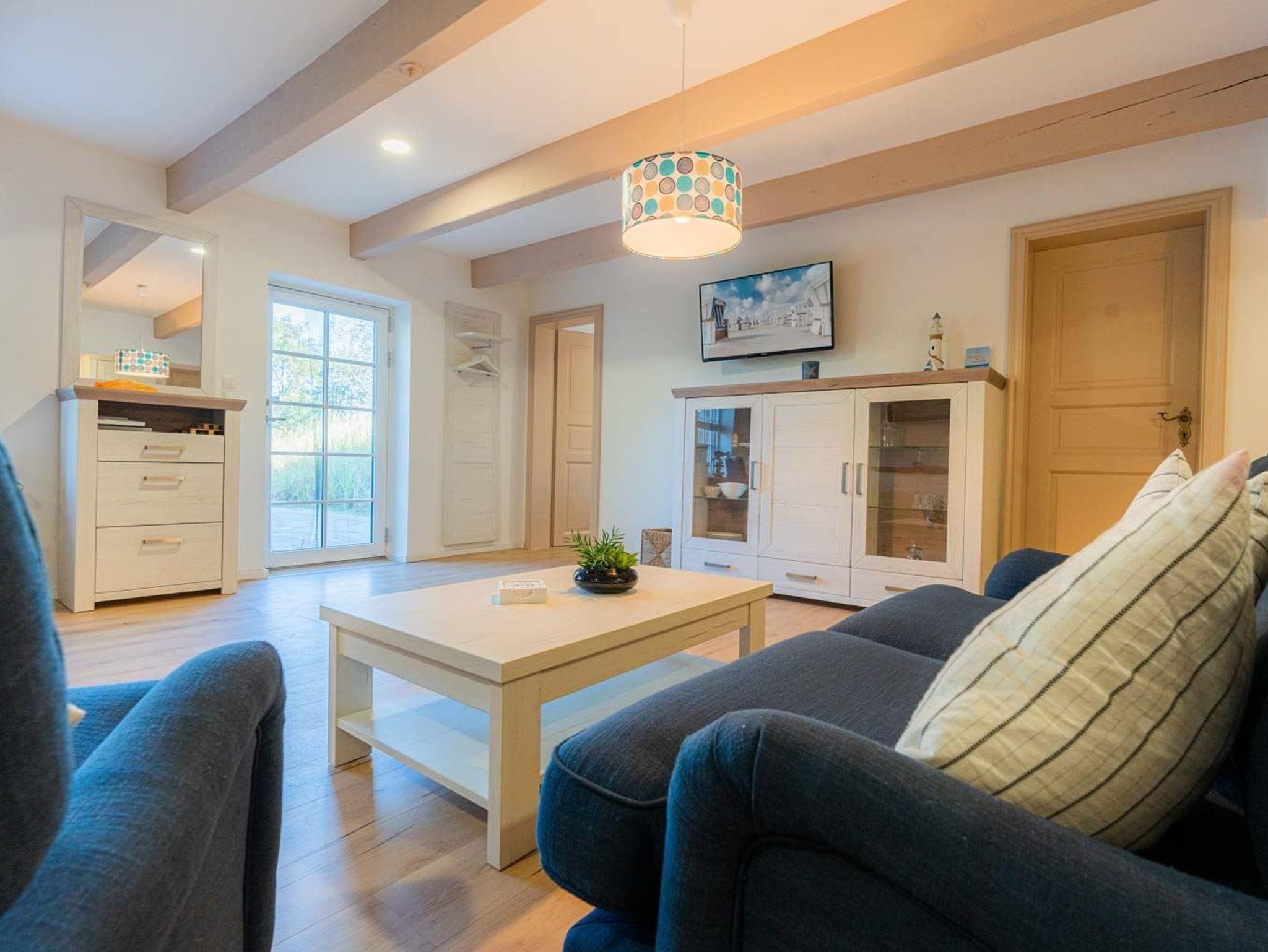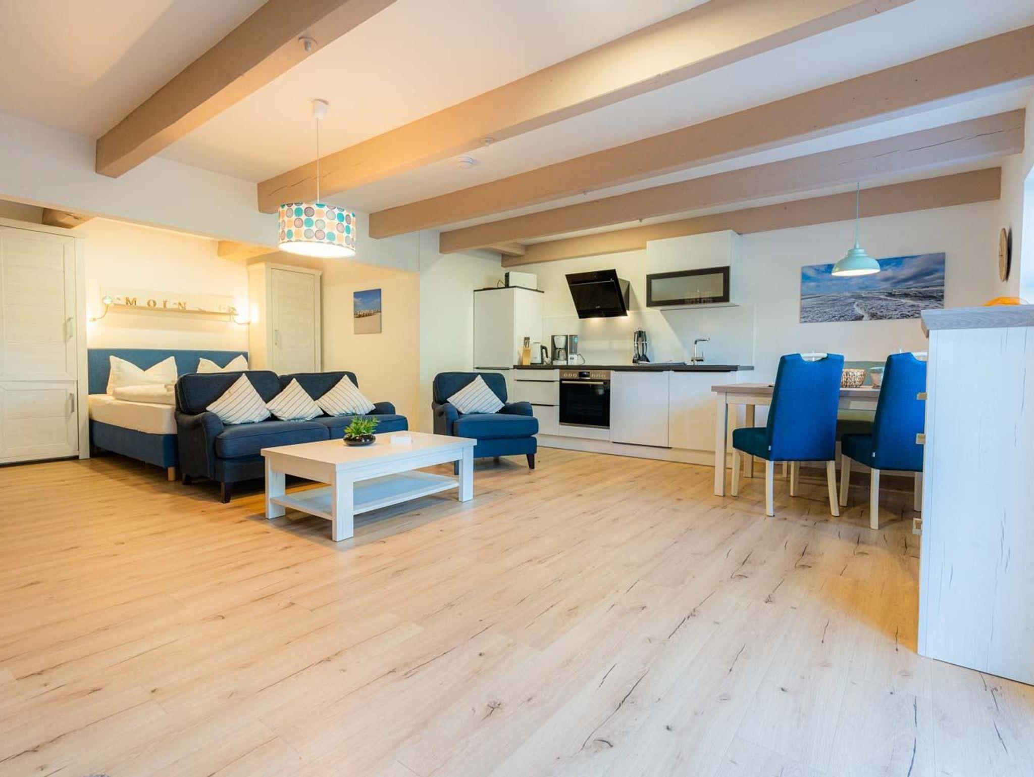 Wohn- und Schlafzimmer mit Sofa, Sessel, SMART-TV, Esstisch mit Sitzbank und 2 Stühlen, Doppelbett (160x200cm, Boxspring) und Kleiderschränken. Offene Küche mit Backofen, Geschirrspüler und Kühlschrank (Gefriermöglichkeit im Gemeinschaftsraum). Direkter Zugang zur möblierten Terrasse nach Norden mit Dünengras-Wall.
