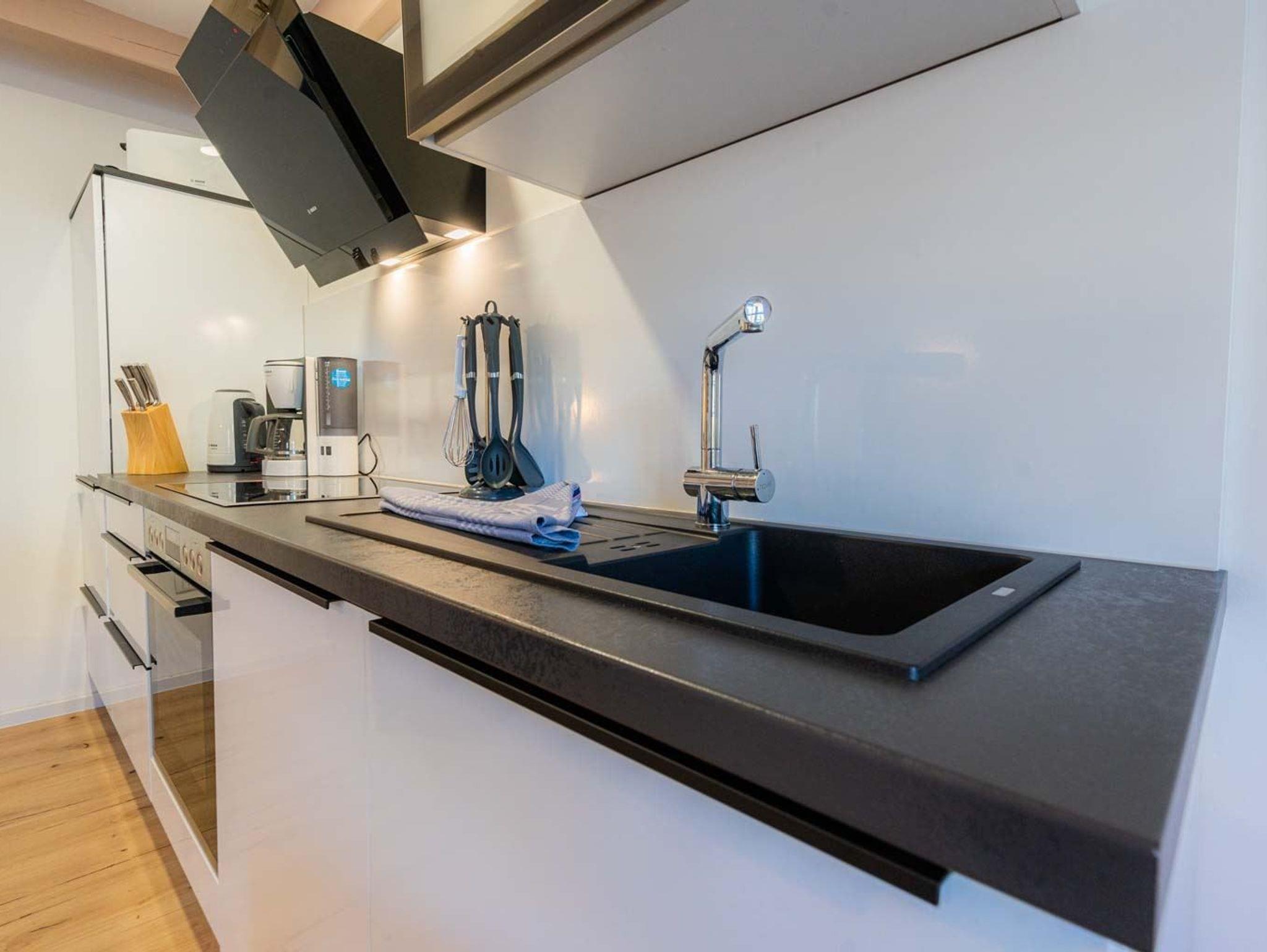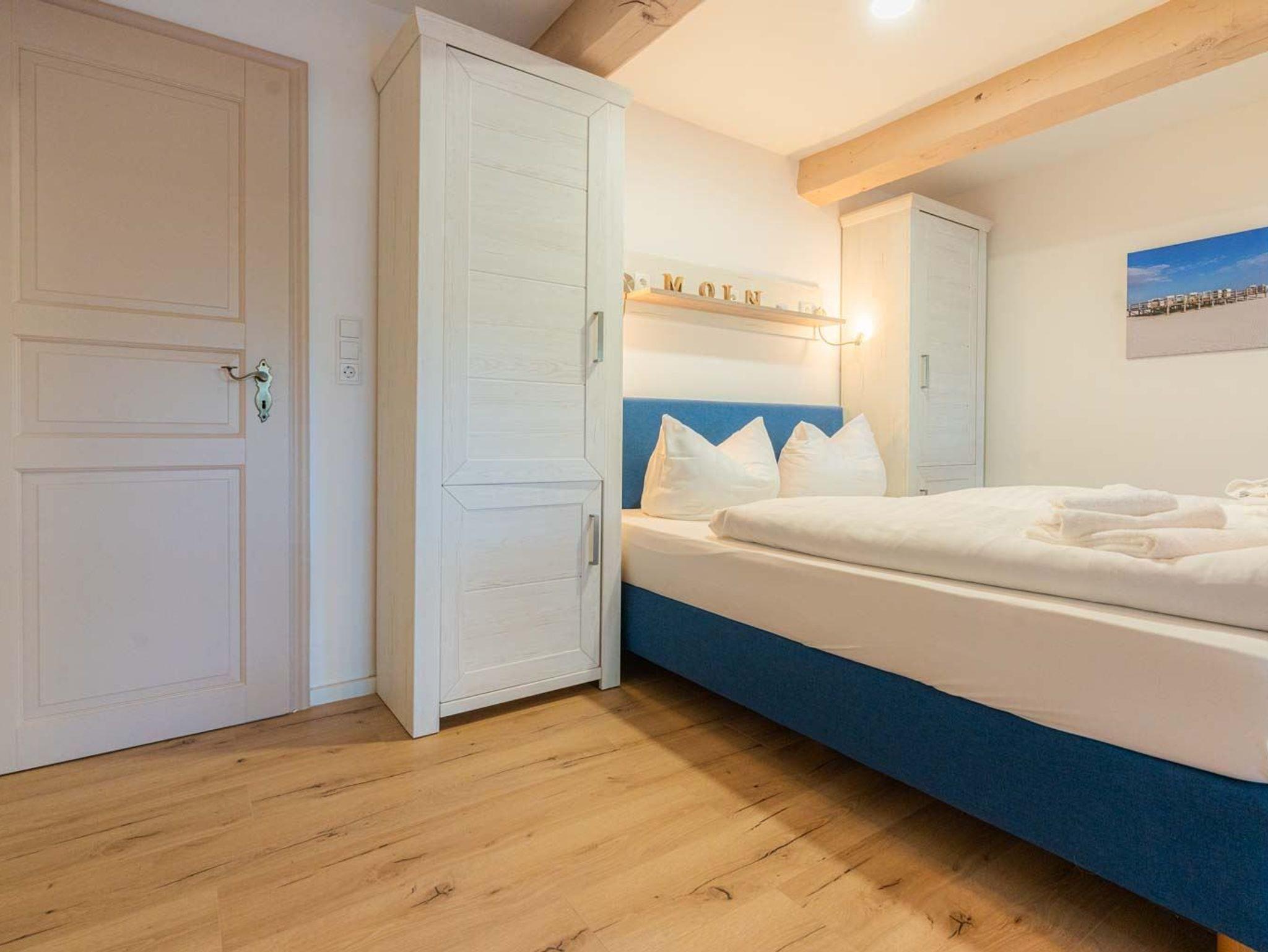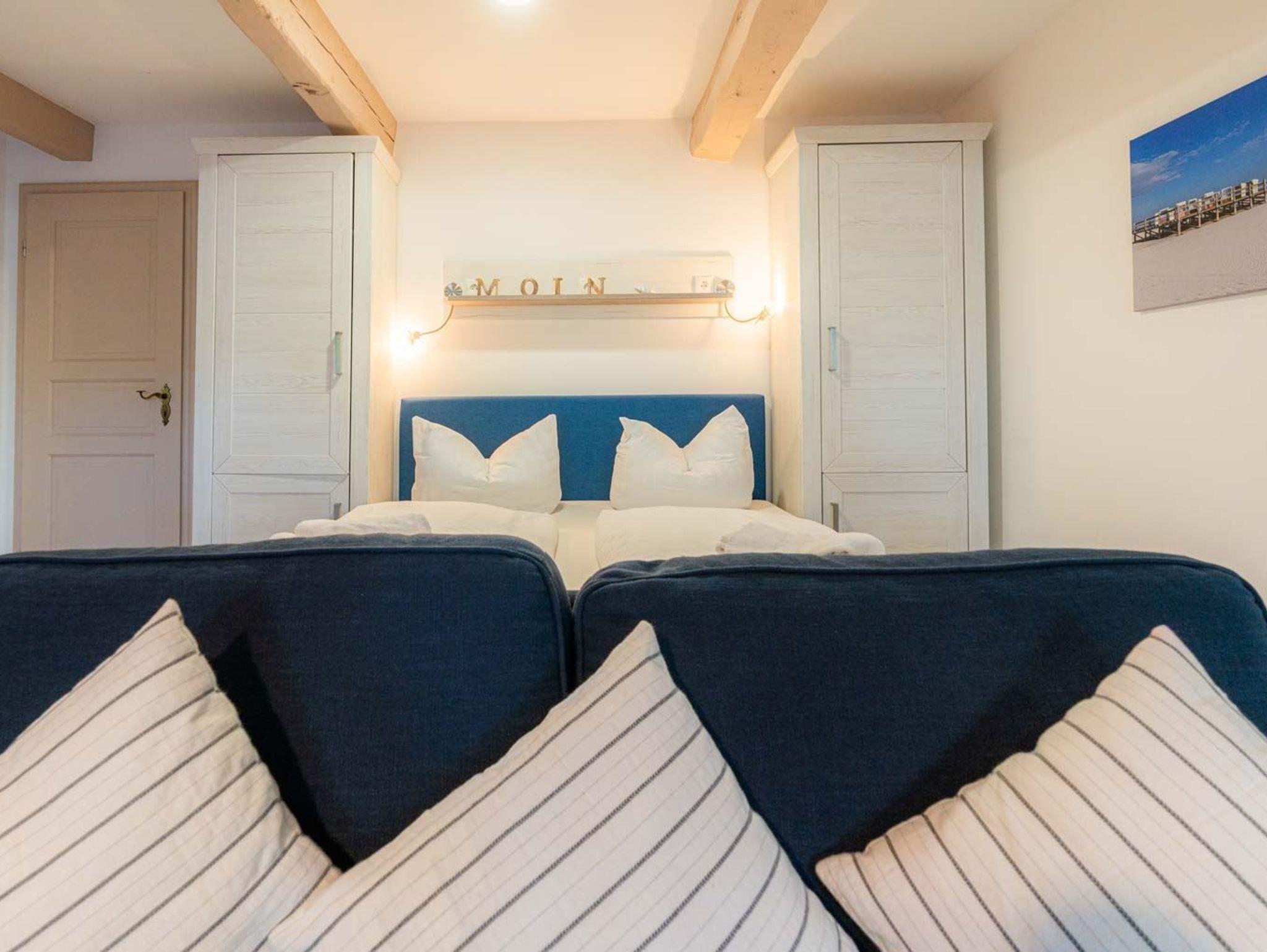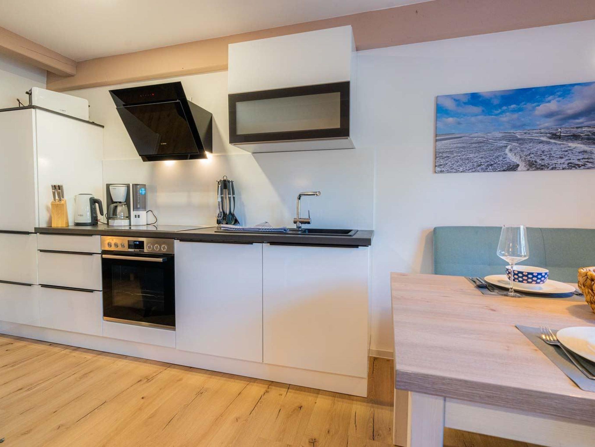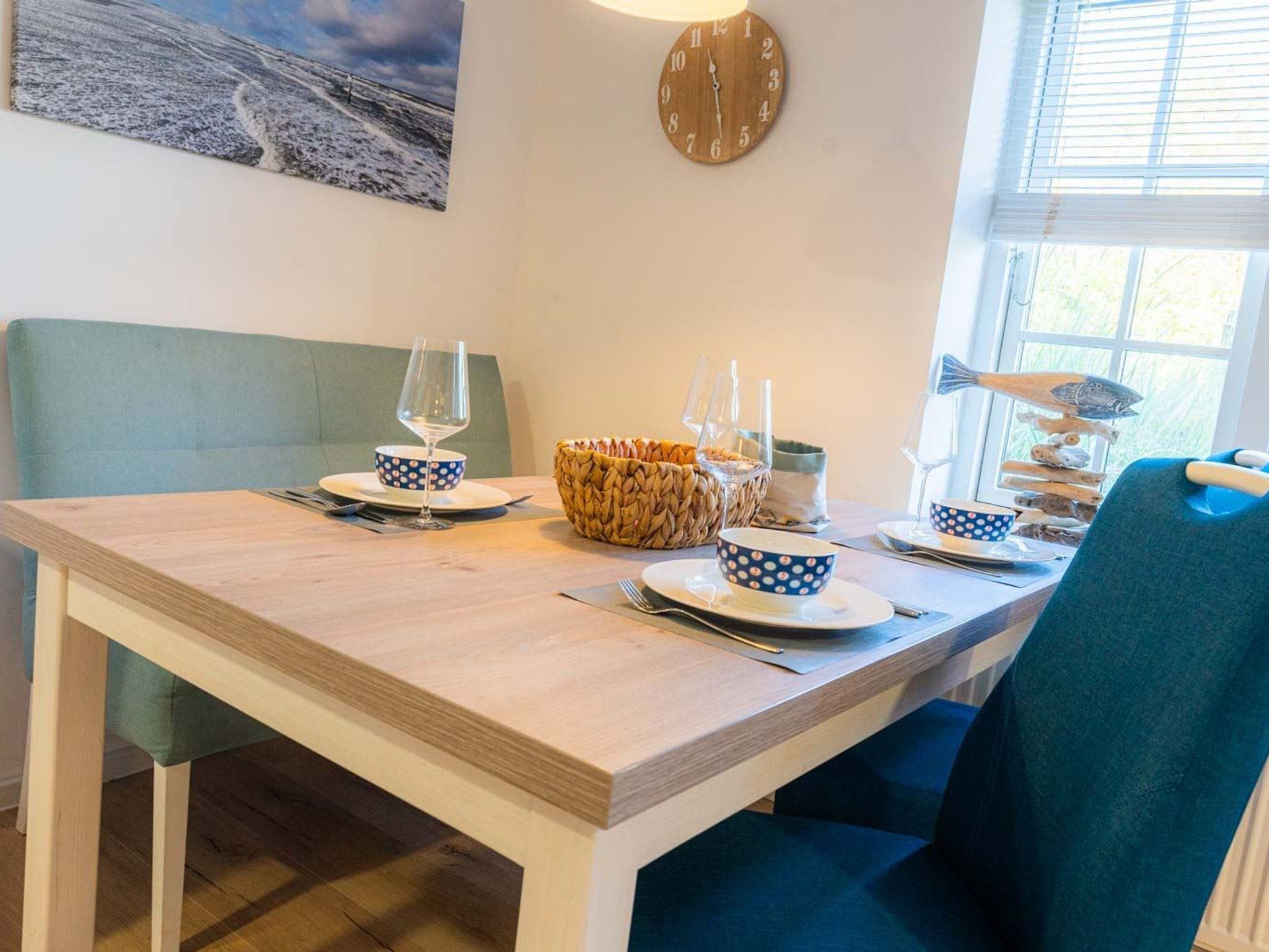 Wohn- und Schlafzimmer mit Sofa, Sessel, SMART-TV, Esstisch mit Sitzbank und 2 Stühlen, Doppelbett (160x200cm, Boxspring) und Kleiderschränken. Offene Küche mit Backofen, Geschirrspüler und Kühlschrank (Gefriermöglichkeit im Gemeinschaftsraum). Direkter Zugang zur möblierten Terrasse nach Norden mit Dünengras-Wall.