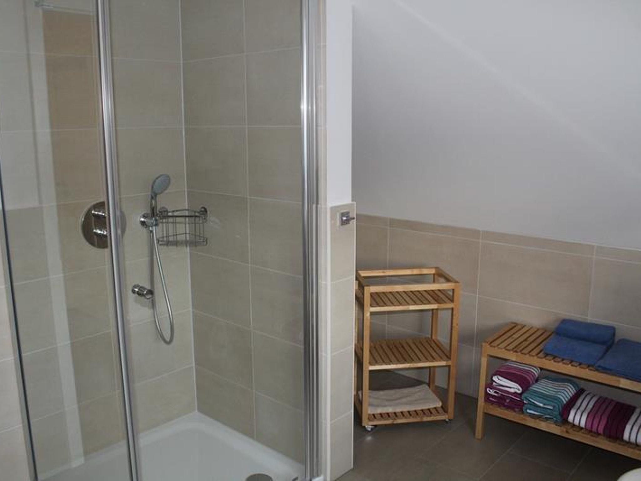 Dusche/WC und ein Hauswirtschaftsraum mit Waschmaschine, Wäscheständer u. Bügeleisen befinden sich im EG.