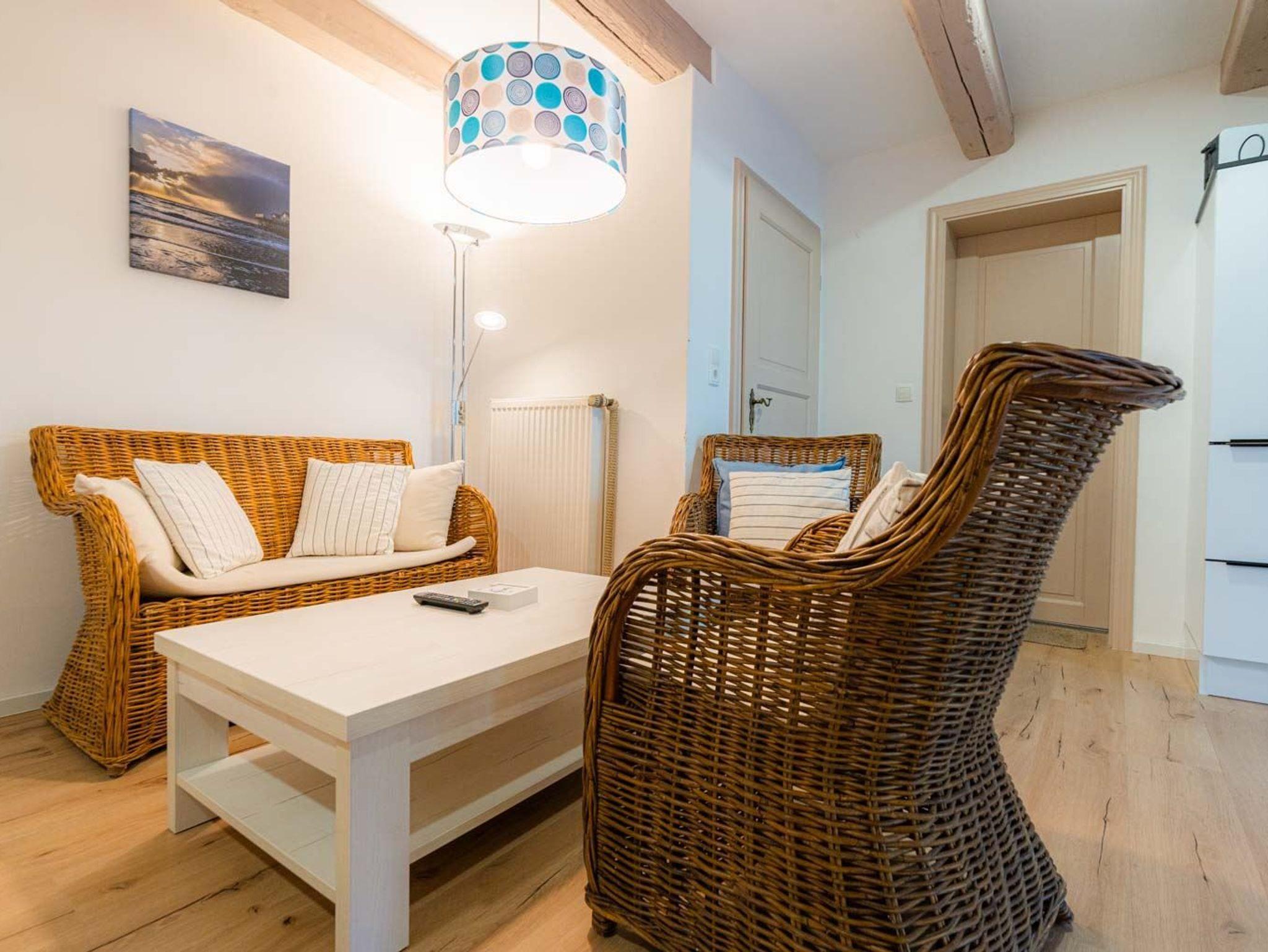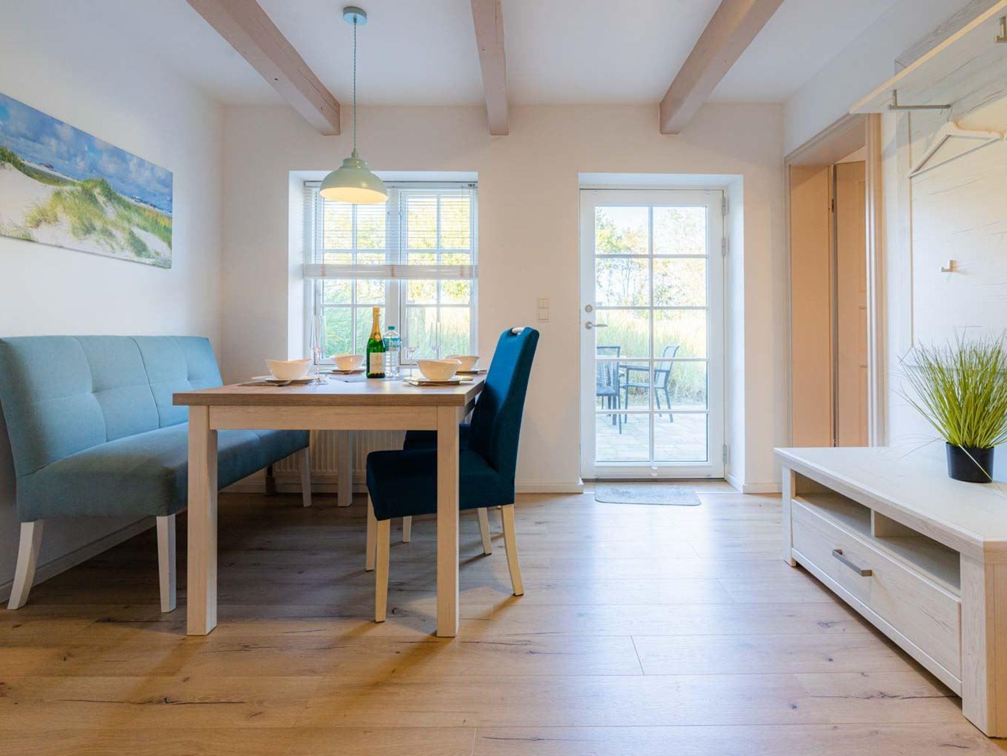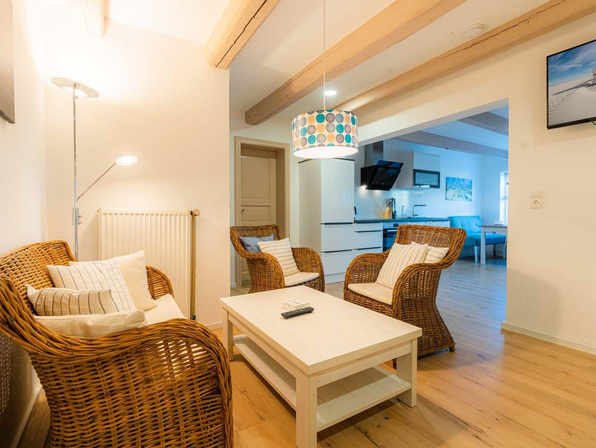 Wohn- und Schlafzimmer mit Korbsofa, 2 Korbsesseln, SMART-TV, Esstisch mit Sitzbank und 2 Stühlen, Doppelbett (160x200cm, Boxspring) und Kleiderschränken. Offene Küche mit Backofen, Geschirrspüler und Kühlschrank (Gefriermöglichkeit im Gemeinschaftsraum). Direkter Zugang zur möblierten Terrasse nach Norden mit Dünengras-Wall.