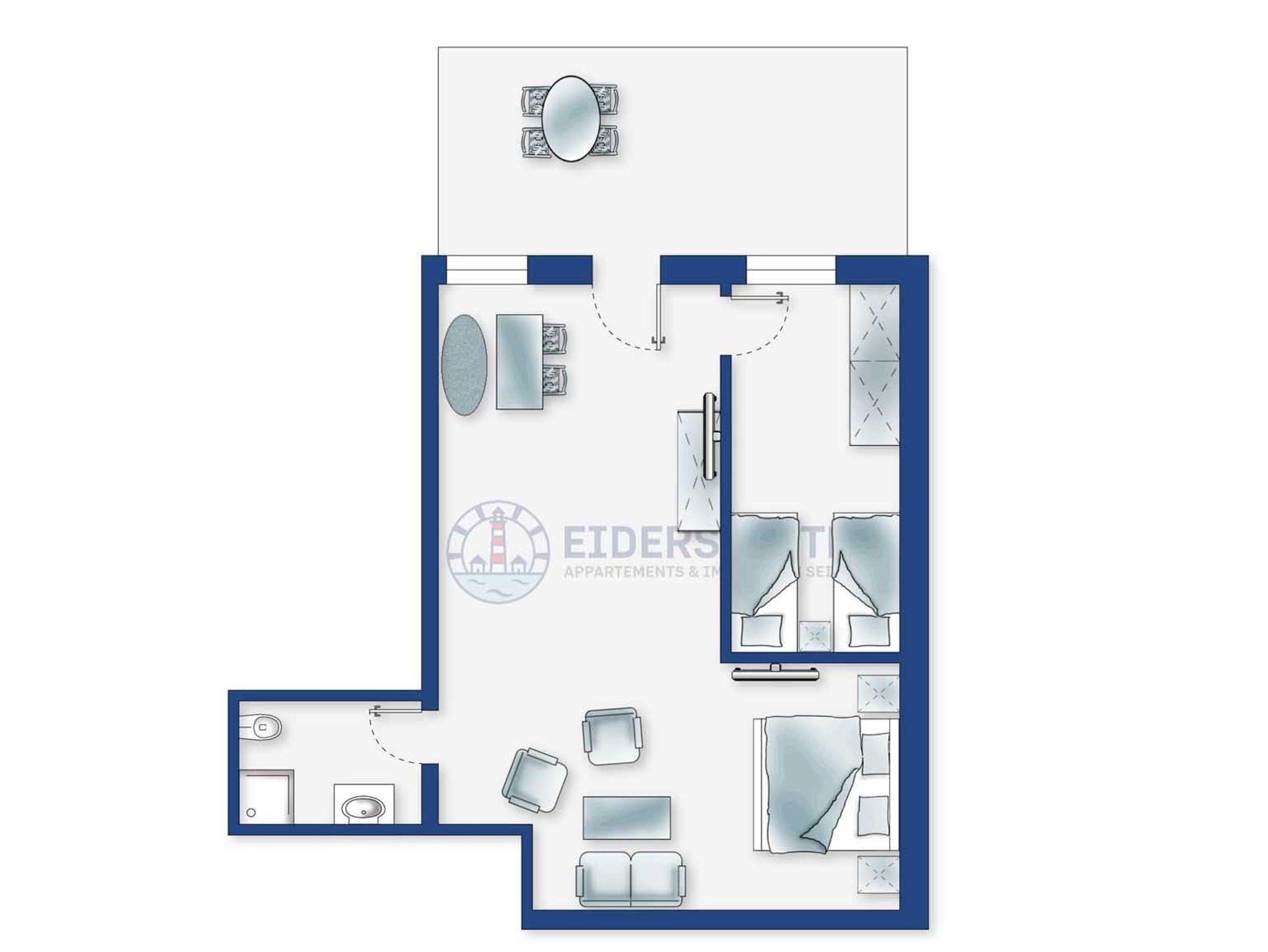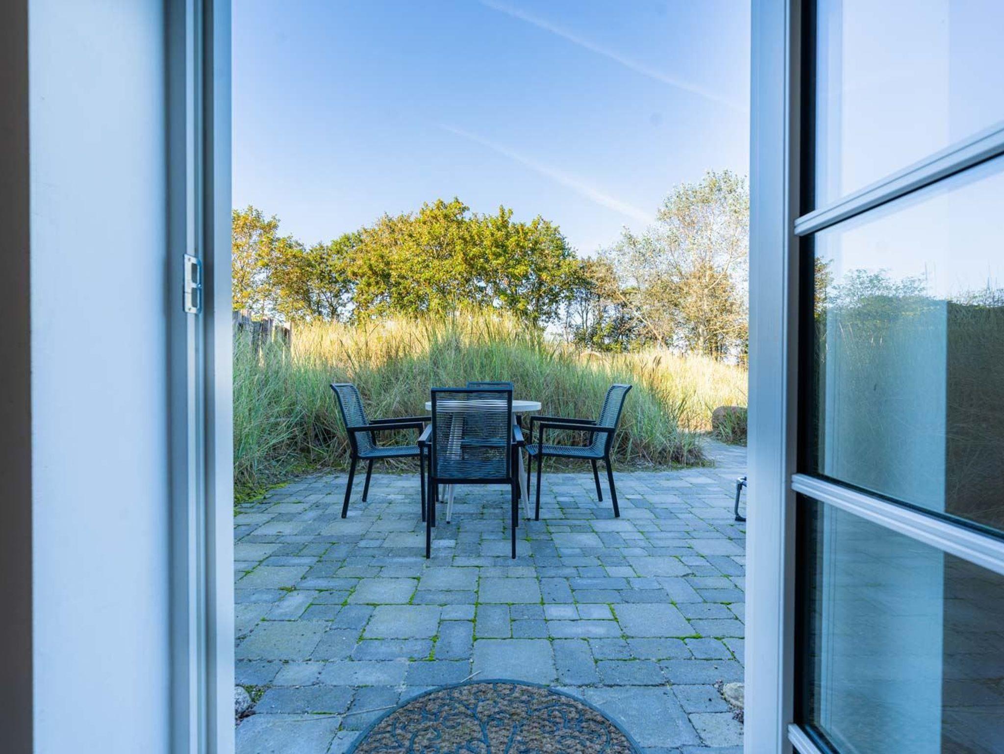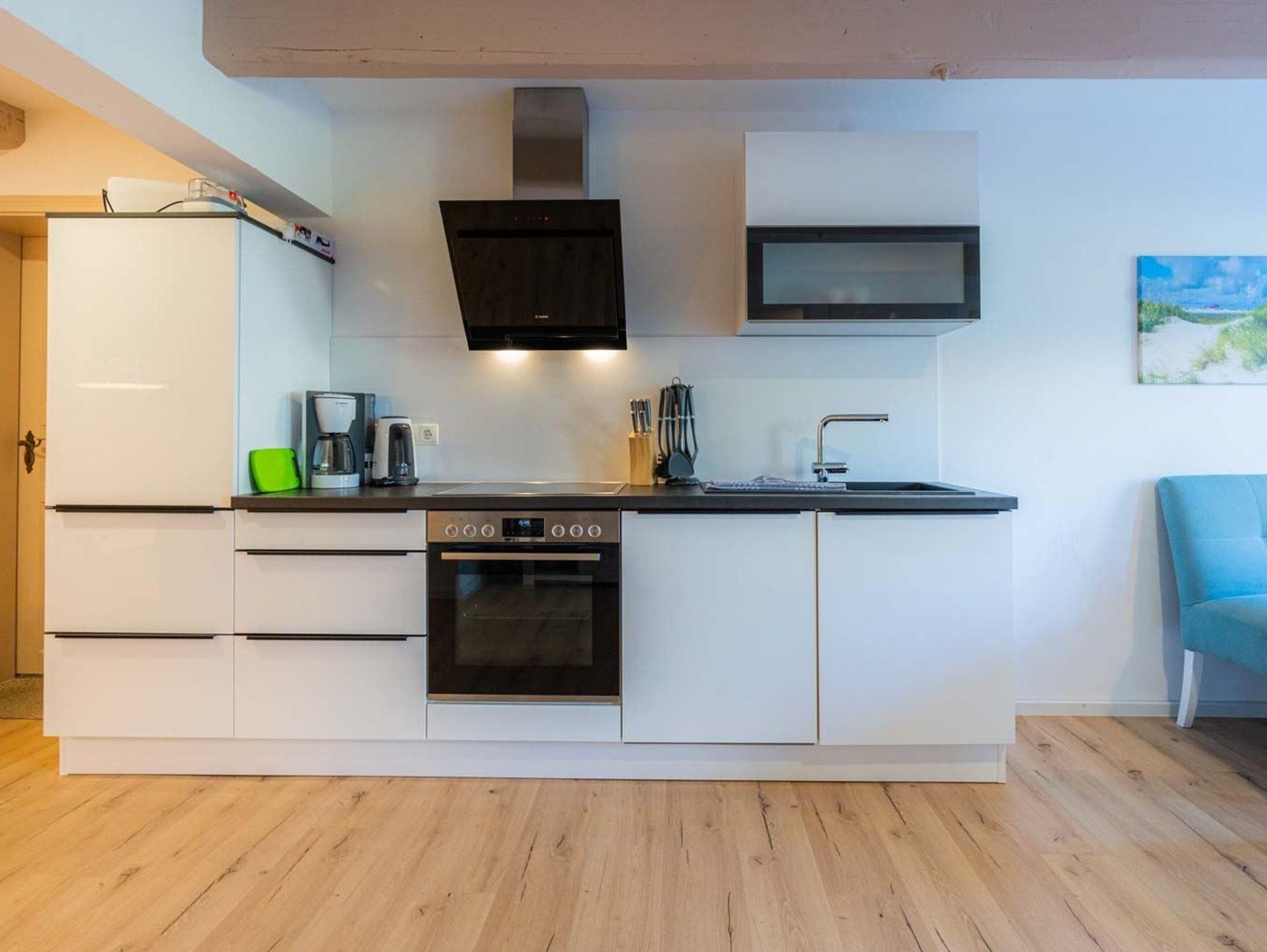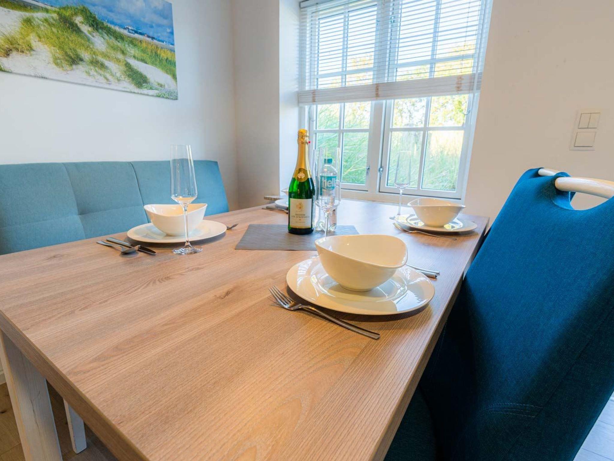 Wohn- und Schlafzimmer mit Korbsofa, 2 Korbsesseln, SMART-TV, Esstisch mit Sitzbank und 2 Stühlen, Doppelbett (160x200cm, Boxspring) und Kleiderschränken. Offene Küche mit Backofen, Geschirrspüler und Kühlschrank (Gefriermöglichkeit im Gemeinschaftsraum). Direkter Zugang zur möblierten Terrasse nach Norden mit Dünengras-Wall.