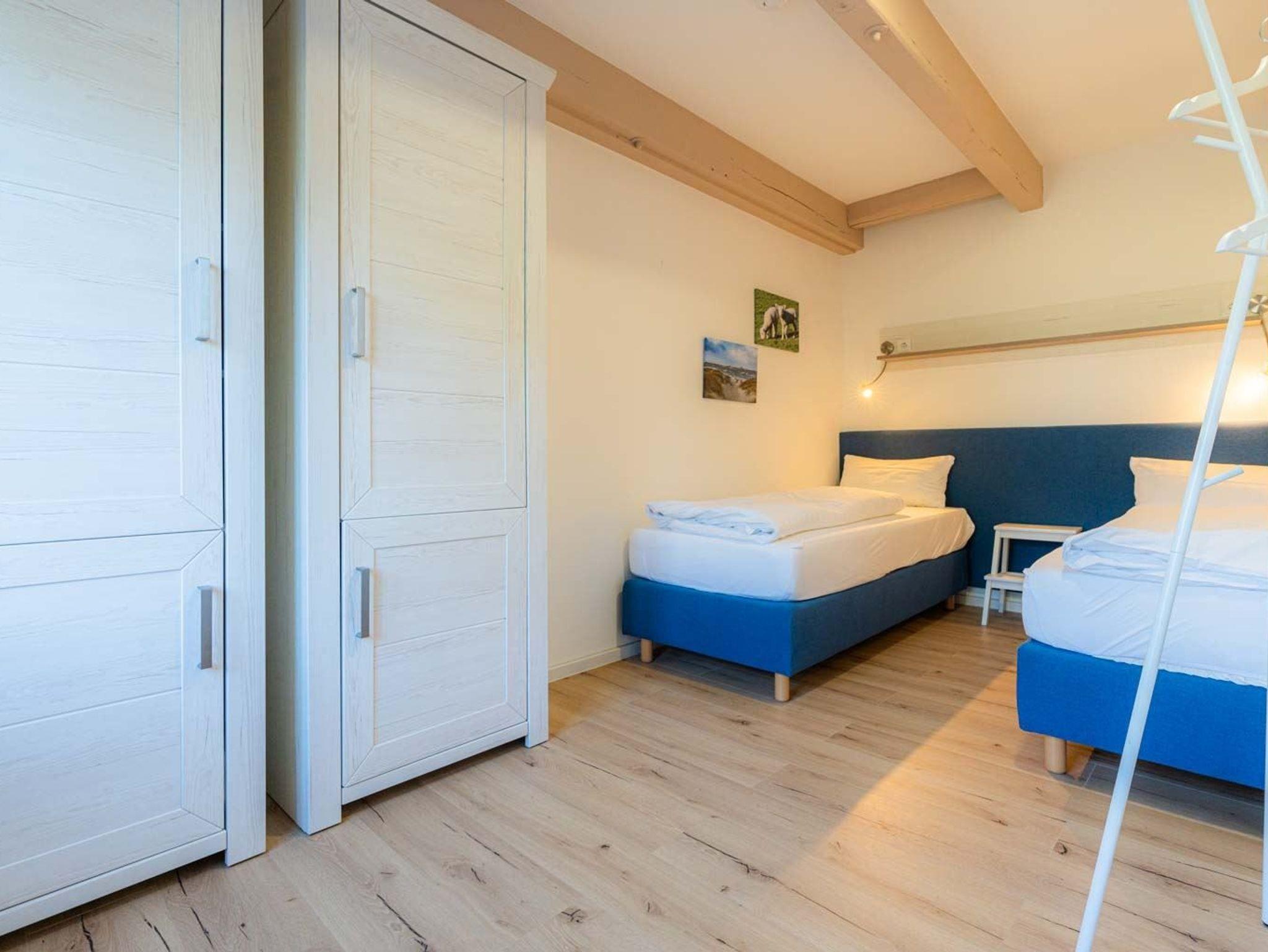 Schlafzimmer mit 2 Einzelbetten (je 80x200cm), Kleiderschränken und Garderobenständer.