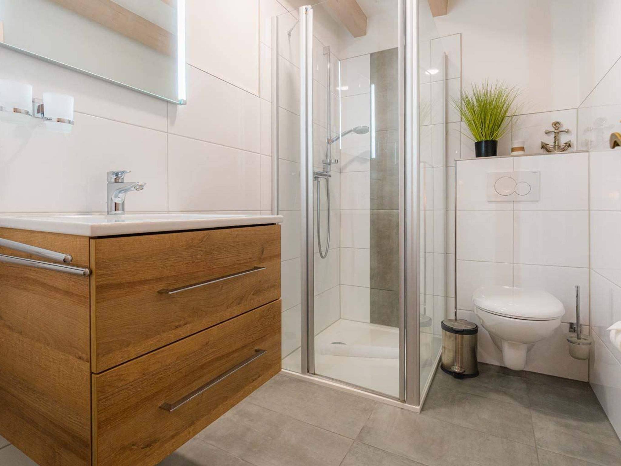 Badezimmer (Duschbad) mit bodengleicher Dusche, WC, Handtuchwärmer und Föhn.