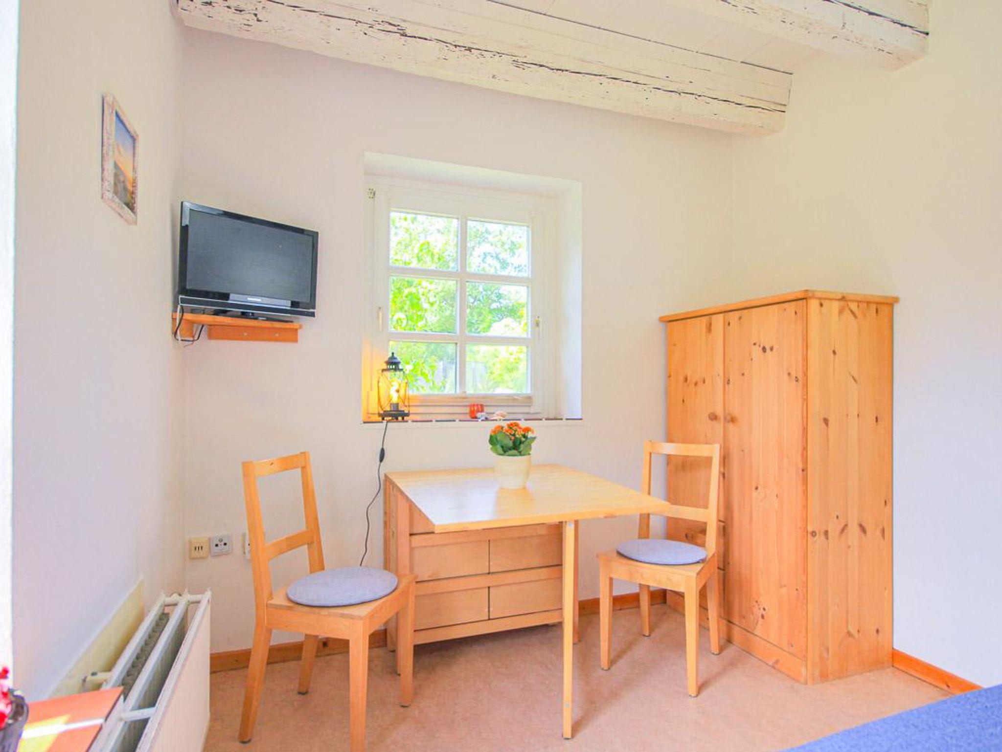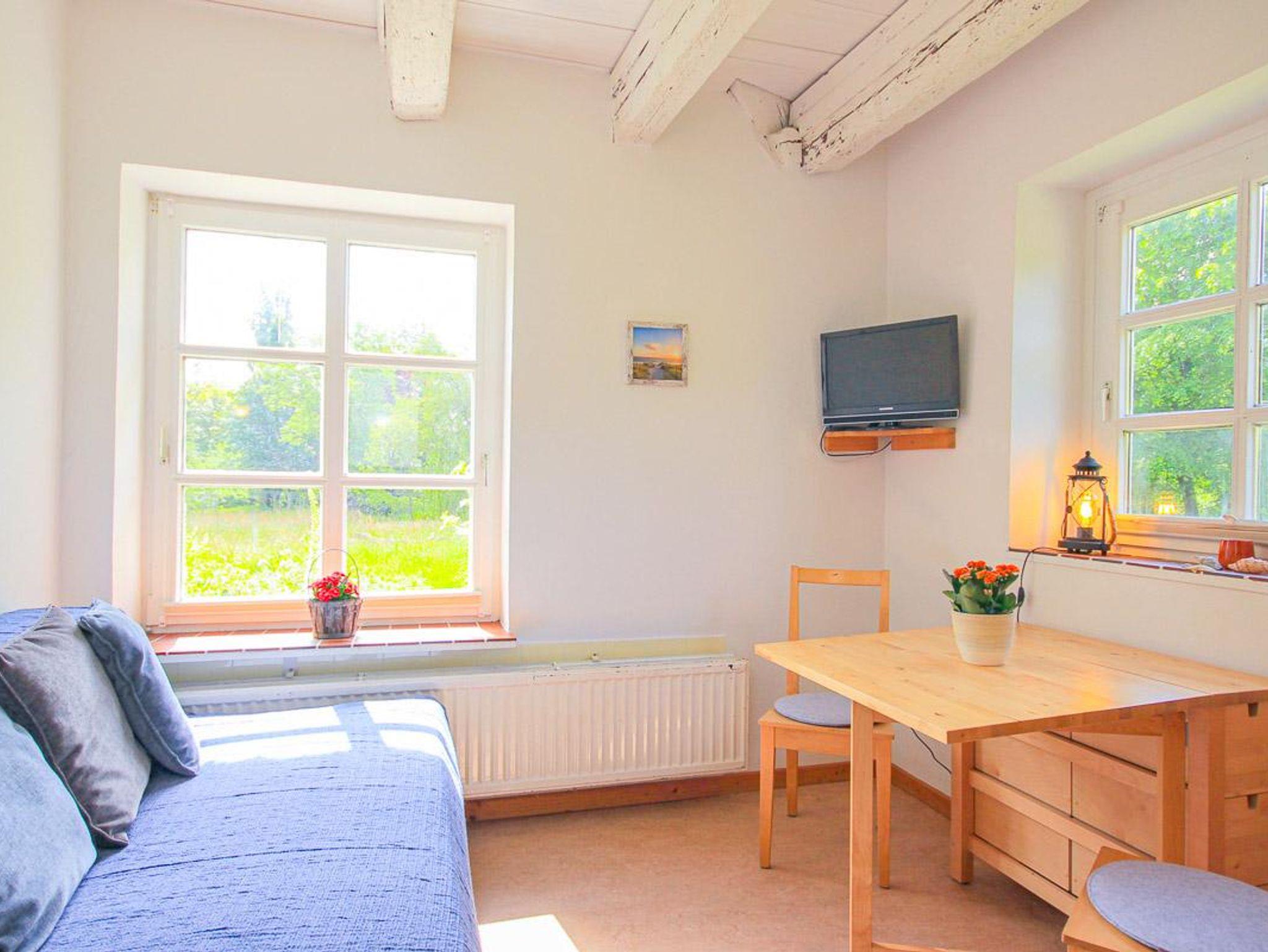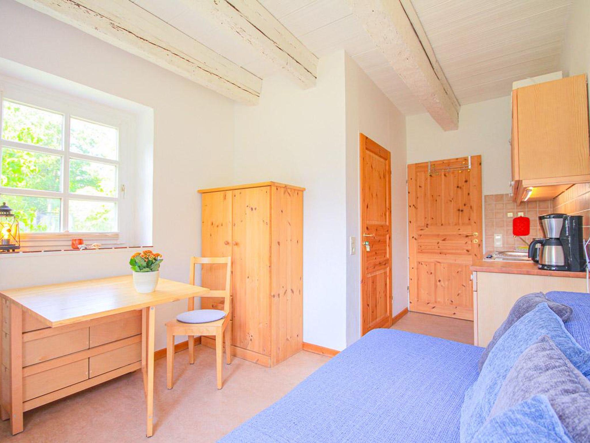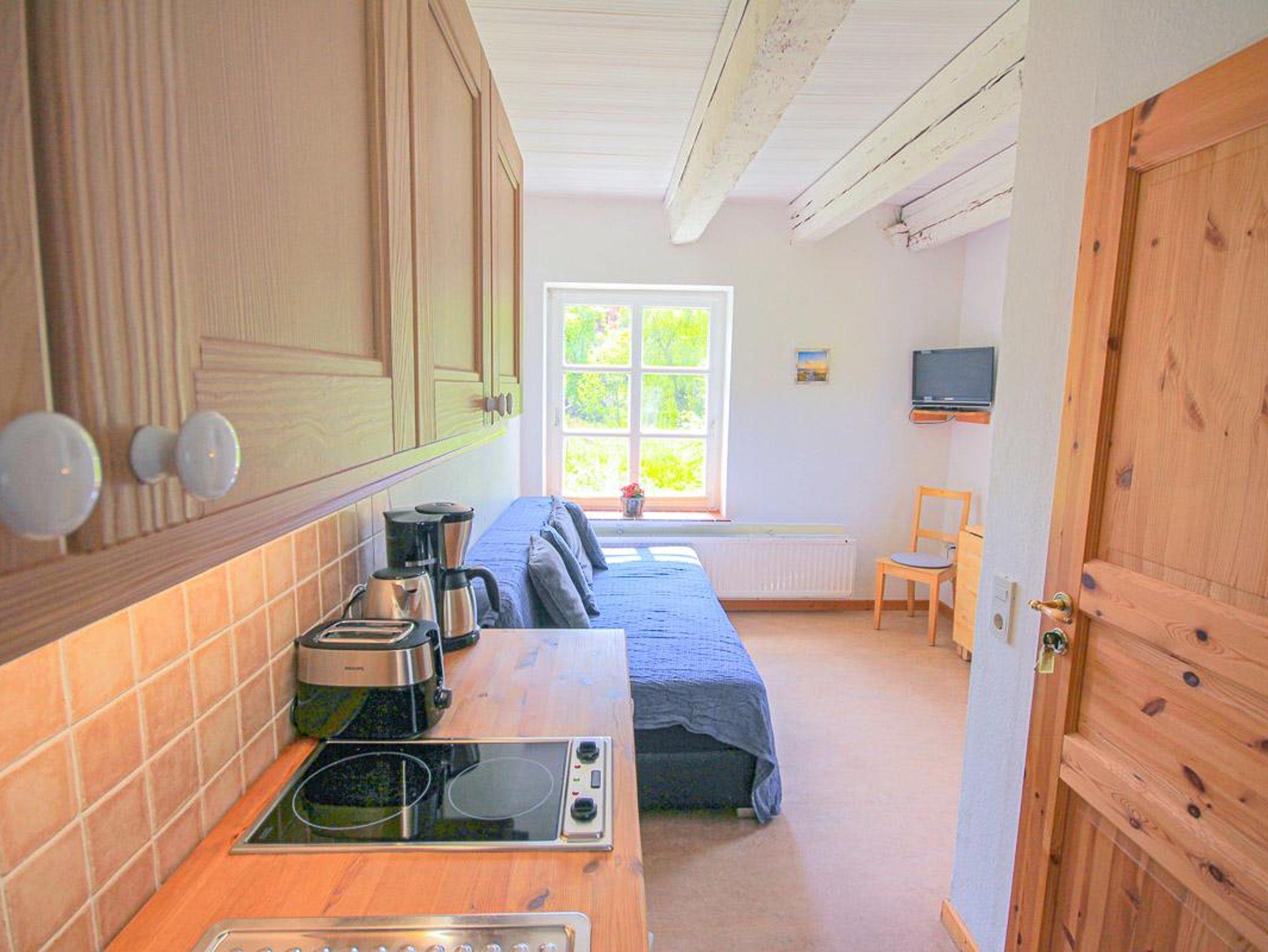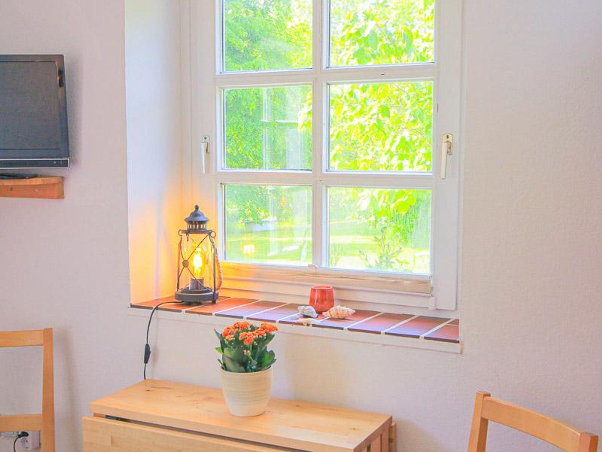 Unsere kleine Eckwohnung mit Gartenblick befindet sich im Erdgeschoss und bietet mit einer Fläche von 15 m² Platz für bis zu 2 Personen. Wohn-/Schlafraum mit Schlafsofa und Essecke, Sat-TV, integrierter Pantry Küche mit 2 Platten-Ceran-Kochfeld, Mikrowelle, Kühlschrank mit Gefrierfach. Kaffeemaschine und Wasserkocher. Duschbad mit WC. Nichtraucherwohnung, Hunde willkommen. W-LAN.