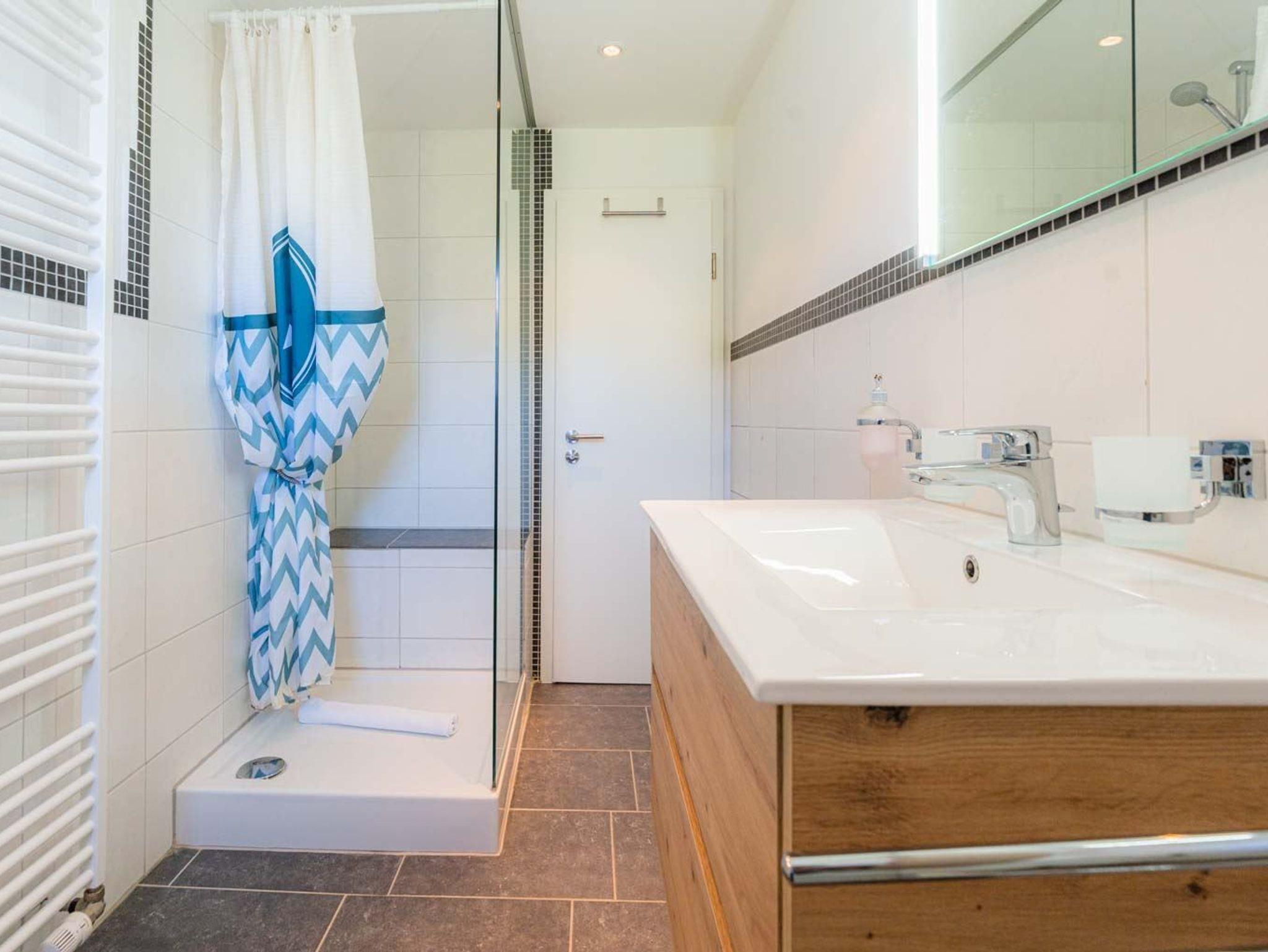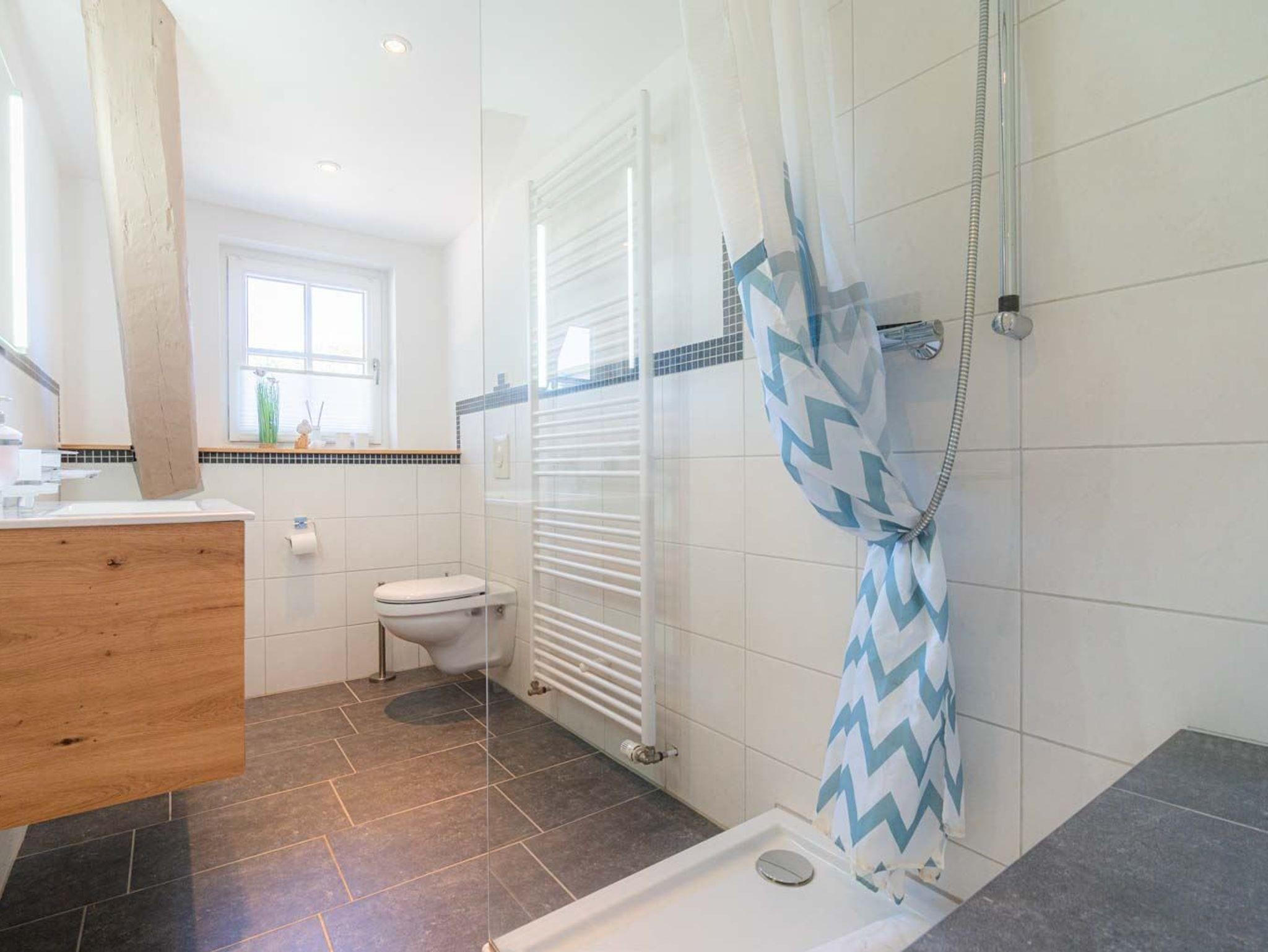 Badezimmer (Duschbad) mit Dusche, WC, Tageslicht, Handtuchwärmer und Föhn.
