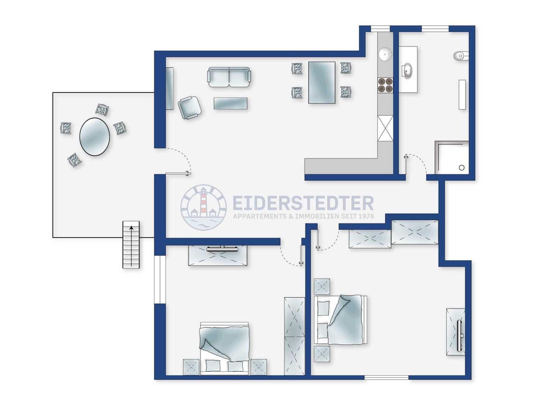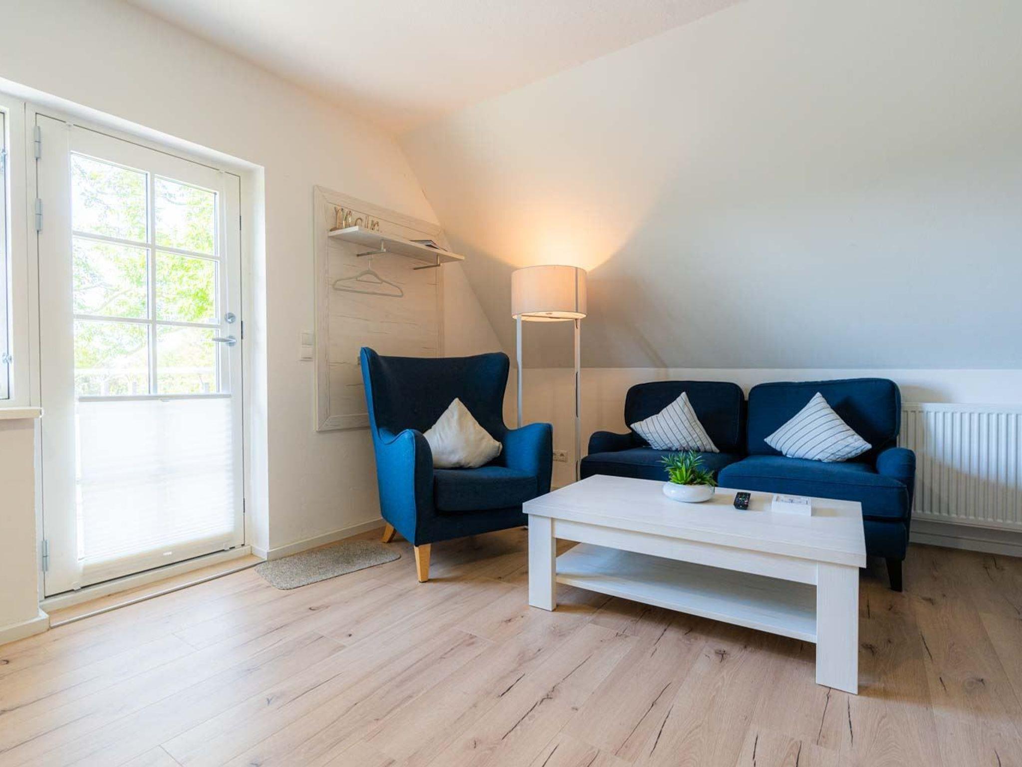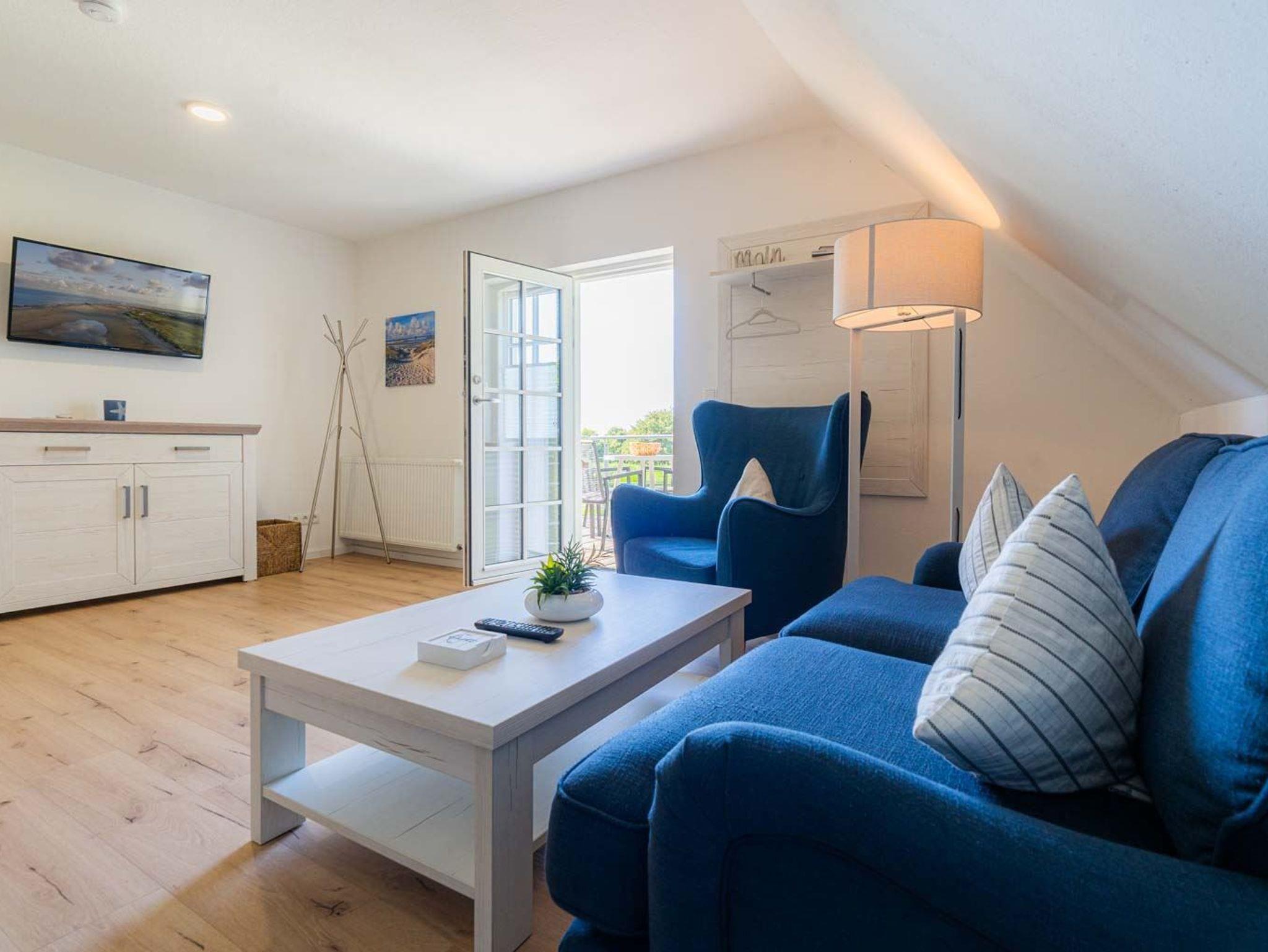 Wohnzimmer mit Sofa, Sessel, SMART-TV und Esstisch mit 4 Stühlen. Offene Küche mit Backofen, Mikrowelle, Geschirrspüler und Kühlschrank (Gefriermöglichkeit im Gemeinschaftsraum). Auf der Außentreppe vor dem Eingang zur Wohnung befindet sich ein möblierter Anbaubalkon mit herrlichem Ausblick nach Westen.