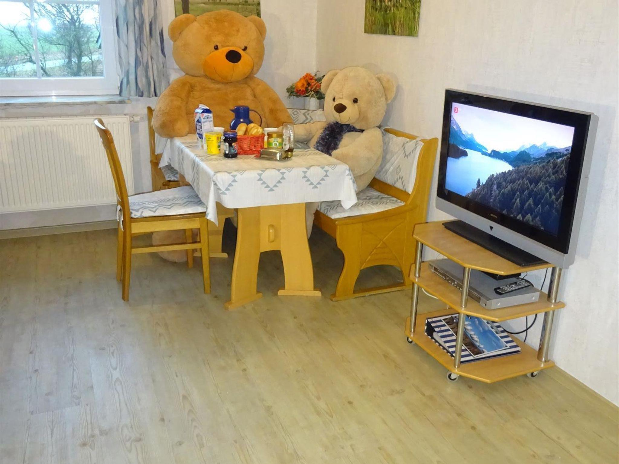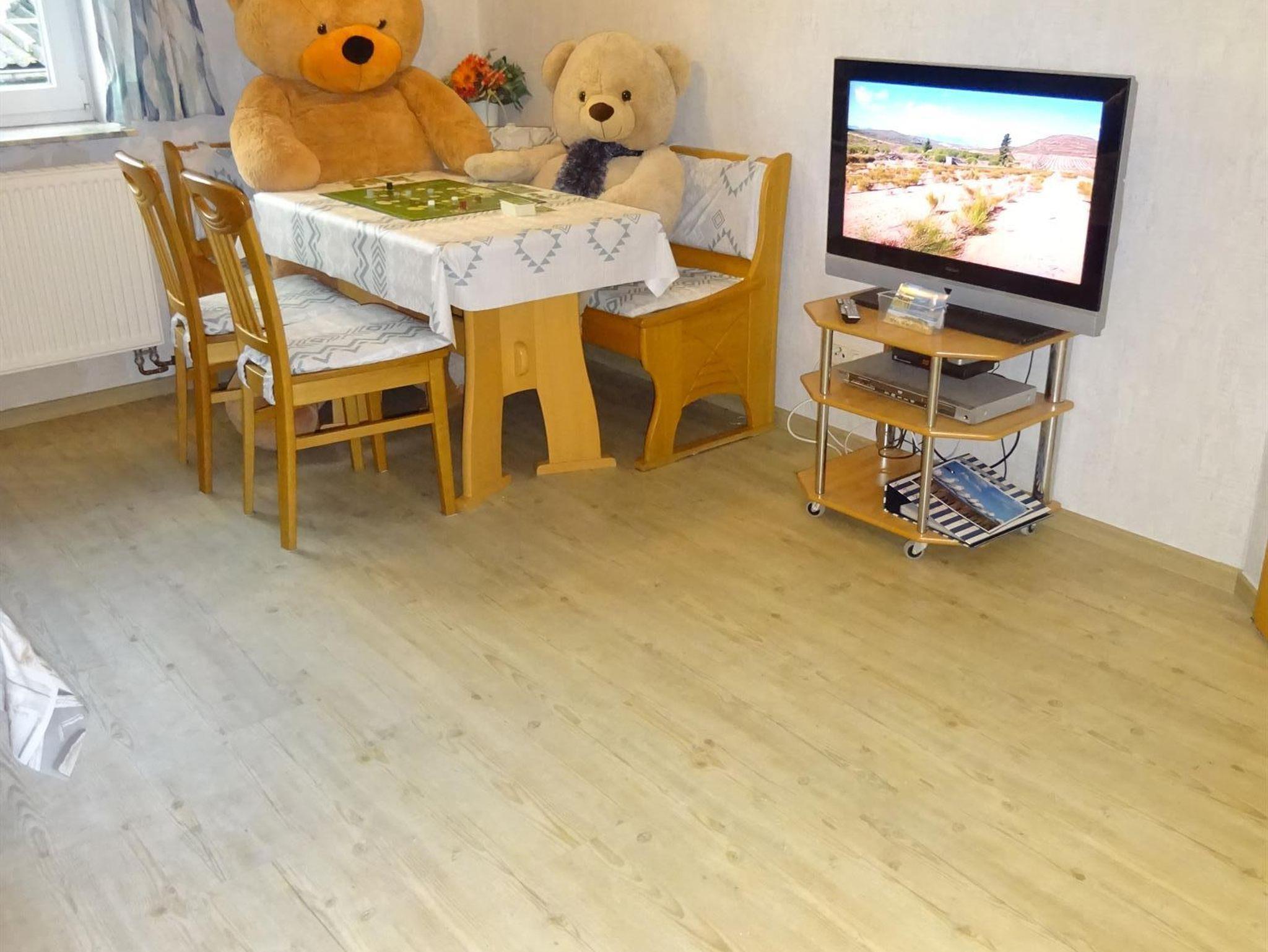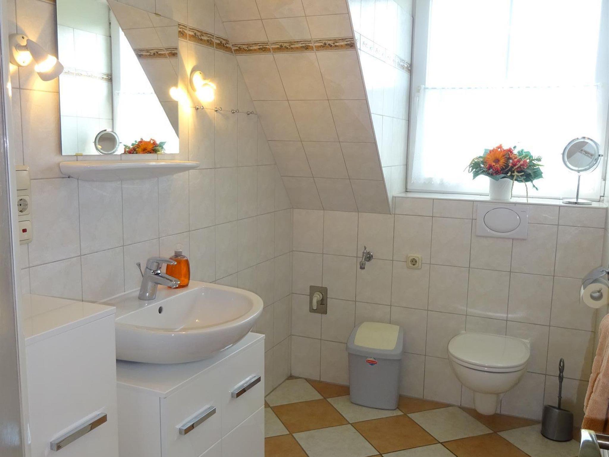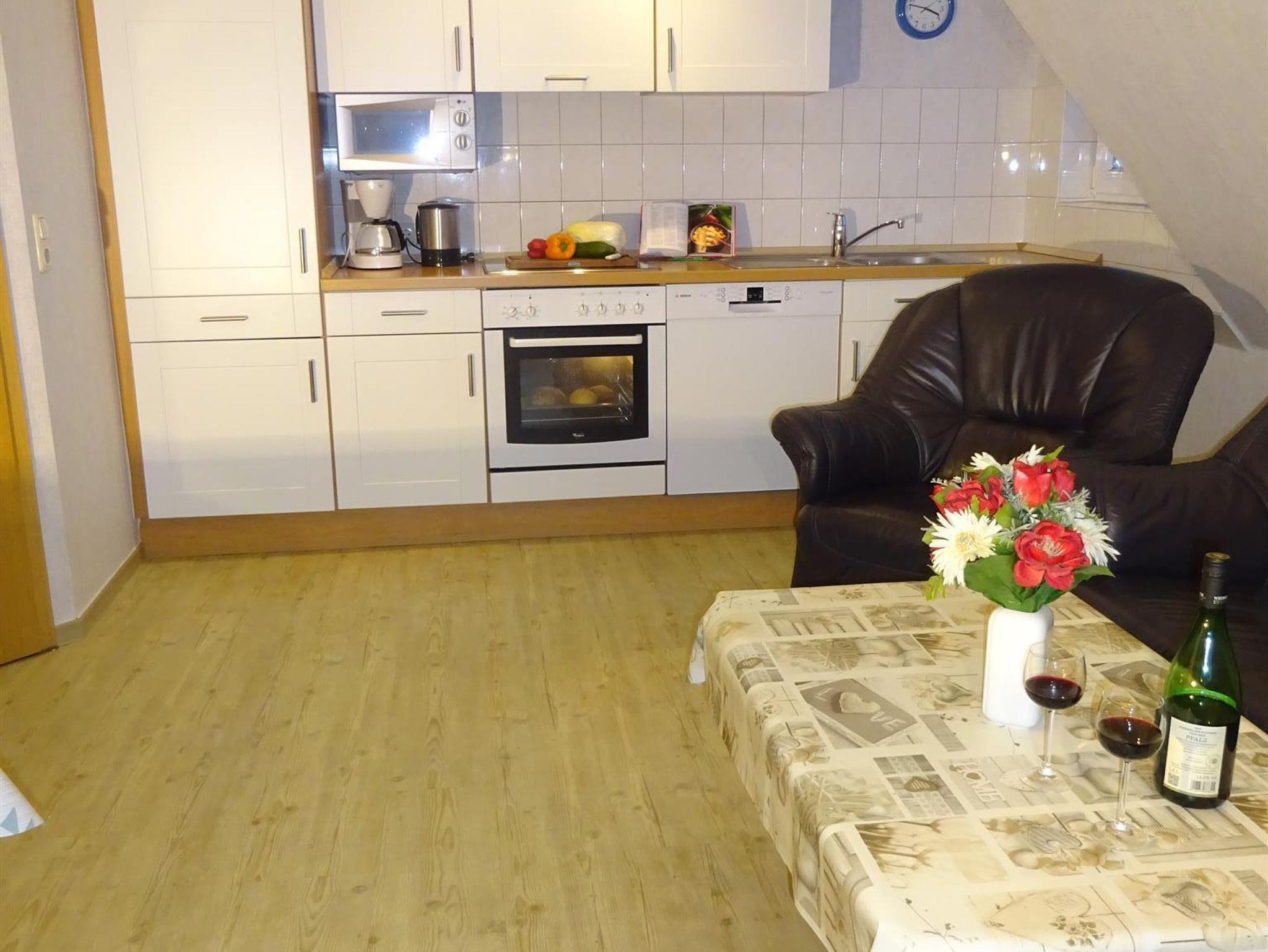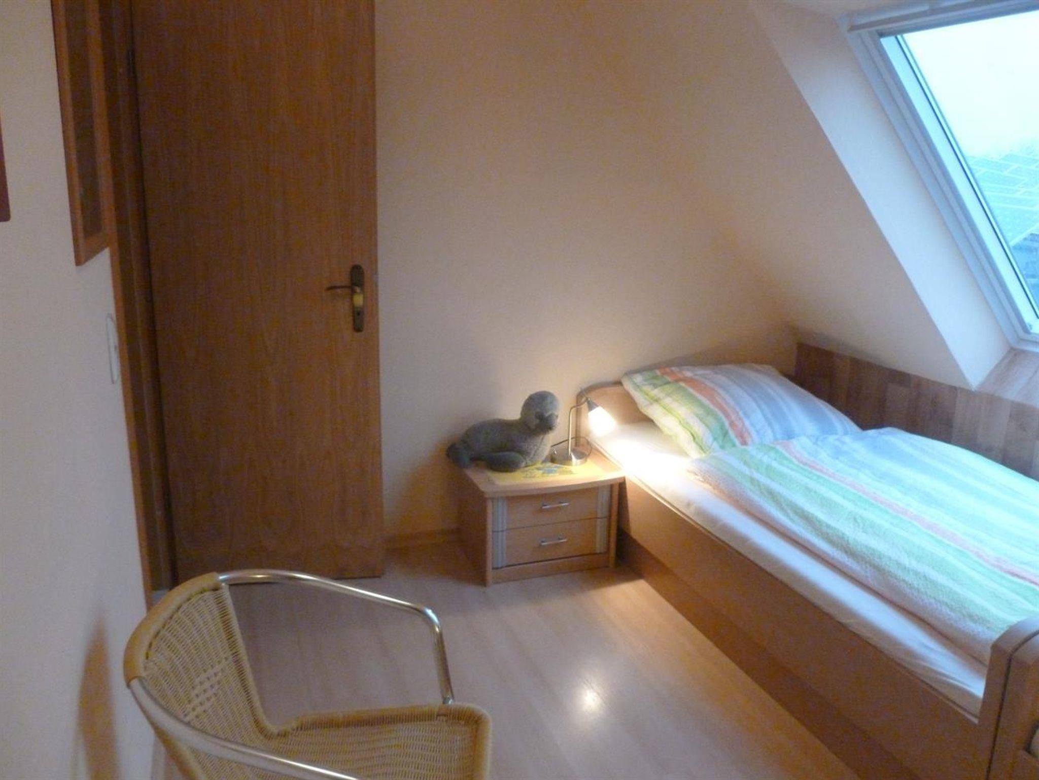 Die 55 qm große Dachgeschosswohnung hat einen separaten Eingang und besteht aus einer Wohnküche mit Sitz- und Essecke. Sie ist ausgestattet mit einem Sat-Farbfernseher und DVD-Player sowie einem Radio mit CD-Player.Die Küchenzeile im Wohnbereich ist komplett eingerichtet u.a. mit Geschirrspüler, Mikrowelle und Backofen. 1 Schlafzimmer mit Doppelbett und 1 Schlafzimmer mit 2 Einzelbetten sorgen für eine erholsame Nacht. Die Wohnung verfügt über ein Bad mit Dusche/WC und einen Flur. Zusätzlich steht auf der gleichen Etage ein Abstellraum zur Verfügung. Die Wohnung hat keinen Teppichboden. Auf Wunsch können Kinderbett u. -hochstuhl sowie Allergikerbettwäsche kostenlos gestellt werden. Die Endreinigung ist inkl.