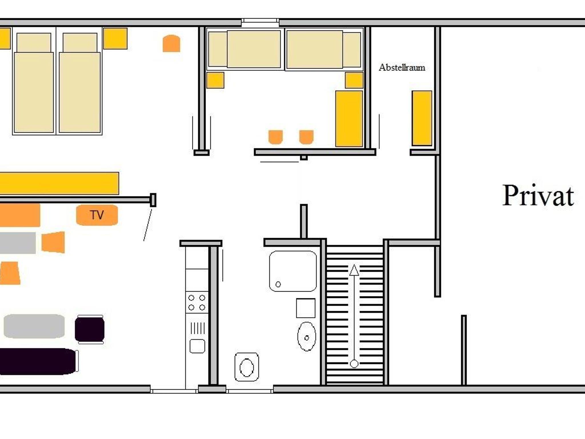 Im Dachgeschoss wohnen Sie in einer 55 qm großen Ferienwohnung mit 2 Schlafräumen mit Verdunklungsrollos, einer Wohnküche, Dusche/WC, Flur und Abstellraum.