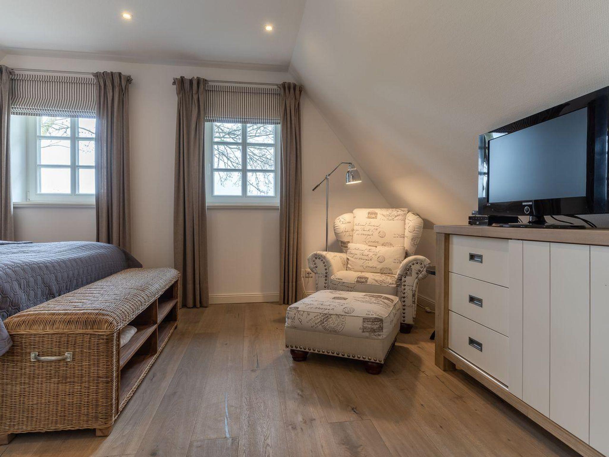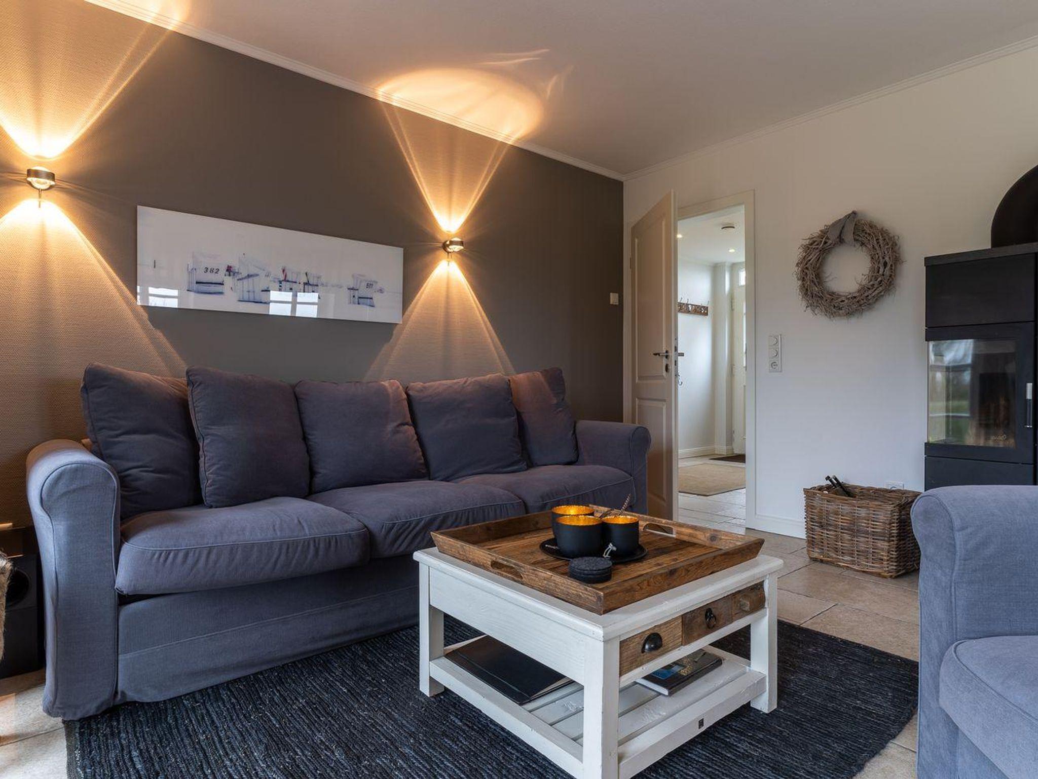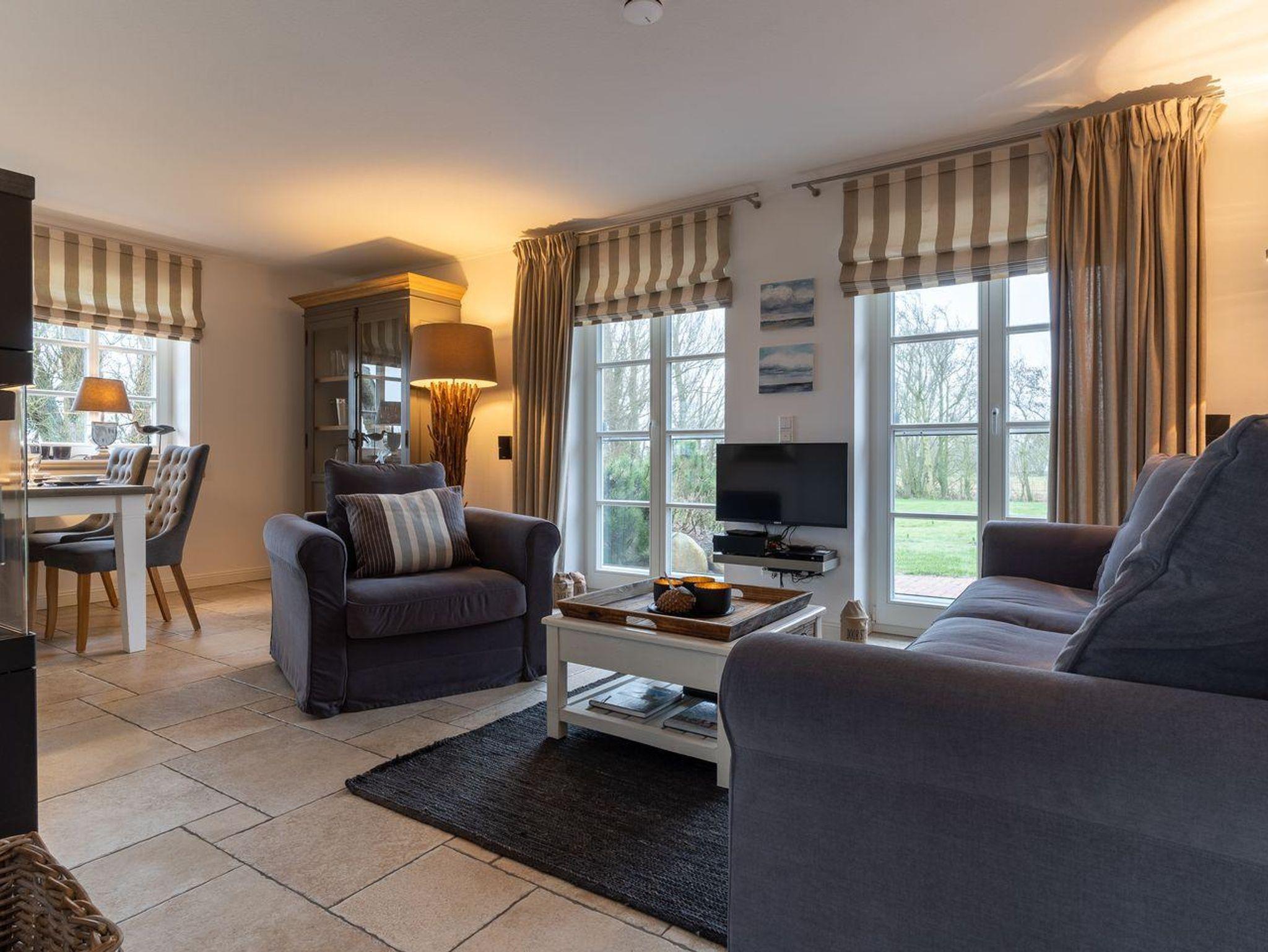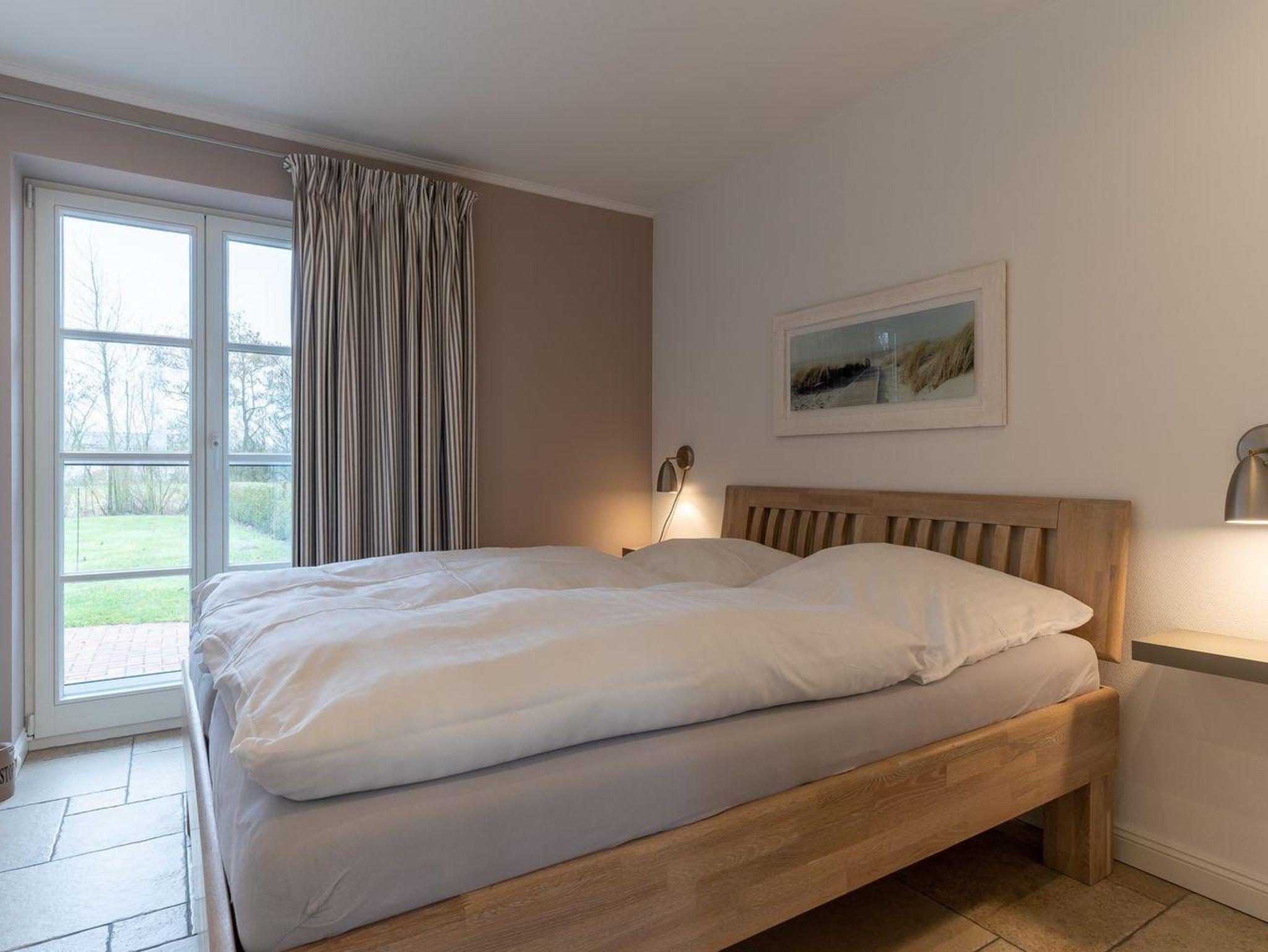 Eine Haushälfte unter Reet, ca. 100 m² Wohnfläche auf 2 Ebenen, auf großzügigem Grundstück mit ca. 1.200 m² und Terrasse. Im EG befinden sich ein Duschbad mit barrierefreier Dusche und WC, ein Schlafzimmer mit einem 1,60 x 2 m Doppelbett, das gemütliche Wohn/Esszimmer mit Kaminofen, offener, hochwertiger Küche sowie einem Wirtschaftsraum mit Waschtrockner. Im OG befinden sich das großzügige Elternschlafzimmer mit Boxspringbett 1,80 x 2 m und einem Einbauschrank, ein Kinderzimmer mit zwei Einzelbetten 1 x 2 m plus Einbauschrank sowie einem Duschbad mit Komfortdusche, Doppelwaschbecken und Handtuchheizung und WC. Im gesamten Haus liegt eine Fußbodenheizung, im EG unter Fliesen im OG unter weiß gekalkten Eichendielen.