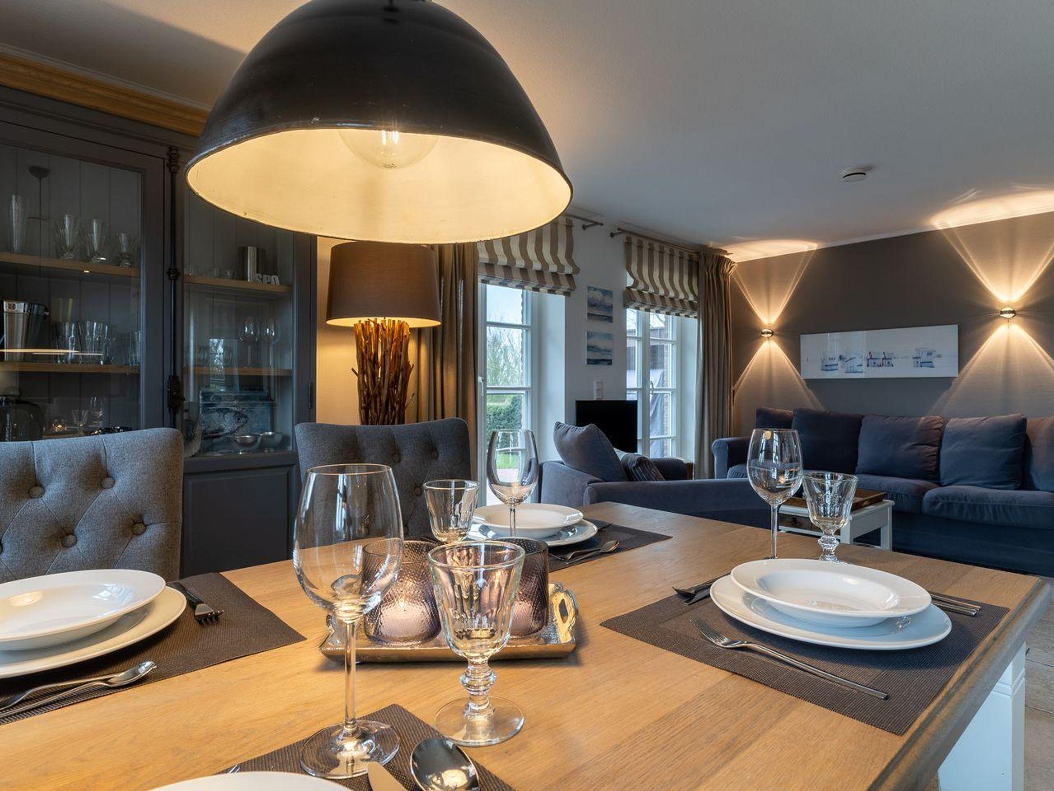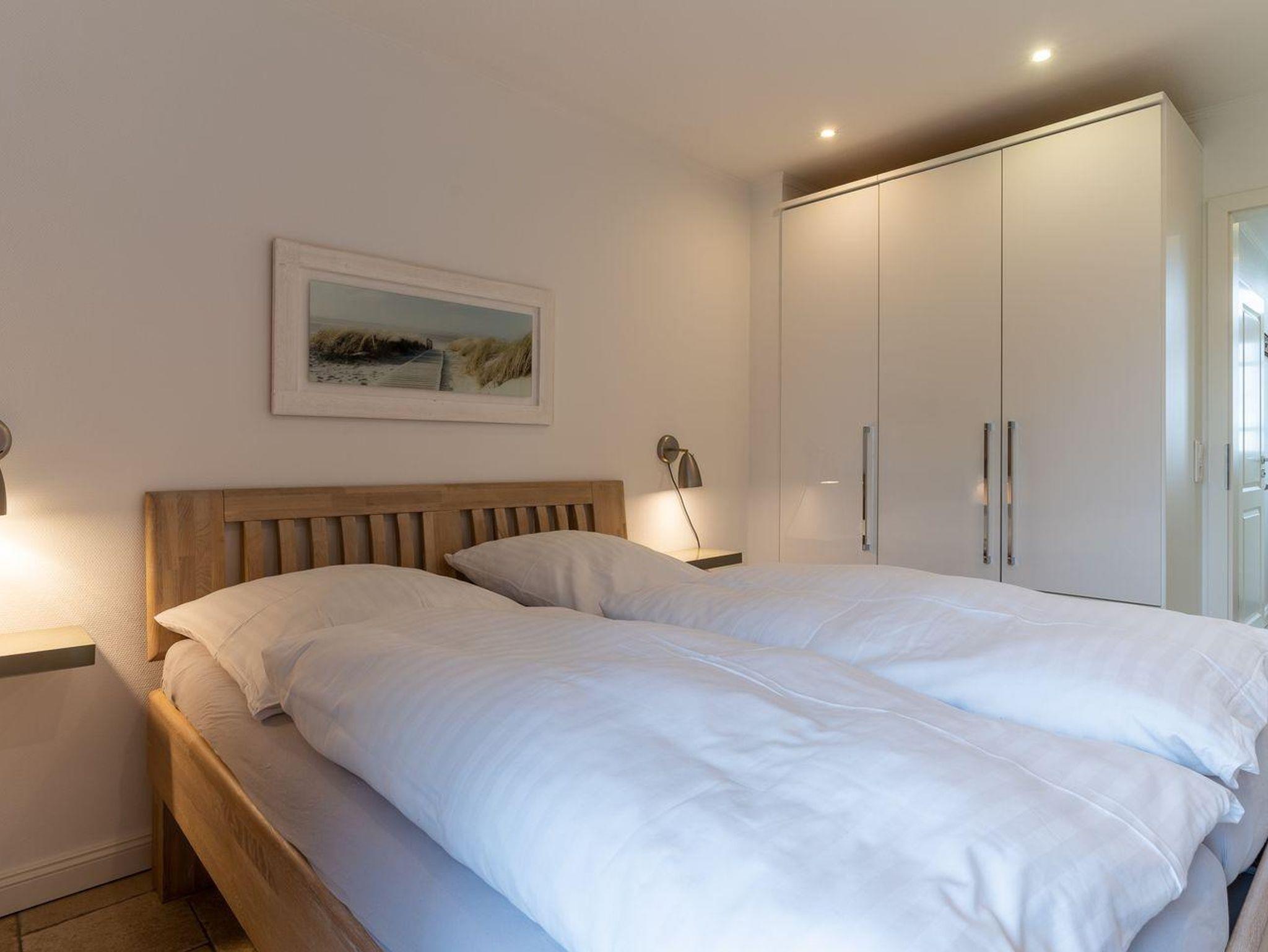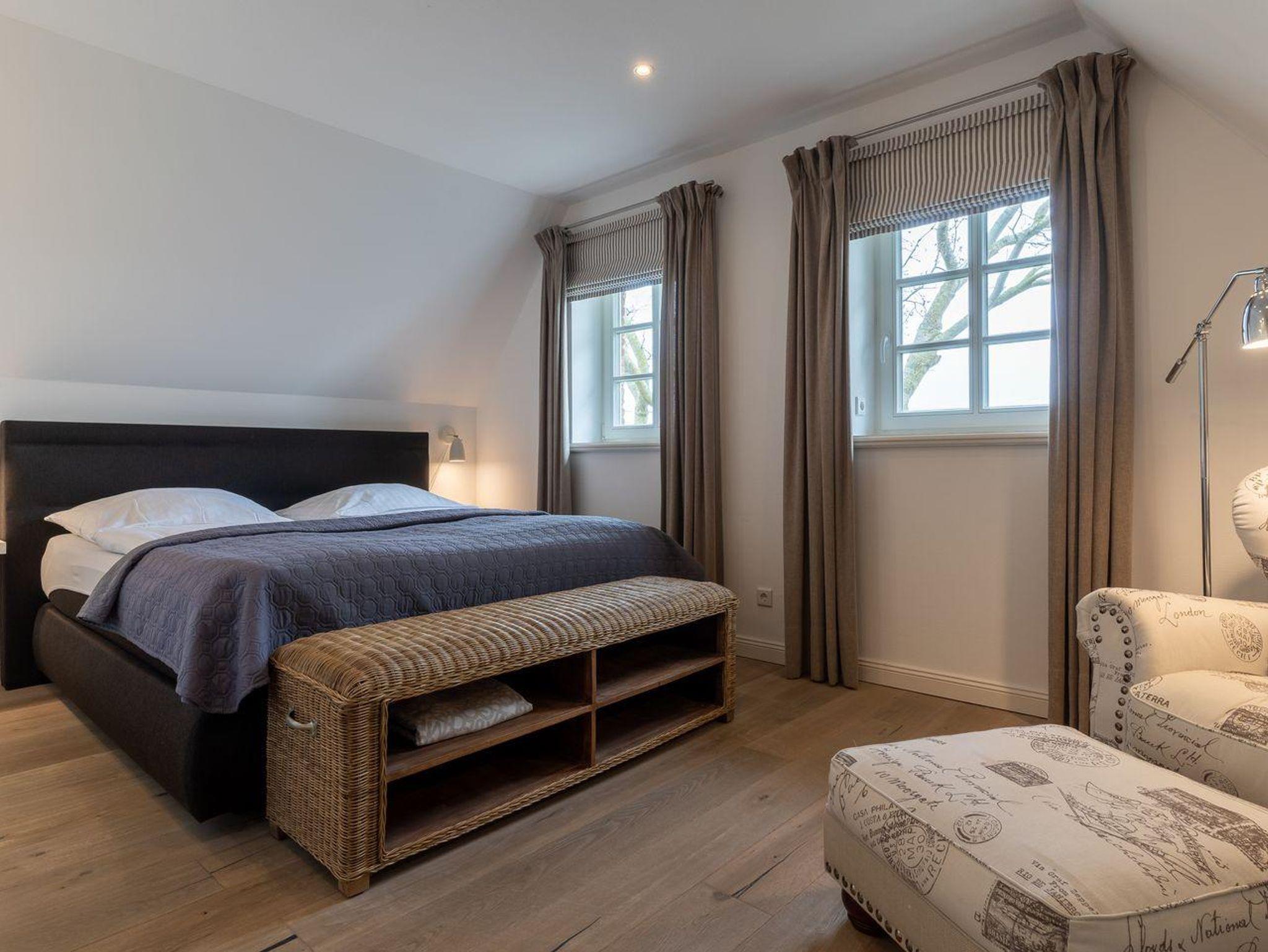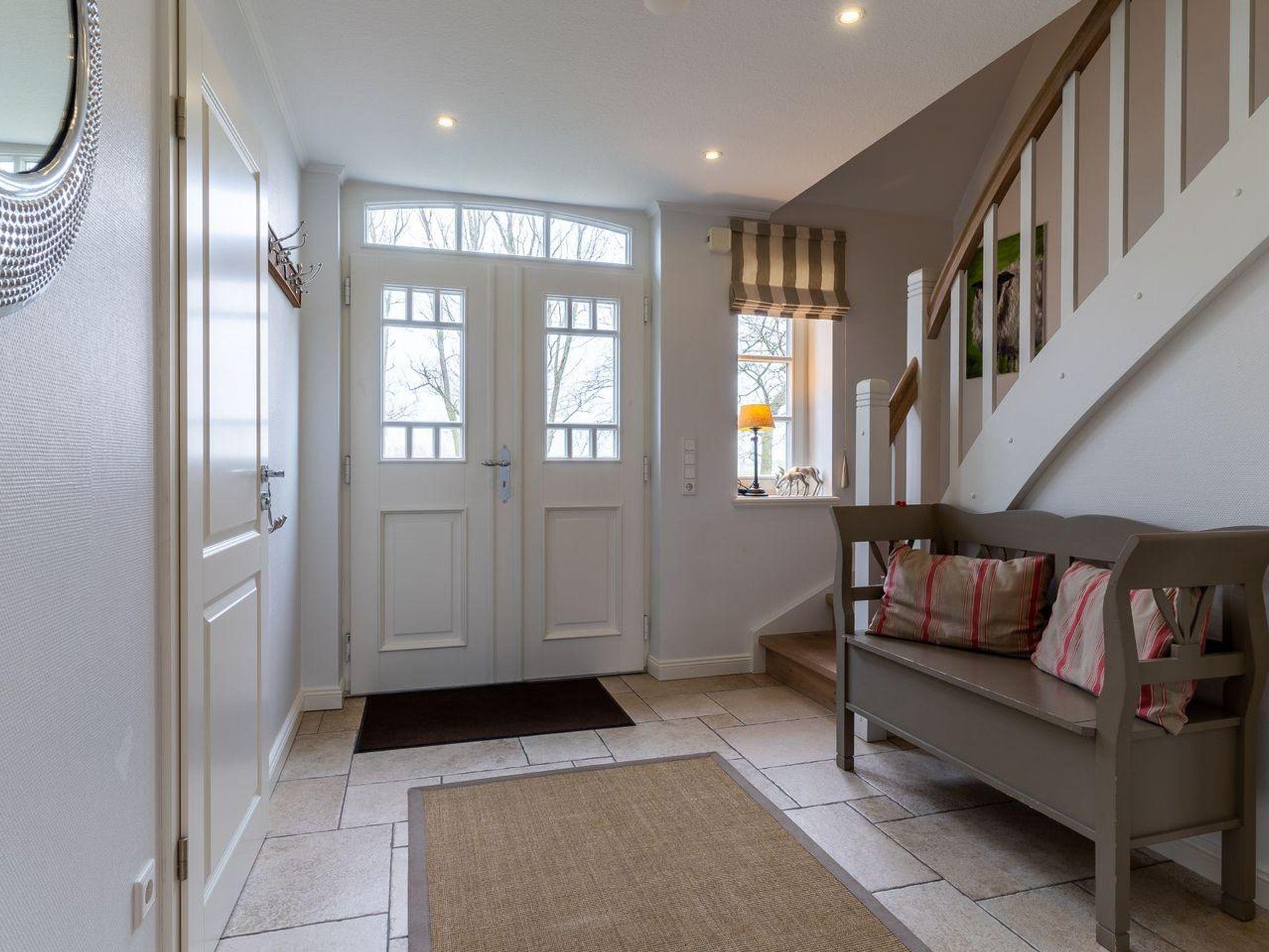 Eine Haushälfte unter Reet, ca. 100 m² Wohnfläche auf 2 Ebenen, auf großzügigem Grundstück mit ca. 1.200 m² und Terrasse. Im EG befinden sich ein Duschbad mit barrierefreier Dusche und WC, ein Schlafzimmer mit einem 1,60 x 2 m Doppelbett, das gemütliche Wohn/Esszimmer mit Kaminofen, offener, hochwertiger Küche sowie einem Wirtschaftsraum mit Waschtrockner. Im OG befinden sich das großzügige Elternschlafzimmer mit Boxspringbett 1,80 x 2 m und einem Einbauschrank, ein Kinderzimmer mit zwei Einzelbetten 1 x 2 m plus Einbauschrank sowie einem Duschbad mit Komfortdusche, Doppelwaschbecken und Handtuchheizung und WC. Im gesamten Haus liegt eine Fußbodenheizung, im EG unter Fliesen im OG unter weiß gekalkten Eichendielen.
