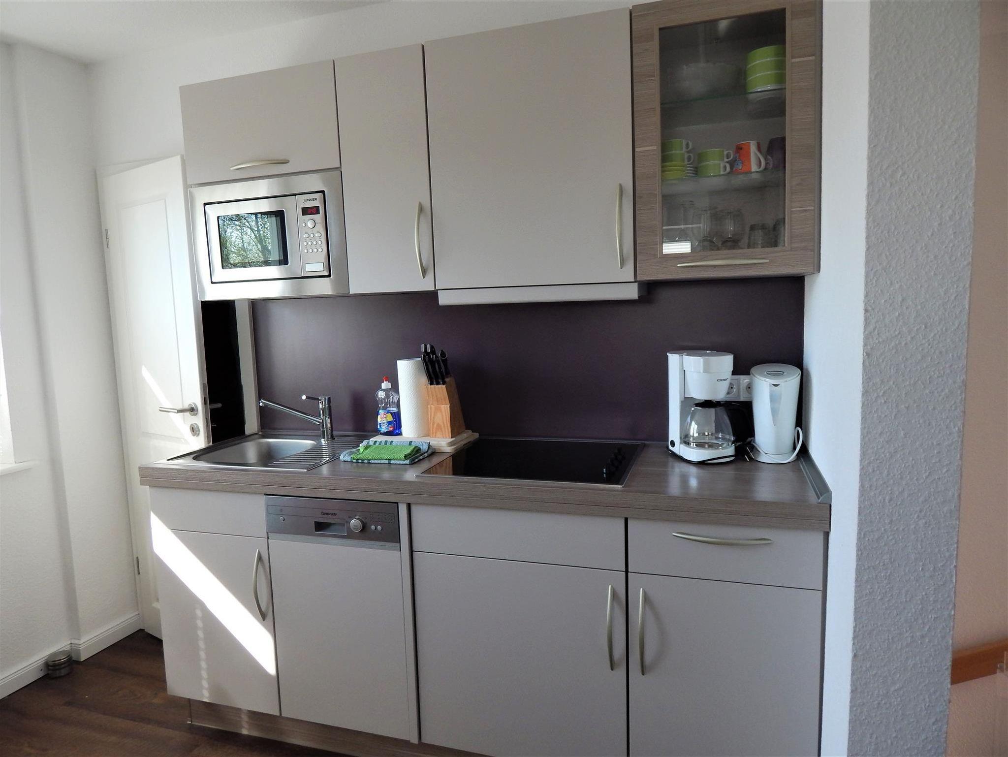 In der vorhandenen Einbauküche laden Herd, Mikrowelle und Geschirrspüler zum Kochen ein.