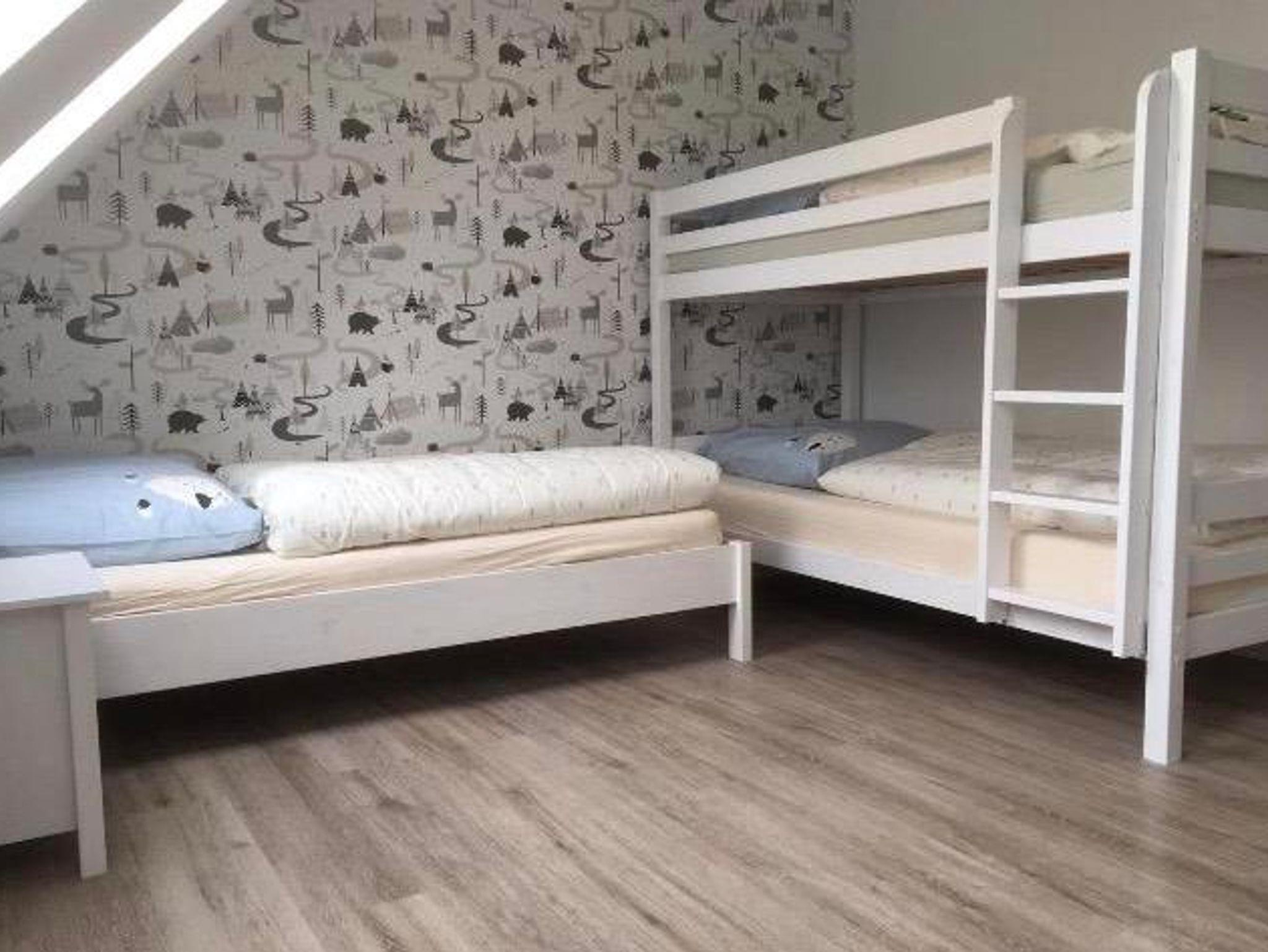 Unsere neu entstandene Obergeschosswohnung hat eine Wohnfläche von ca. 60 qm. Der Wohnraum ist hell, modern und gemütlich eingerichtet. Der Wohn/Essbereich bietet aureichend Platz für die ganze Familie. Das Elternschlafzimmer hat ein Doppelbett (180x200cm). Das Kinderzimmer verfügt über ein Etagenbett und ein Einzelbett. Die vollausgestattete Küche bietet Ihnen alles, was Sie für Ihren Urlaub benötigen u.a. Geschirrspüler, Backofen, Mikrowelle, Kaffeemaschine etc. In der Wohnung befindet sich ein Duschbad mit Handtuchwärmer. Die Wohnung hat direkten Blick über die tollen Panoramafenster und ausklappbaren Mini Balkon in den Garten und Spielplatz. In einem separaten Raum gibt es die Möglichkeit gegen Gebühr zu waschen und zu trocknen.
