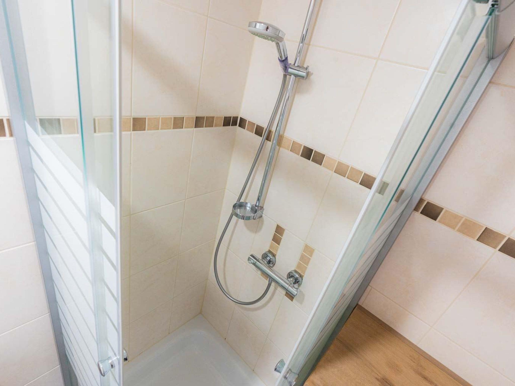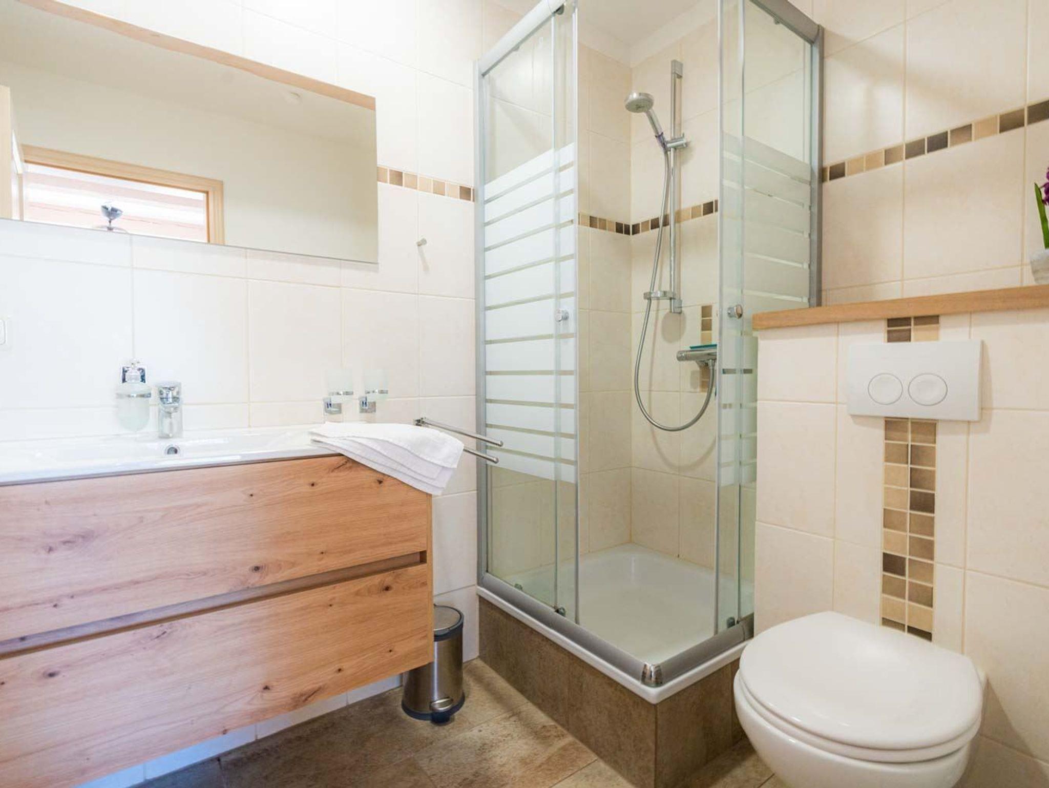 Badezimmer (Duschbad) mit Dusche, WC und Föhn.