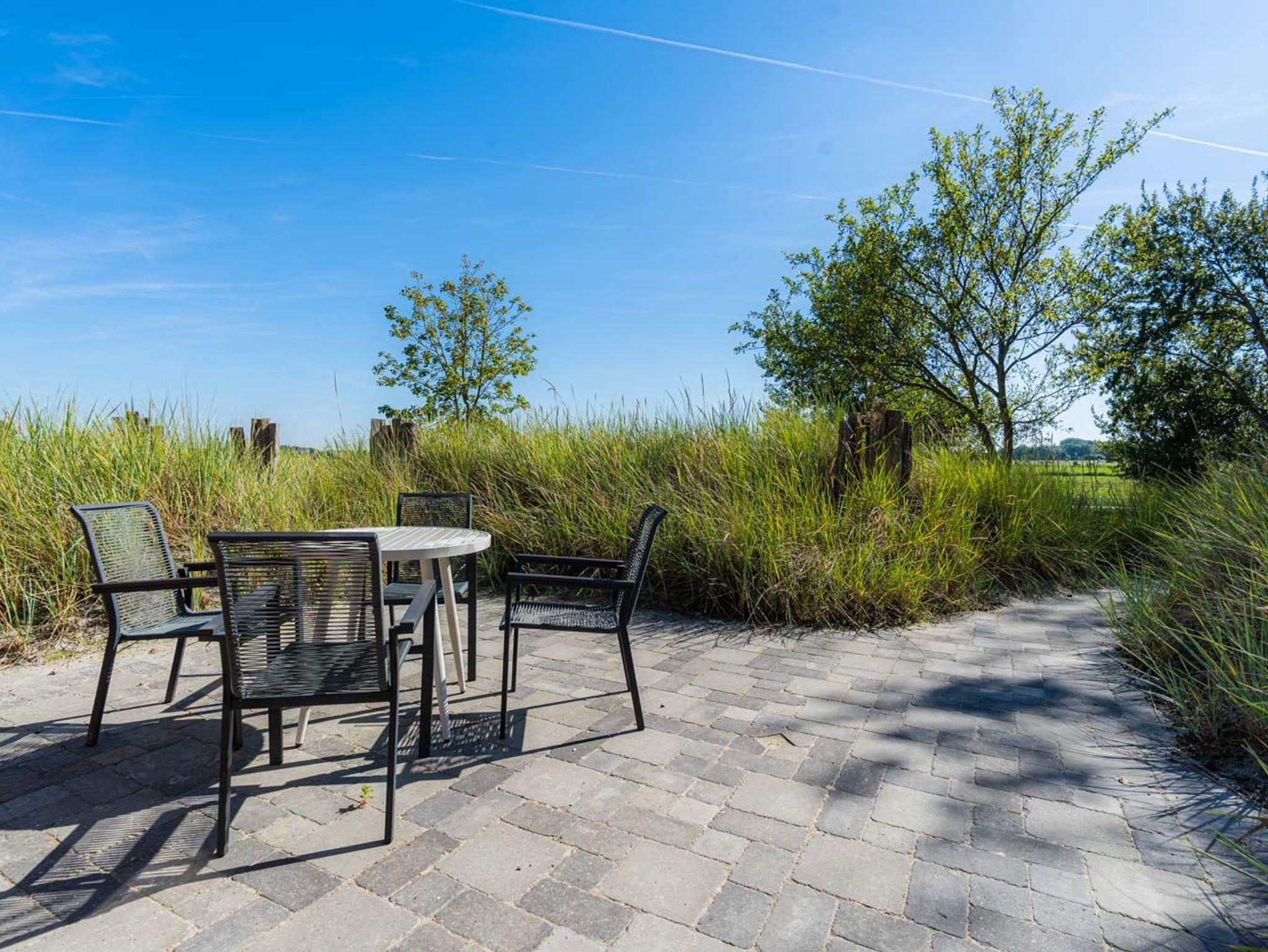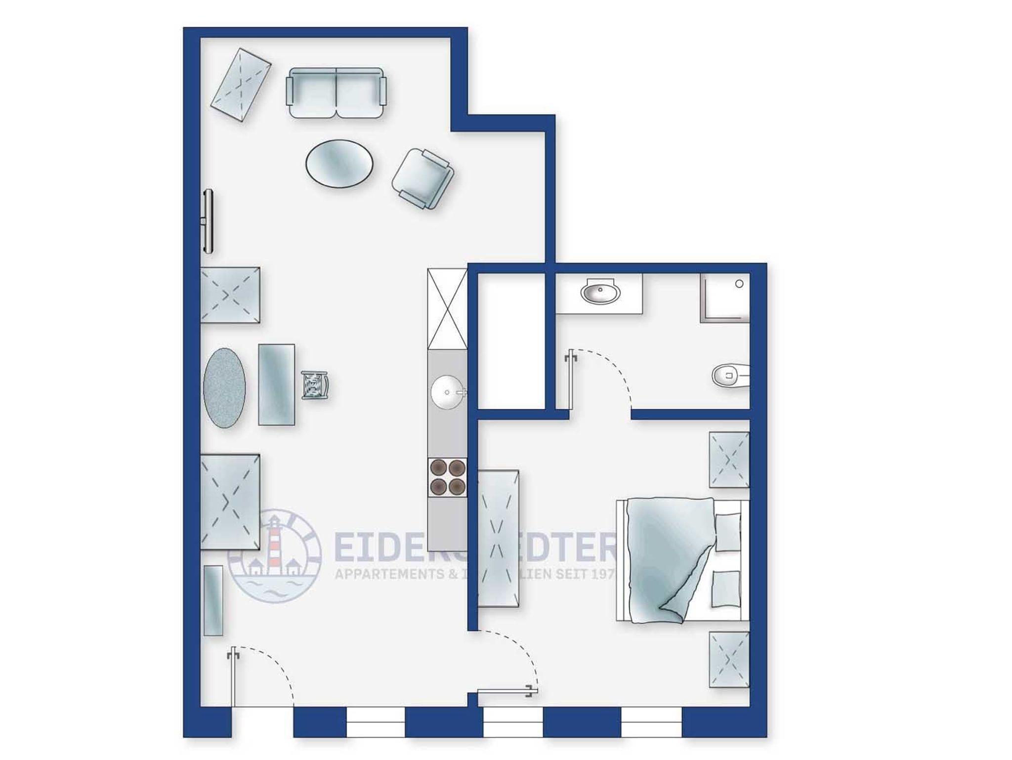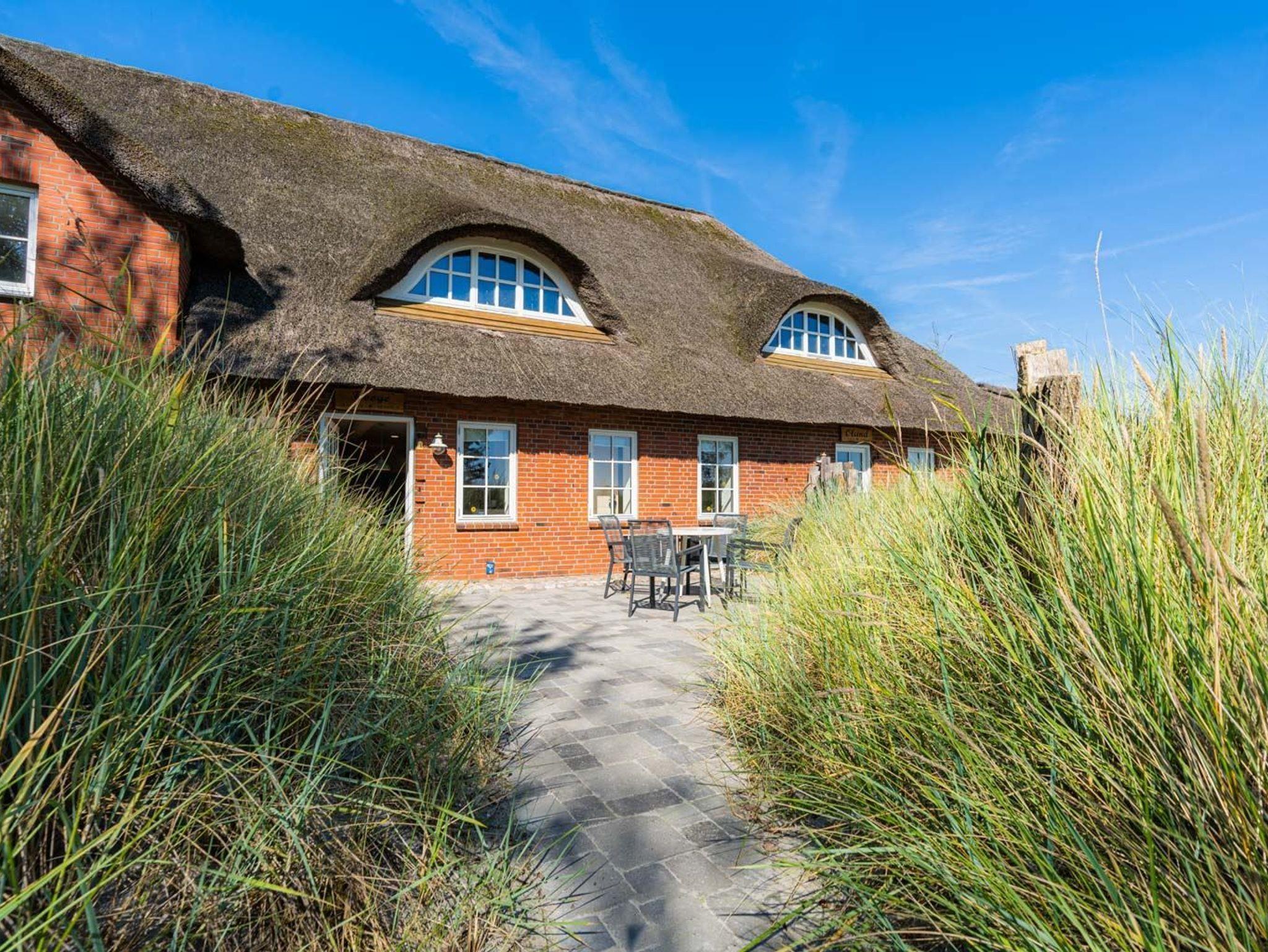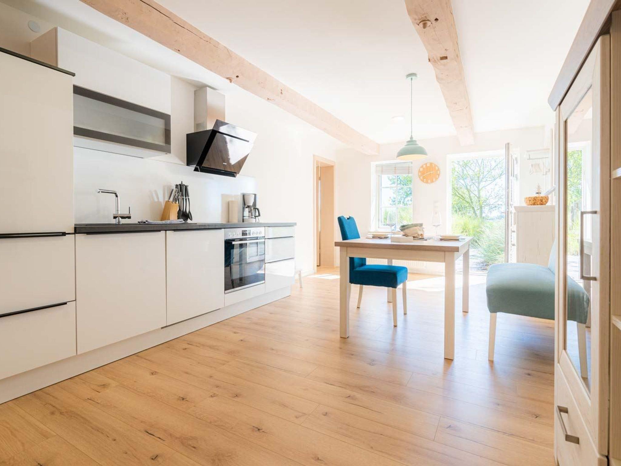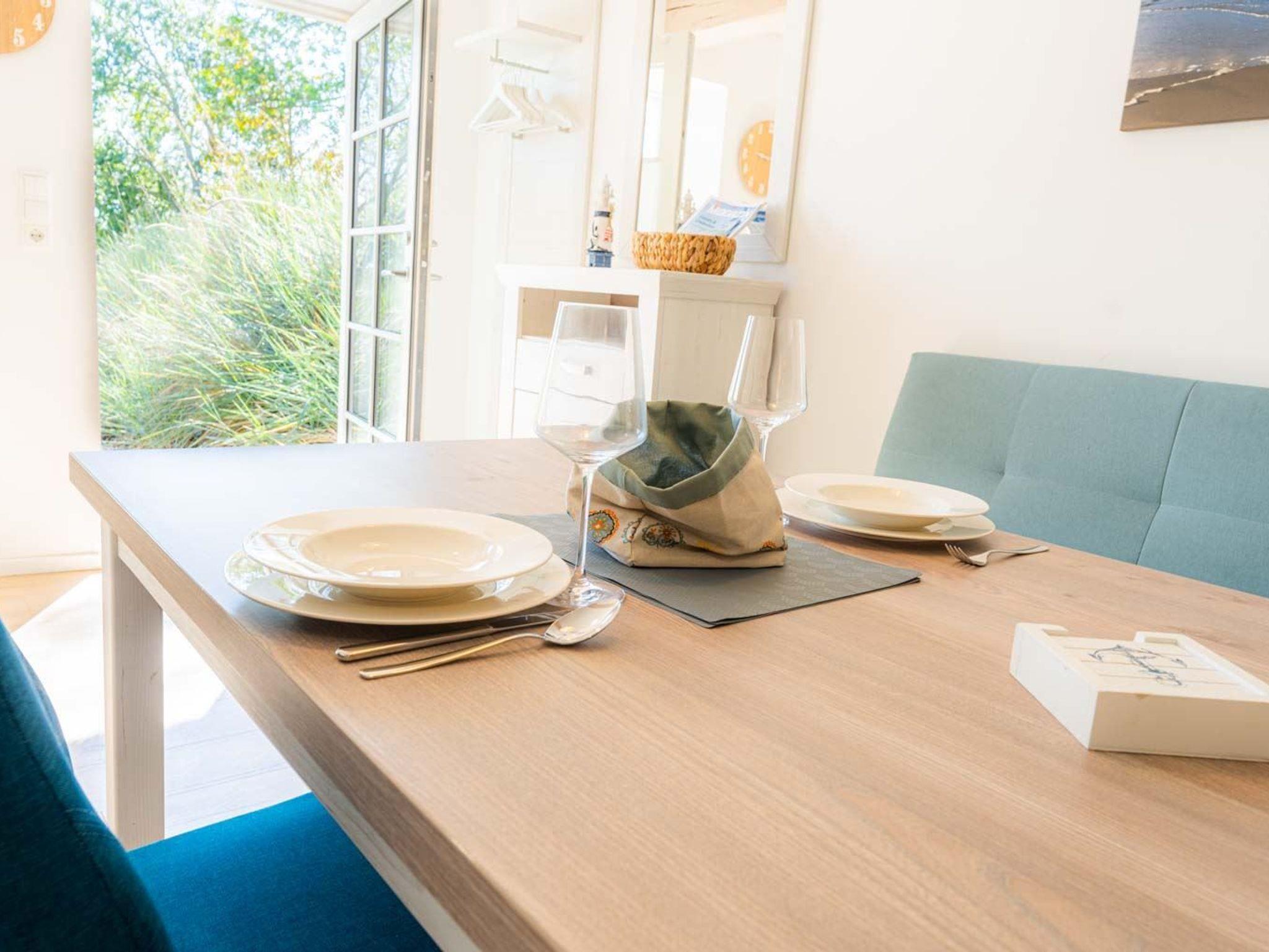 Wohnzimmer mit Sofa, Ohrensessel, SMART-TV und Esstisch mit Sitzbank und einem Stuhl. Offene Küche mit Mikrowelle, Backofen, Geschirrspüler und Kühlschrank (Gefriermöglichkeit im Gemeinschaftsraum). Direkter Zugang zur möblierten Süd-Terrasse mit Dünengras-Wall.
