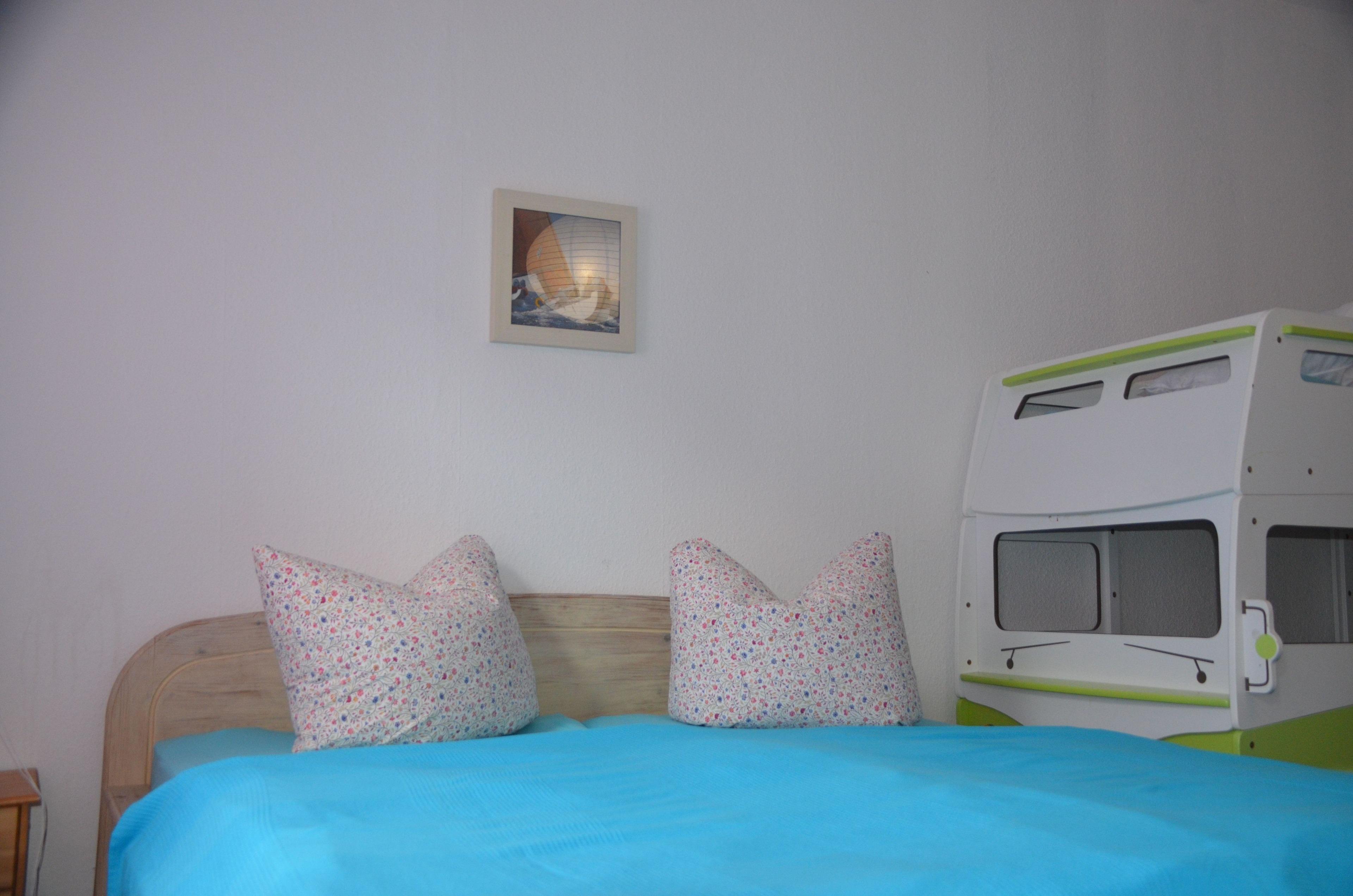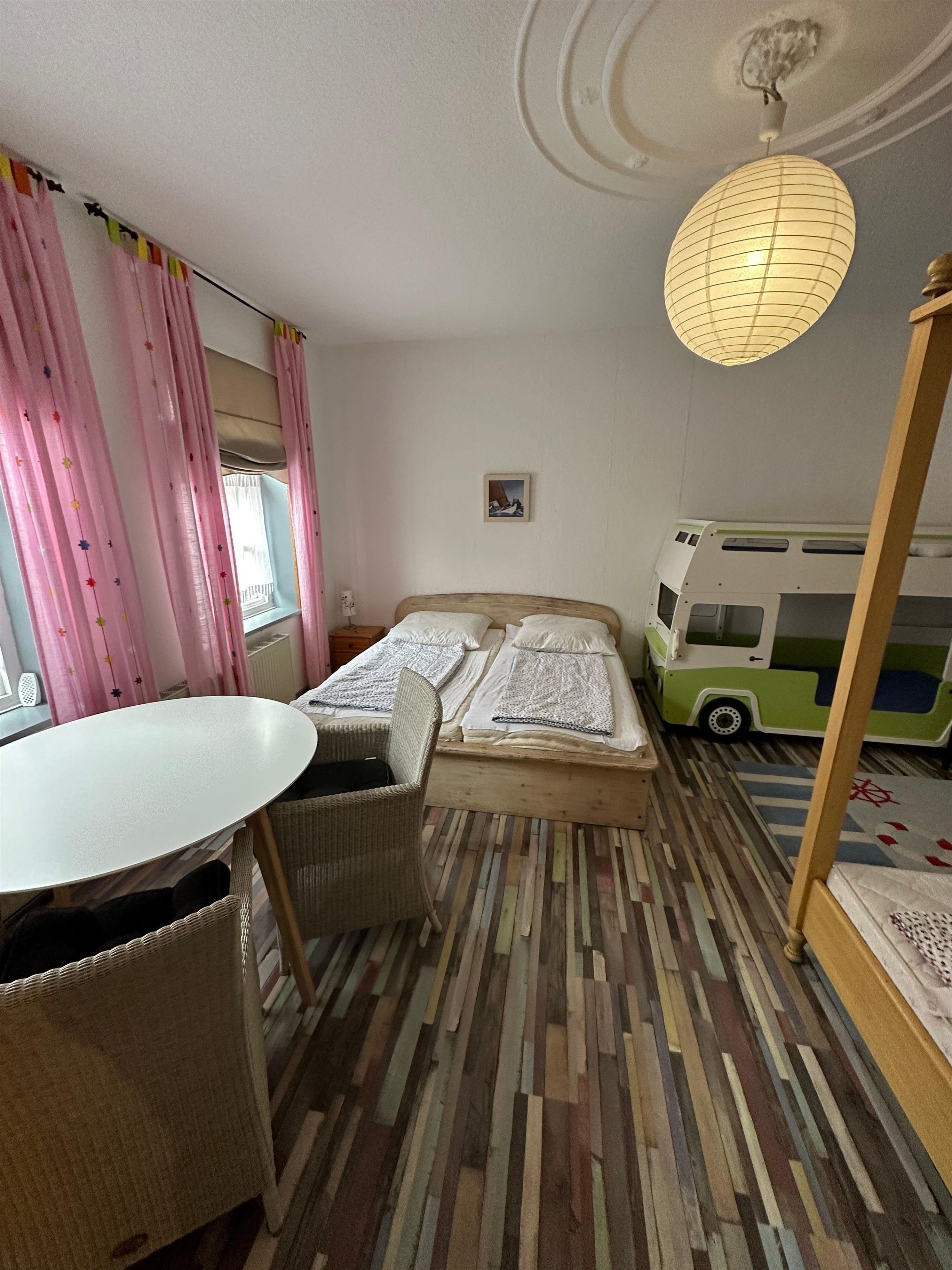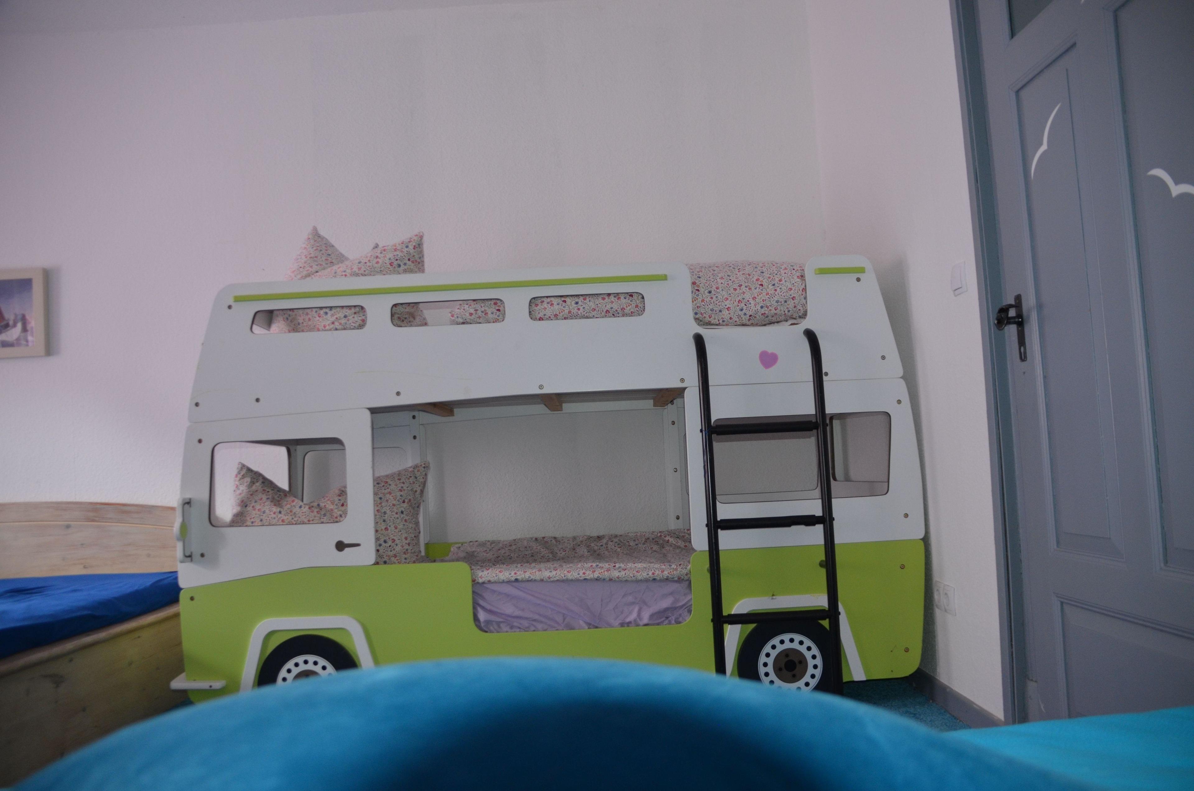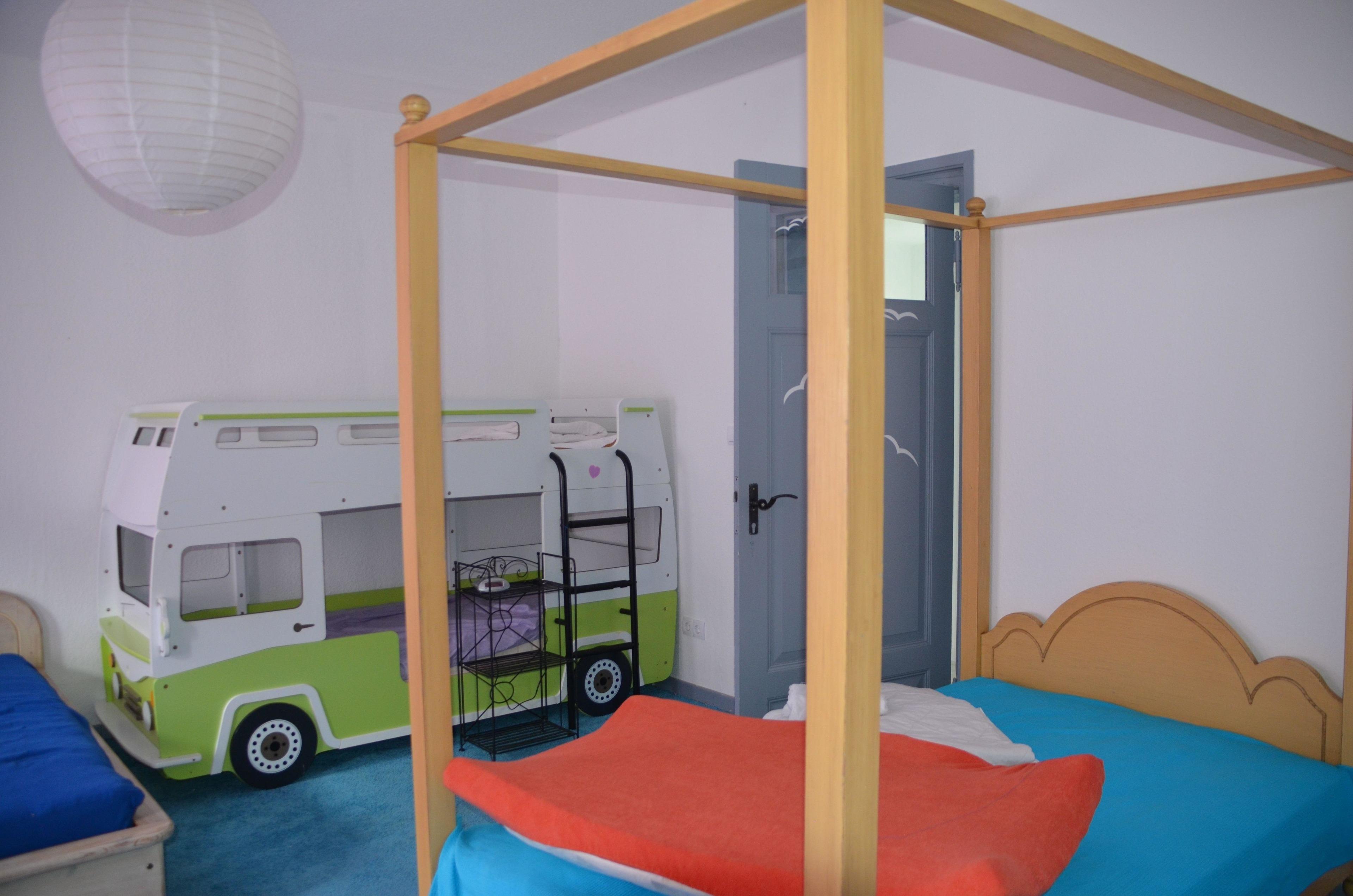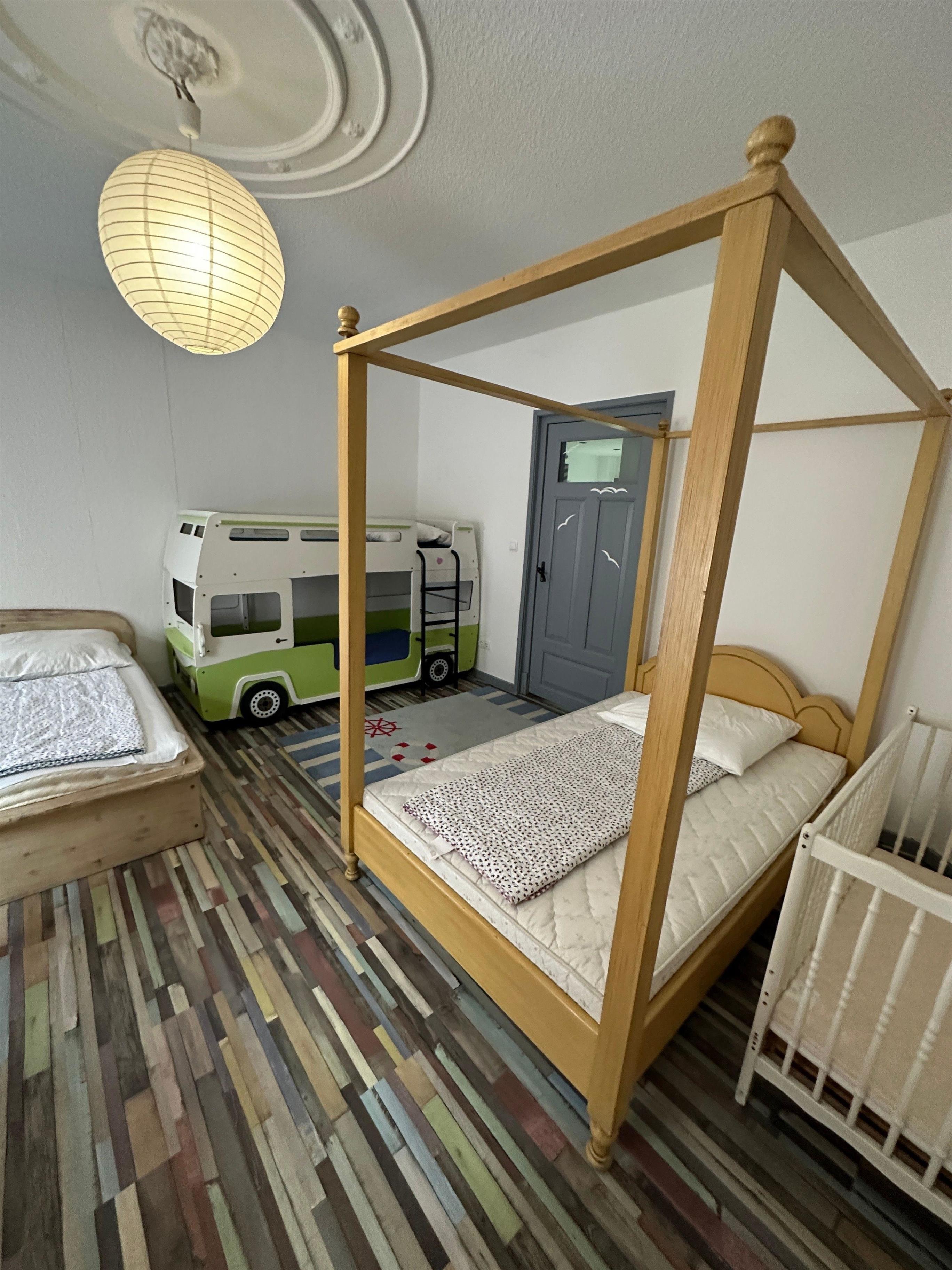 1 kleines Schlafzimmer mit Doppelbett, 1 großes Schlafzimmer / Familienzimmer (1 Doppelbett, 1 großes Himmelbett, feststehendes Kinderbett und 1 Doppelstockbett) mit direktem Zugang zum Bad.