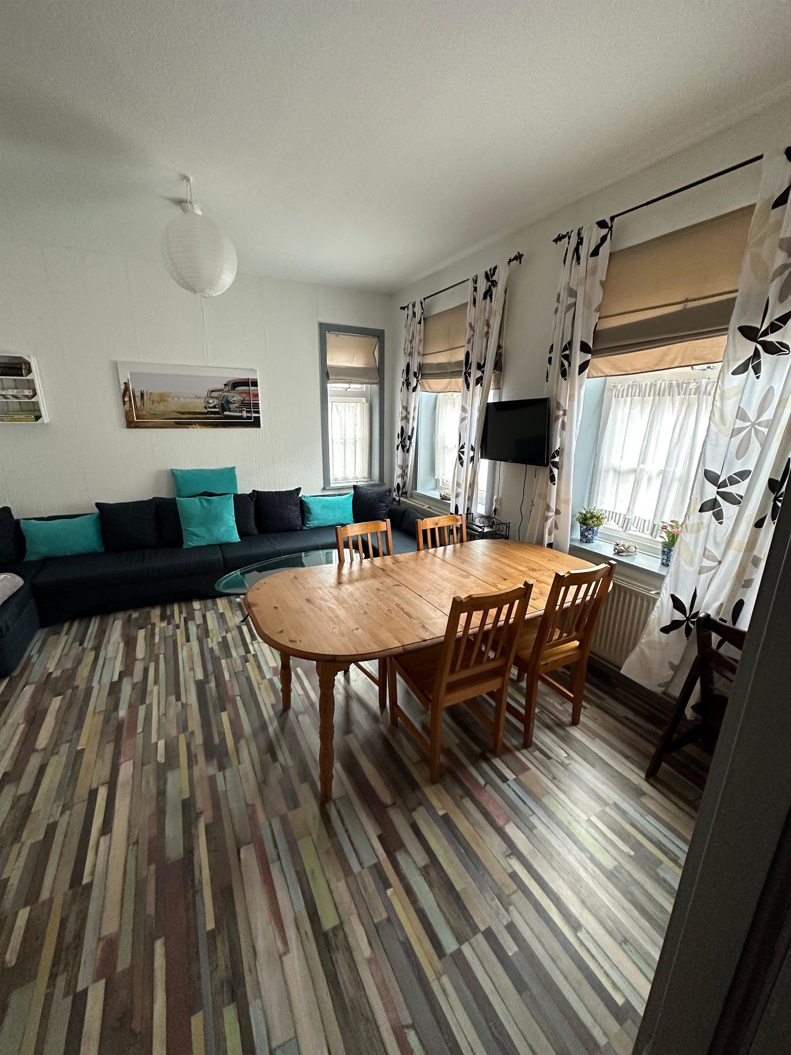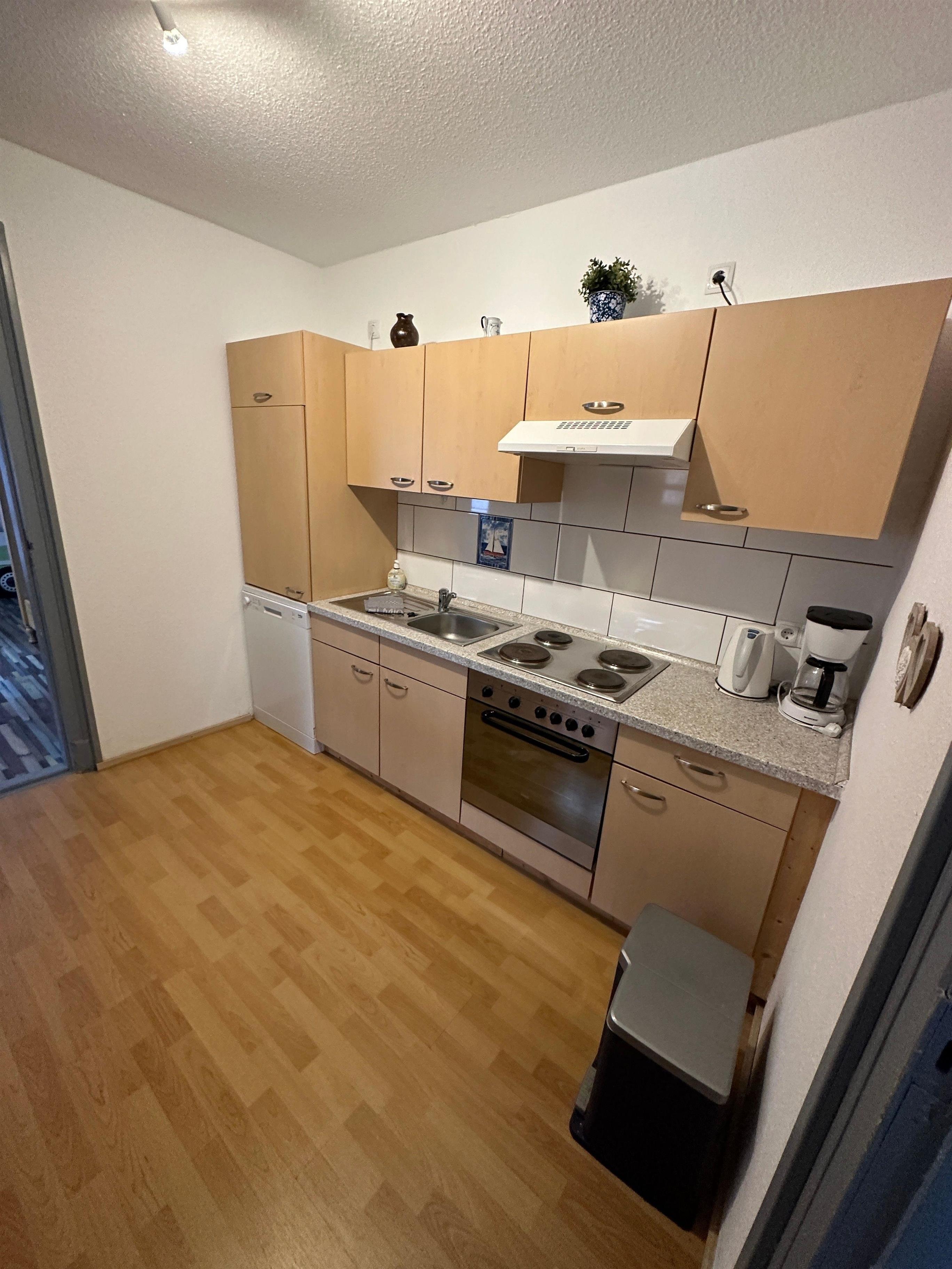 Große voll eingerichtete Küche mit Kühlschrank und Gefriereinheit, Herd mit Backofen, Geschirrspüler. Großes Wohn- und Esszimmer mit TV.