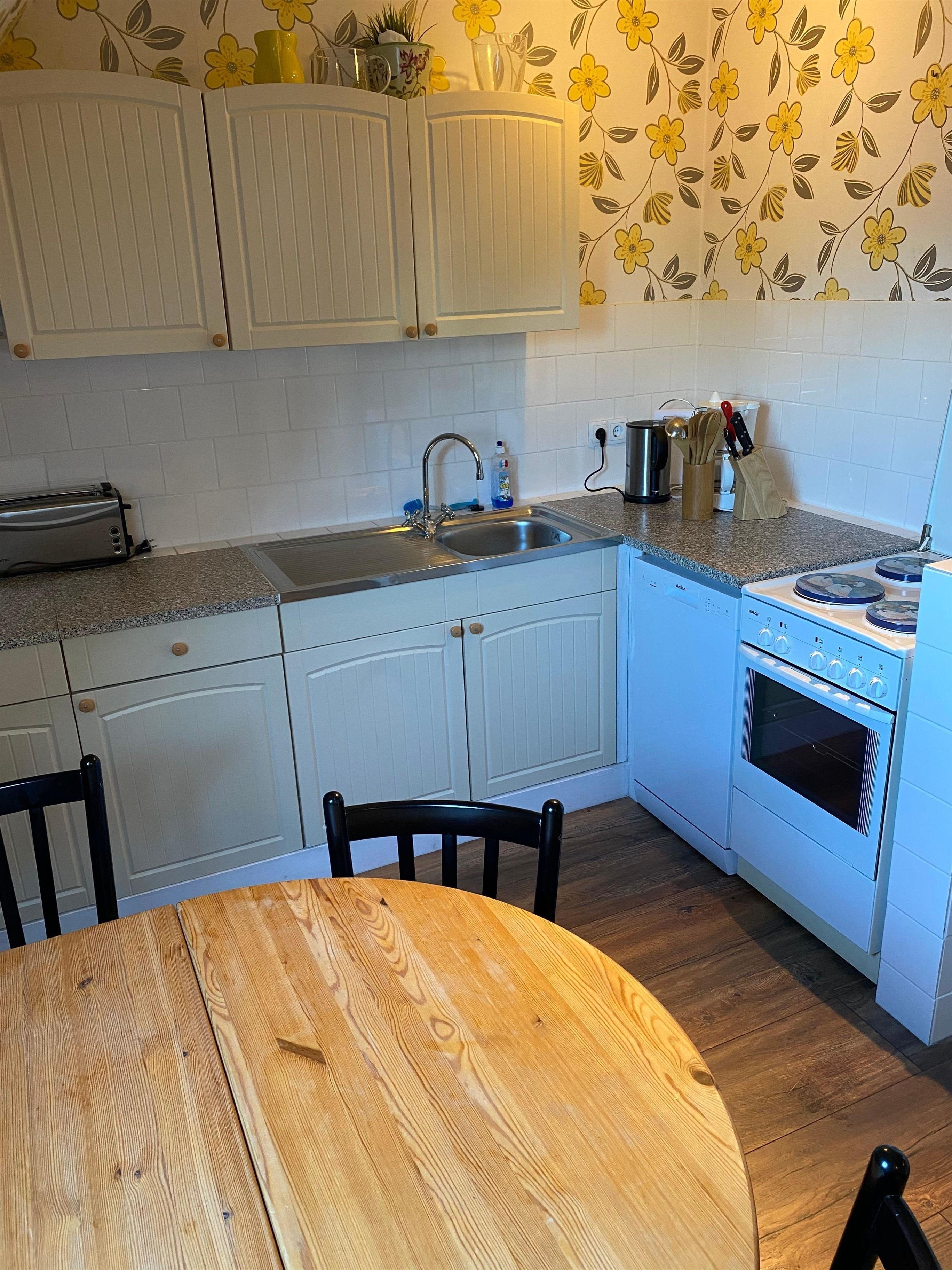 Die Wohnung besteht aus einen Schlafzimmer mit Doppelbett, einer vollausgestatteten Küche mit Herd, Backofen, Geschirrspüler, Herd usw. In dem kombinierten Küche und Wohnraum befindet sich ein weiterer Schlafplatz. Ein weiterer Schlafplatz befindet sich im Durchganszimmer. Das Badezimmer ist mit WC und Badewanne ausgestattet.