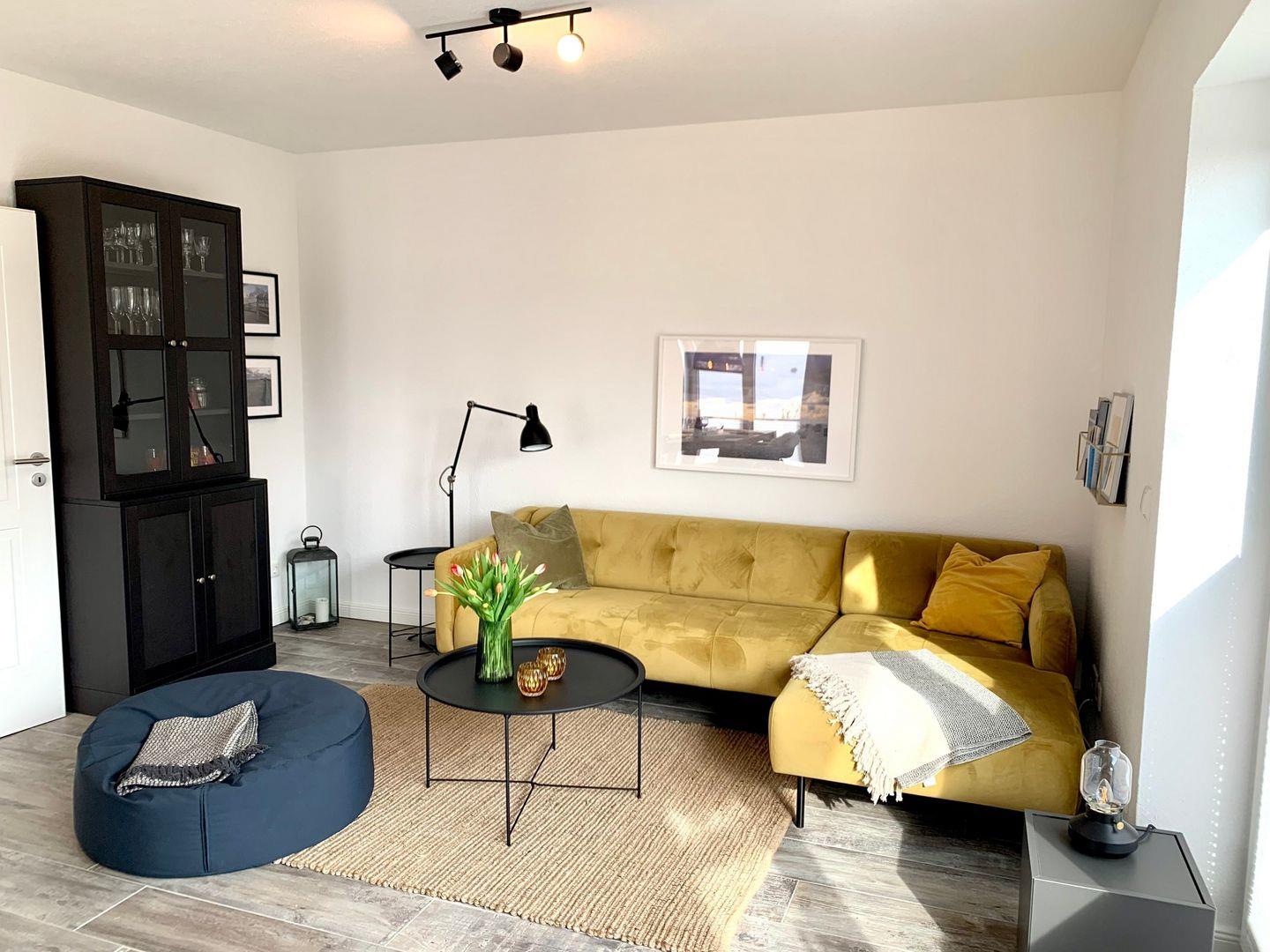 Durch die große Fensterfront und den Übergang zur möblierten Holzterrasse wirkt das charmant eingerichtete Wohnzimmer stets wunderbar hell und freundlich.