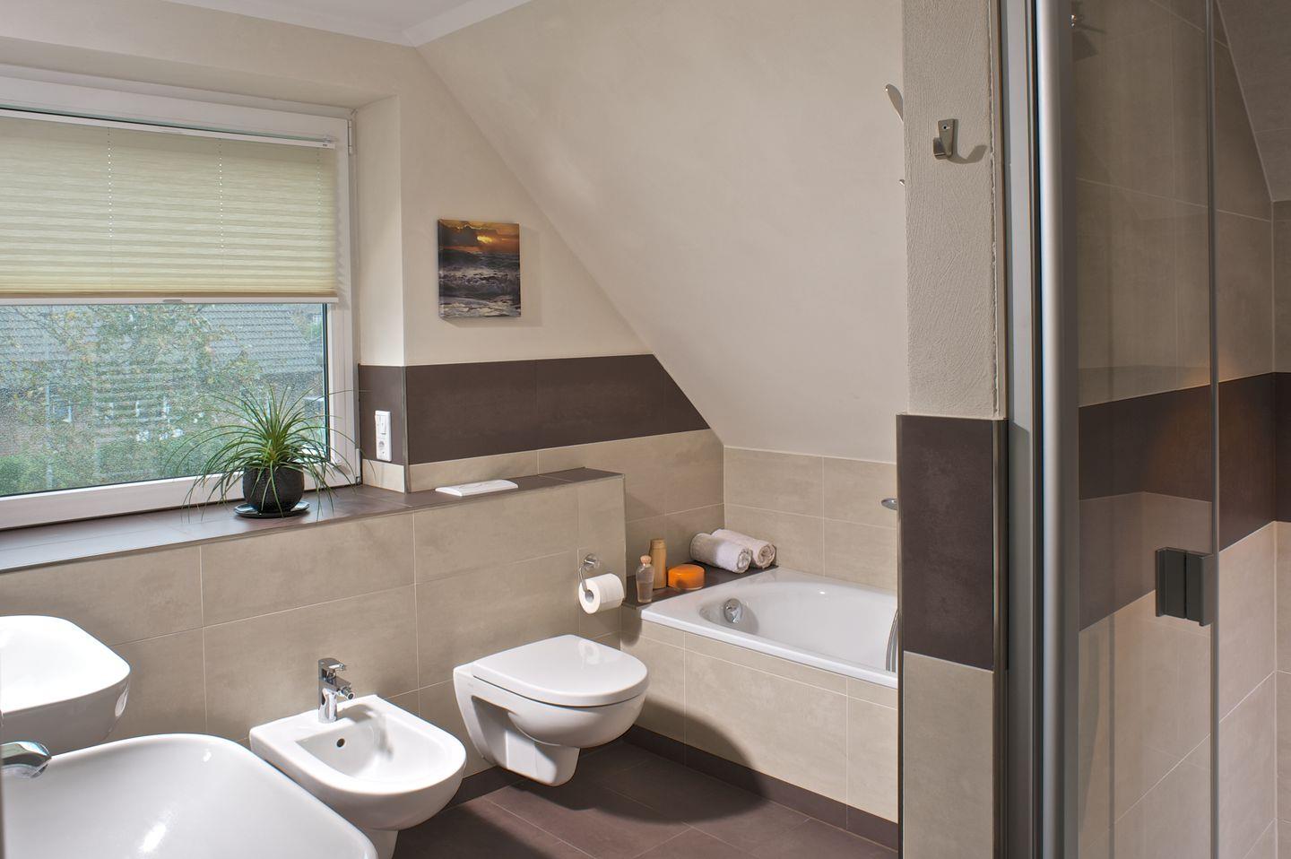 Im Obergeschoss finden sich 3 Schlafzimmer und ein Bad mit Dusche, Wanne, WC und Bidet.