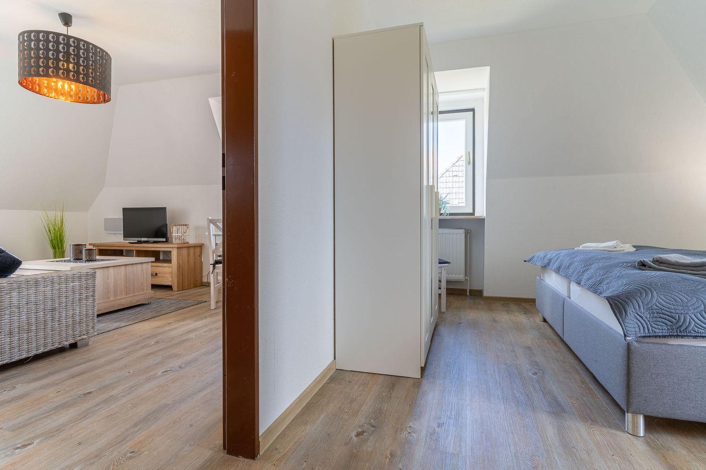 Die 2-Zimmer Wohnung liegt im 1. OG eines Einfamilienhauses in einem ruhigen Wohngebiet in Tating. Mit dem Auto erreichen Sie in nur 5 Minuten den Strand von St.Peter- Ording. Vom kleinen Flur aus gelangen Sie ins Duschbad und ins Schlafzimmer mit einem Doppelbett. Das Schlafzimmer ist ein Durchgangszimmer und von dort aus kommen Sie in den Wohnraum. Im Wohnraum befindet sich ein Schlafsofa, ein Essplatz und der Zugang zum Balkon. Eine kleine Pantryküche mit Backofen ist vorhanden.