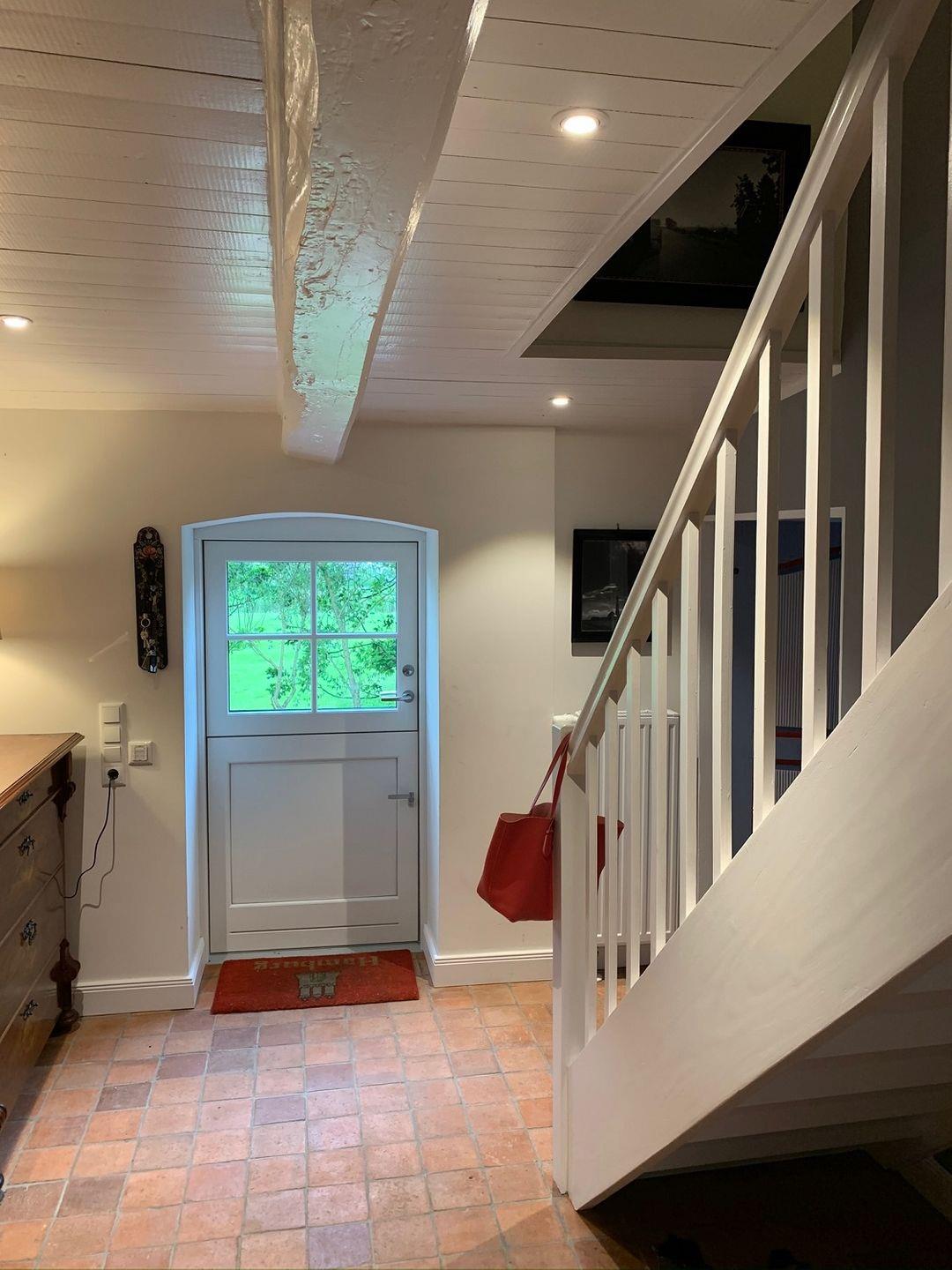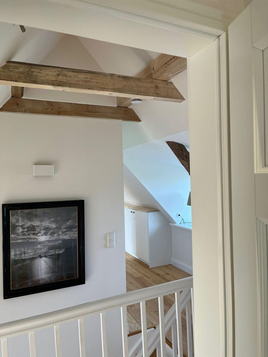 Bis zu 3 Familien passen im großen Wohn-Esszimmer an die lange Tafel. Gemütliche Sofas vor dem großen Kaminofen laden ein zum Gespräch, ein Buch zu lesen oder ins Kaminfeuer zu schauen. Behaglichkeit pur! Ein Blick aus den dänischen Holzfenstern auf die umliegende Landschaft mit Kühen, Schafen und Lämmern lässt die Seele einen Gang runter schalten. In den Wohn- und Schlafzimmern wurde klassischer Dielenboden verlegt. Die Küche lässt das Herz eines Hobby-Kochs höher schlagen und ist mit einem extragroßen Herd, Spülmaschine und vielen Utensilien ausgestattet.