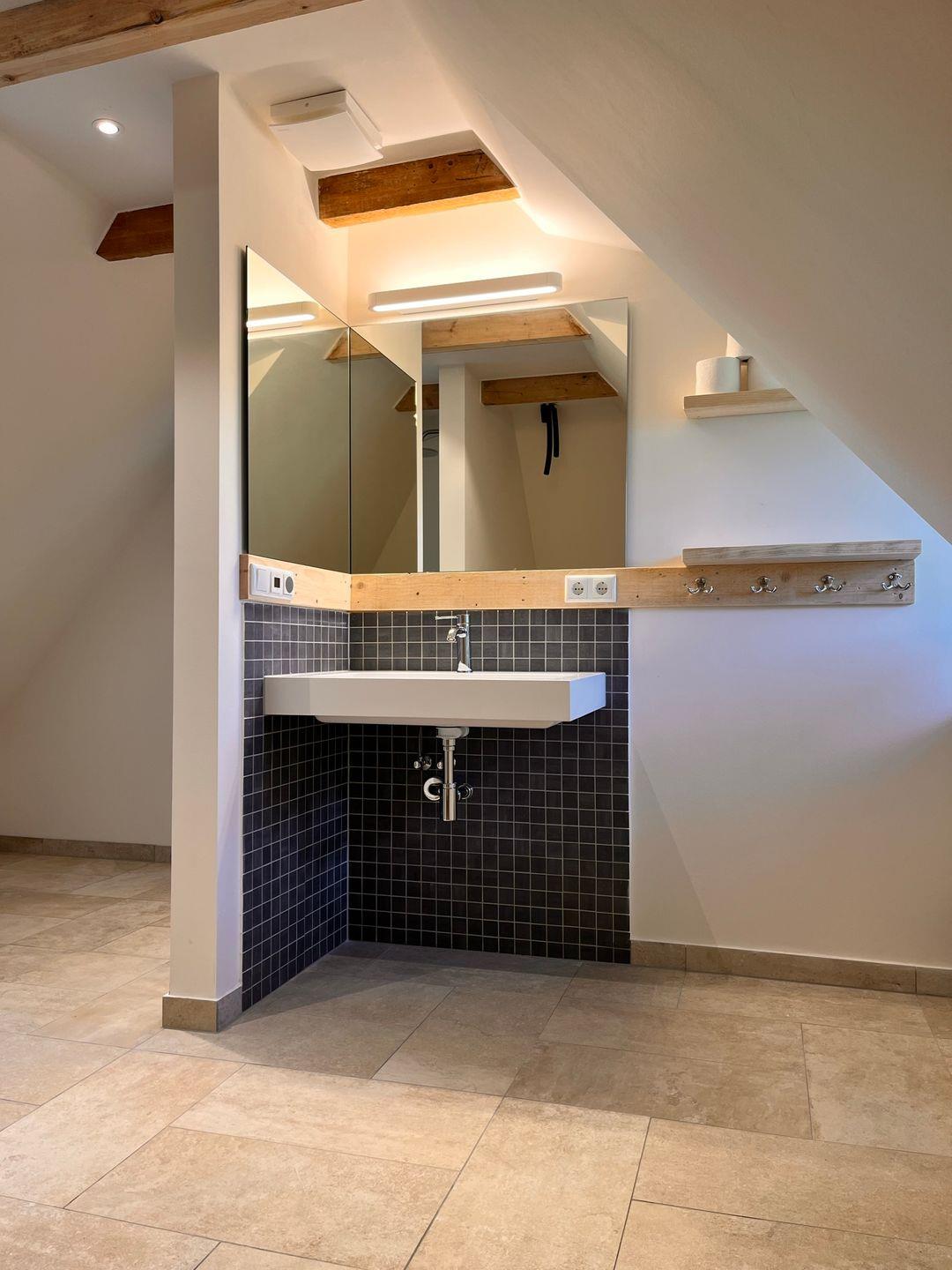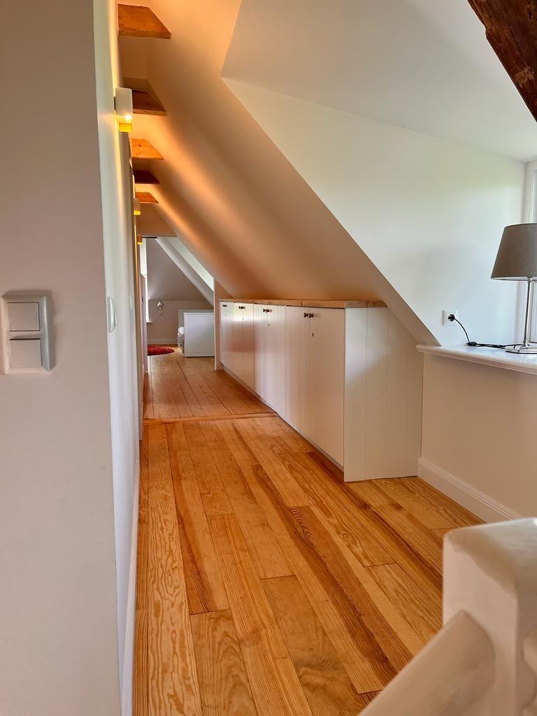 Insgesamt verfügt das Haus über vier Doppelschlafzimmer und ein großes Kinderschlaf- und Spielzimmer mit zwei Kojenbetten. Das Bad im Erdgeschoss verfügt über eine bodentiefe Dusche und 2 Waschbecken. Das WC ist separat. Im Obergeschoss befindet sich ein weiteres Badezimmer mit einer bodentiefen Dusche und einer Sauna. Das WC im Obergeschoss ist ebenfalls separat.