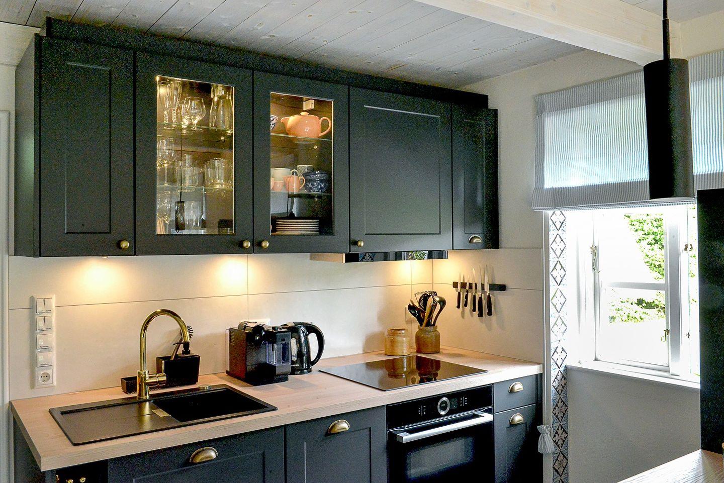 Maßgeschneiderte offene Premiumküche mit Induktionsherd, Kompaktbackofen mit Mikrowelle, Dunstabzug, Geschirrspüler, Kühlgefrierkombination, Nespresso-Kaffeemaschine, Handfilter, French-Press, Toaster, Wasserkocher, Mixer, Stabmixer-Set und weiteres umfassendes Küchenzubehör. Dibbern Solid Color Geschirr und antikes silbernes Essbesteck.