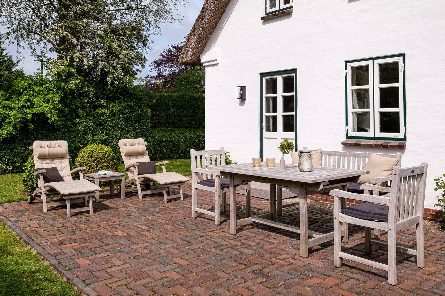 Sichtgeschützter Garten mit zwei Terrassen, Plantagen-Teakholzmöbel mit hochwertigen Polsterauflagen und rollbarem Sonnenschirm. Pflanzkübel mit saisonal frischen Kräutern, Salaten & Co. für ein leckeres Kochergebnis.
