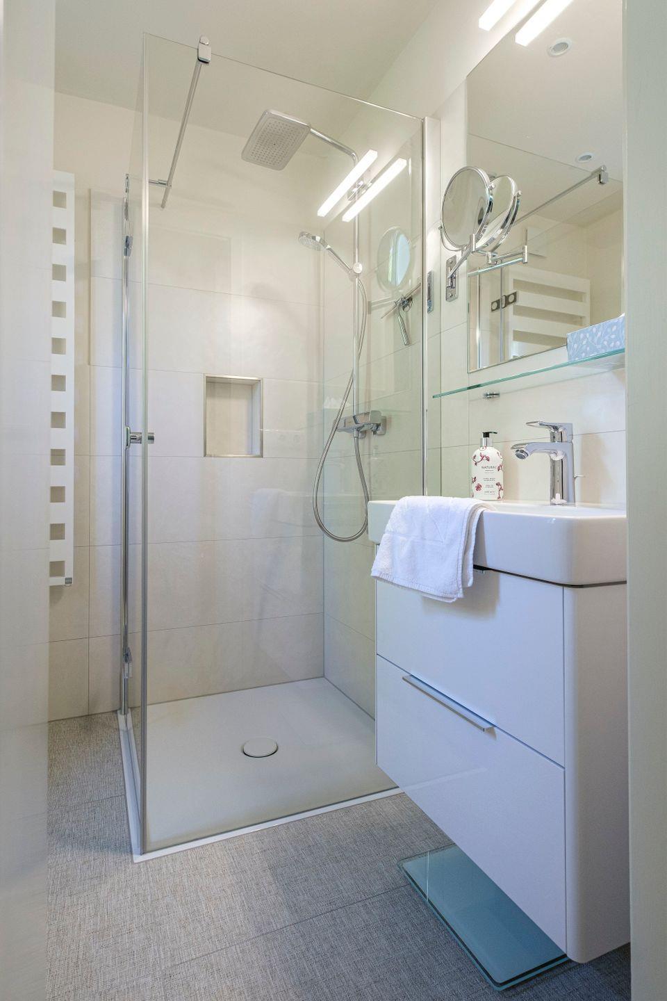 Modernes Tageslicht-Duschbad mit Handtuchheizkörper, Internet-Radio, Föhn, Kosmetikspiegel in harmonischer Farbgebung.