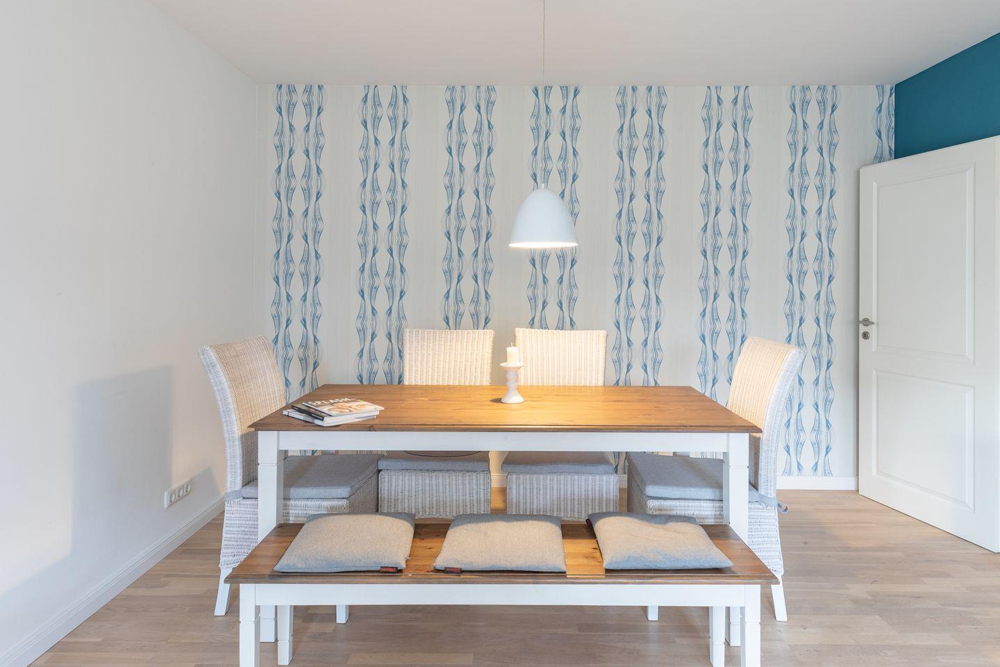 Genießen Sie im kombinierten Wohn-Essbereich im Kreise der Familie am großen Esstisch Ihre Mahlzeiten. In der Sofaecke können Sie vor dem Flachbild-TV relaxen.