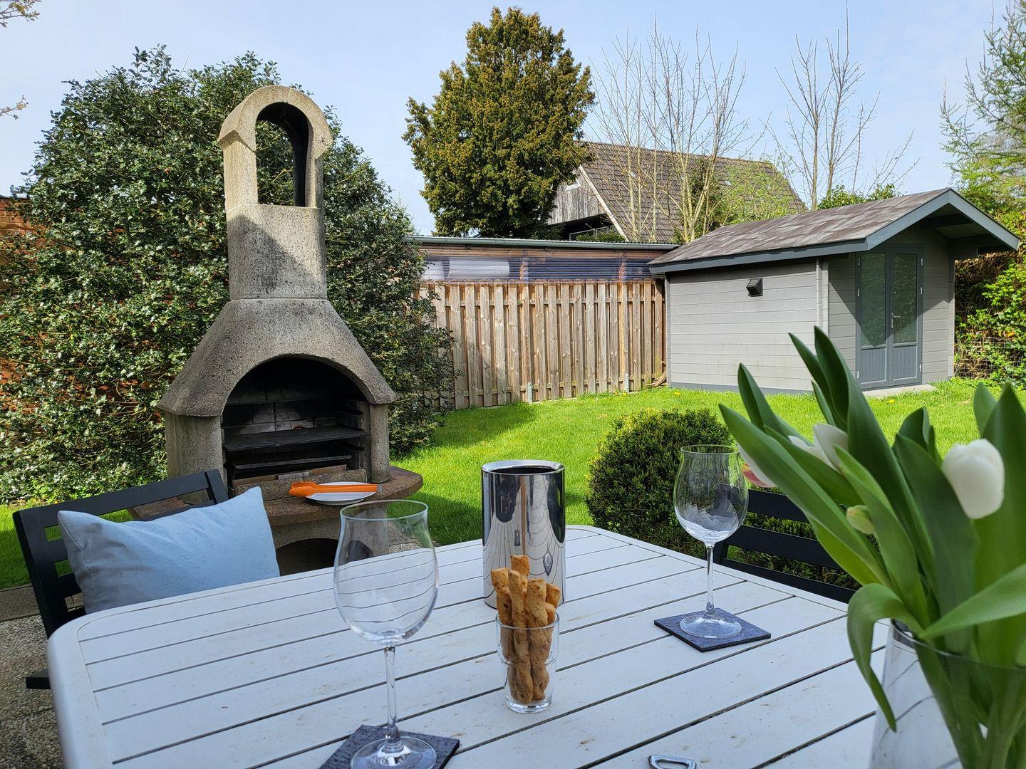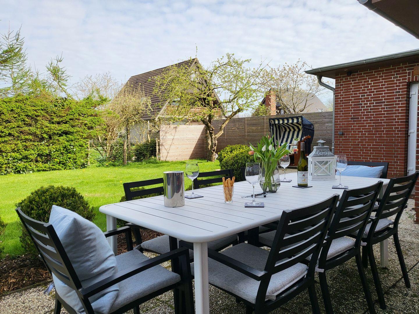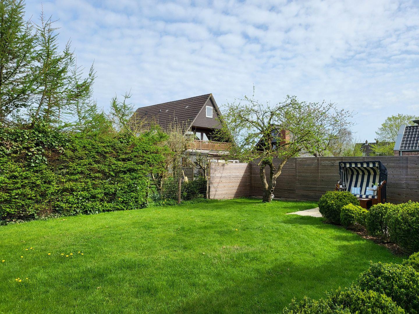 Zum Huuske Tating gehört außerdem ein uneinsehbarer Garten mit altem Baumbestand, Gartenmöbeln und Außenkamin.