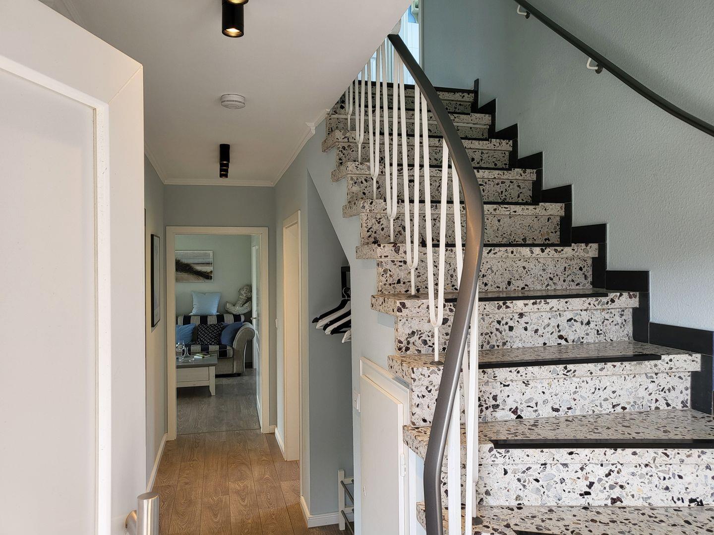 Im Obergeschoß, welches Sie über eine Terrazzo-Treppe erreichen, befinden sich 3 weitere Schlafzimmer mit zwei 180*200cm Betten und einem 140*200cm großen Bett. Außerdem befindet sich im Obergeschoß noch ein zweites kleines Bad mit Toilette und Waschbecken. Alle Zimmer verfügen über Verdunklungsplissees und sind größtenteils mit hochwertigen Massivholzmöbeln ausgestattet.