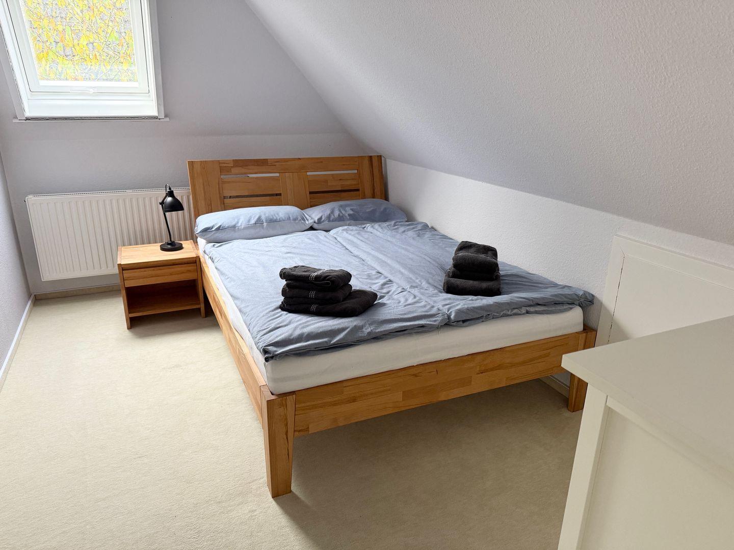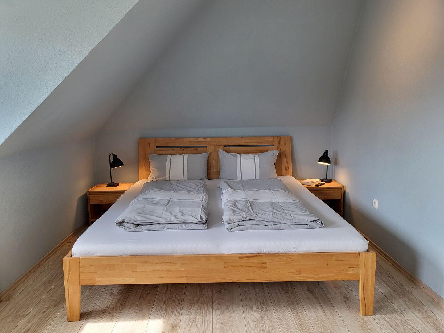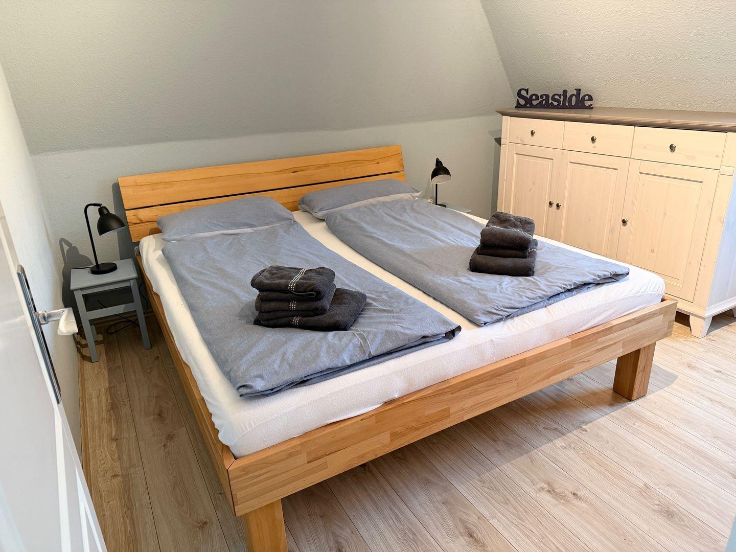 Im Obergeschoss befinden sich drei weitere Schlafzimmer mit Doppelbetten (1x 140x200 & 2x 180x200) und ein kleines Bad mit Toilette und Waschbecken.