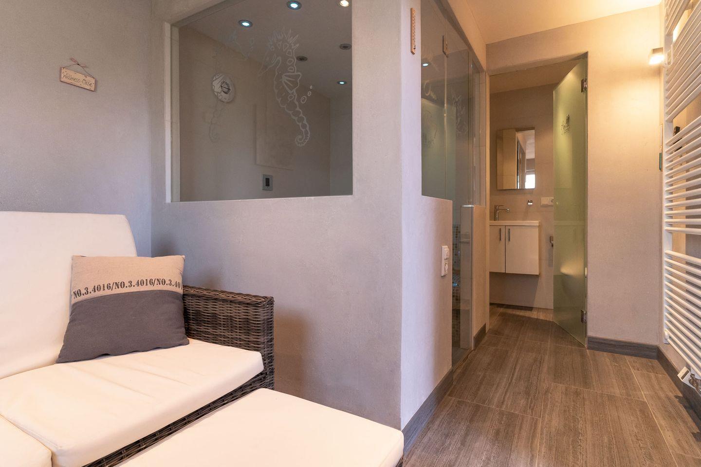 Über den angrenzenden Hauswirtschaftsraum, in dem Sie neben Waschmaschine und Trockner auch ein Bügelbrett und Bügeleisen finden, gelangen Sie über eine Außentür in den Wellness-Anbau mit traumhafter Dampfsauna und Ruhebereich sowie einer weiteren Dusche und WC. Wellnesserlebnis unter freiem Himmel. Dampf-Sauna kann gegen eine geringe Gebühr wochenweise dazu gebucht werden.