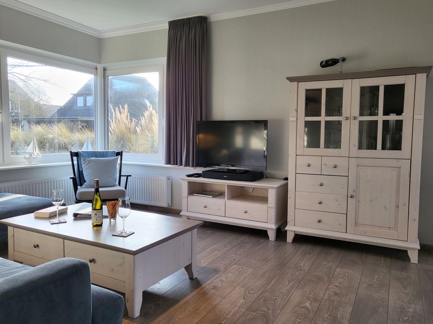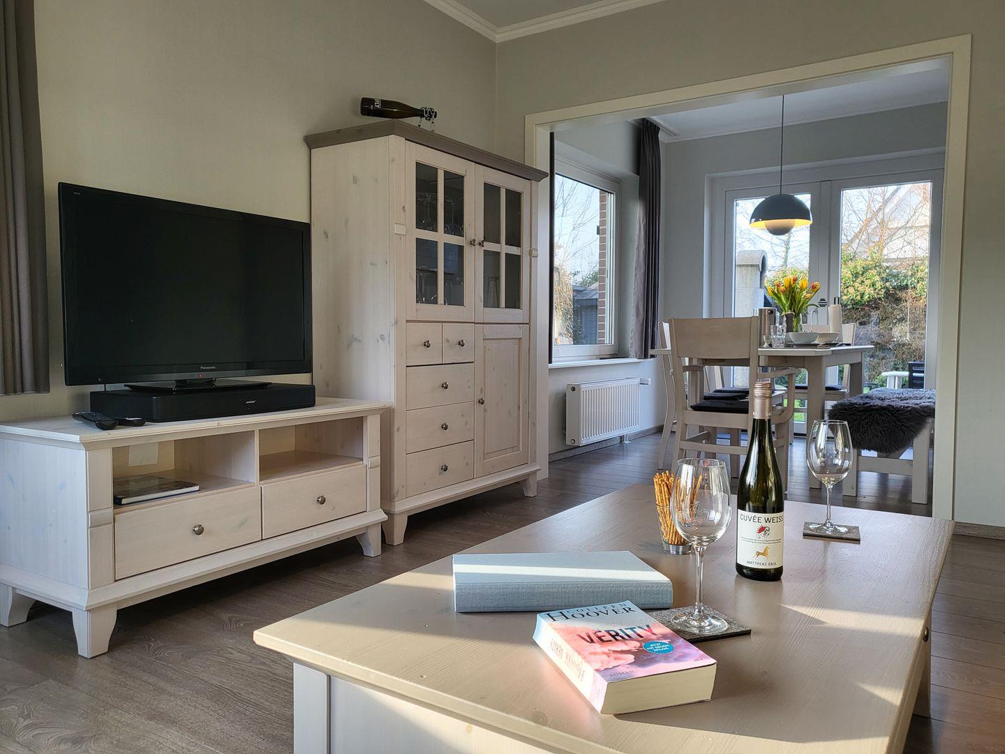 Dat Huuske Tating ist modern gestaltet und kinder- und familienfreundlich ausgestattet. Auf einer Wohnfläche von 140qm verfügt es im Erdgeschoss über einen Flur, einen großzügigen Wohnraum mit angrenzendem Essbereich, eine hochwertige Küche, ein Schlafzimmer mit 2x2m-Bett sowie ein Duschbad und einen Hauswirtschaftsraum. Über diesen gelangt man durch eine Außentür in den Anbau mit Sauna Ruhebereich und weiterem Bad mit Dusche und WC.