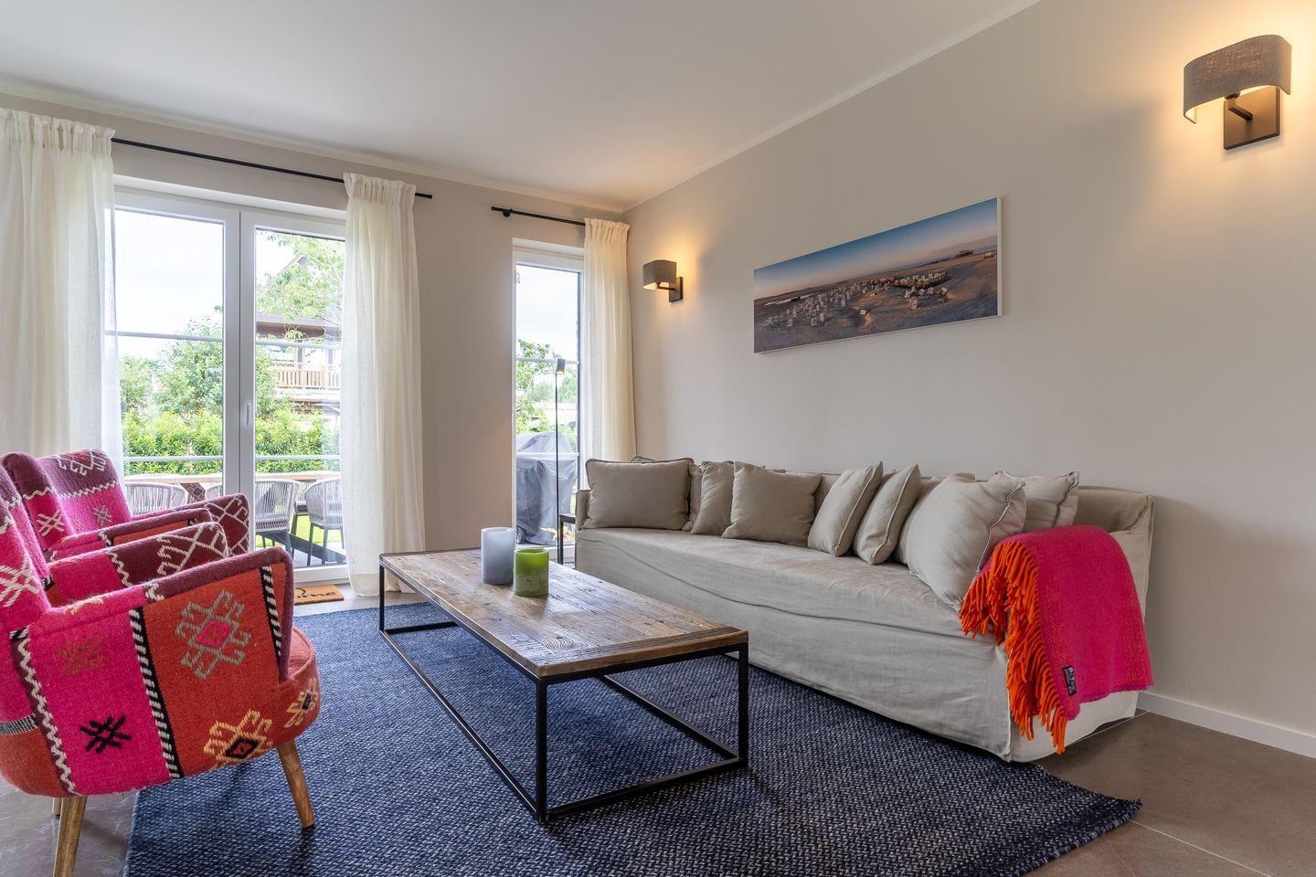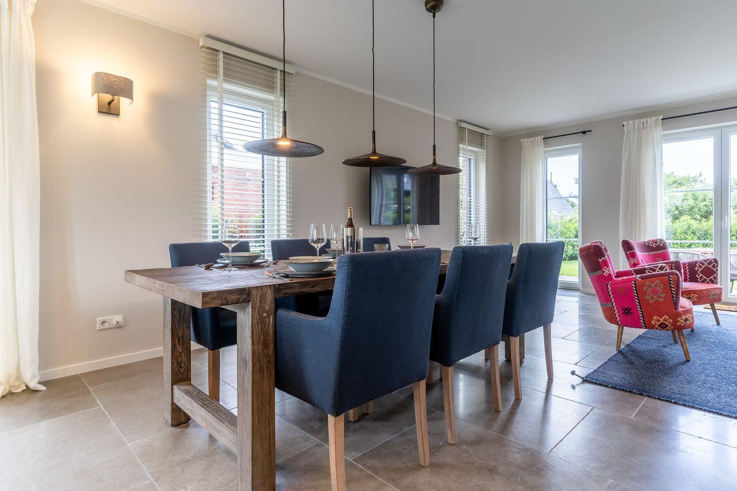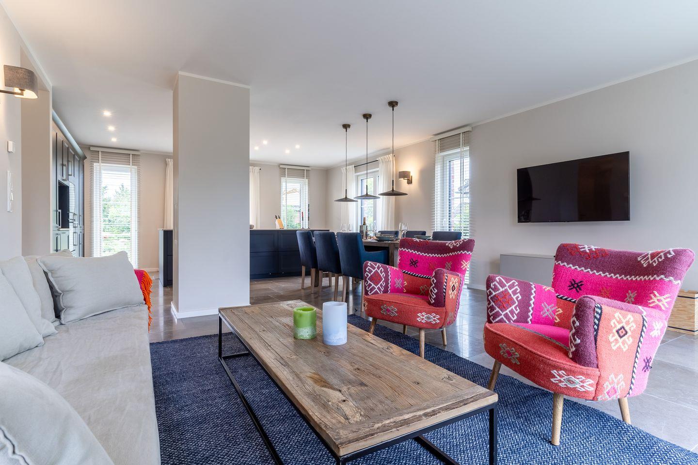 Das Ferienhaus besticht durch hochwertige Möbel und ein harmonisches Ambiente. Im lichtdurchfluteten Wohnzimmer mit TV können Sie herrlich entspannen und die offene Küche mit hochwertigen Elektrogeräten (Weinkühlschrank, Thermomix 5, Nespresso, großer Kühl- und Gefrierschrank, Bora Induktionsherd, etc.) lädt zum gemeinsamen Kochen ein. Hier befindet sich außerdem ein gemütliches Esszimmer. Ob Morgensonne oder Abendsonne - vom Küchenbereich, sowie vom Wohnzimmer gelangen Sie jeweils auf eine große Terrasse mit hochwertigen Gartenmöbeln. Im Erdgeschoss befindet sich ebenso ein Doppelschlafzimmer (200 x 200 cm) und ein angrenzendes, modernes Duschbad. Vom großzügigen Flur mit Hauswirtschaftsraum und Gäste WC gelangen Sie über eine Holztreppe ins Obergeschoss. Hier befinden sich drei weitere gemütlich eingerichtete Schlafzimmer mit komfortablen Boxspringdoppelbetten (180 x 200 cm) Ein geräumiges Badezimmer mit Dusche und Badewanne sorgt für zusätzlichen Komfort.