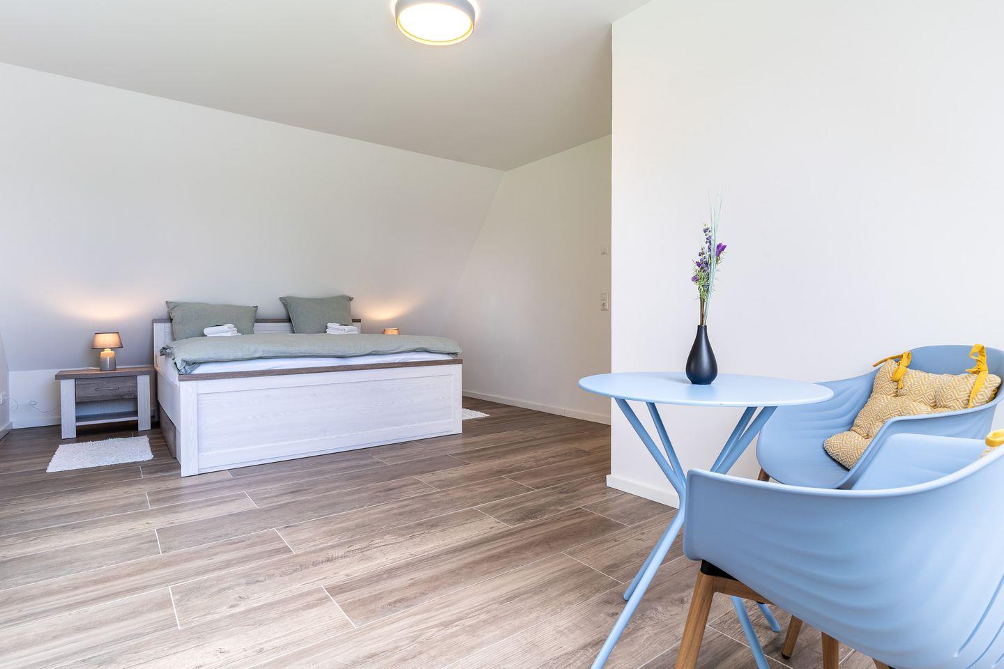 Über eine stilvolle, geländerfreie Treppe gelangen Sie in die obere Etage. Hier erwarten Sie drei weitere Schlafzimmer: Zwei davon spiegelgleich mit je einem gemütlichen Bett (140x200 cm) und ein weiteres Schlafzimmer mit einem großzügigen Doppelbett (180x200 cm). Ein großes Badezimmer mit bodengleicher Dusche und Badewanne rundet das Angebot ab.