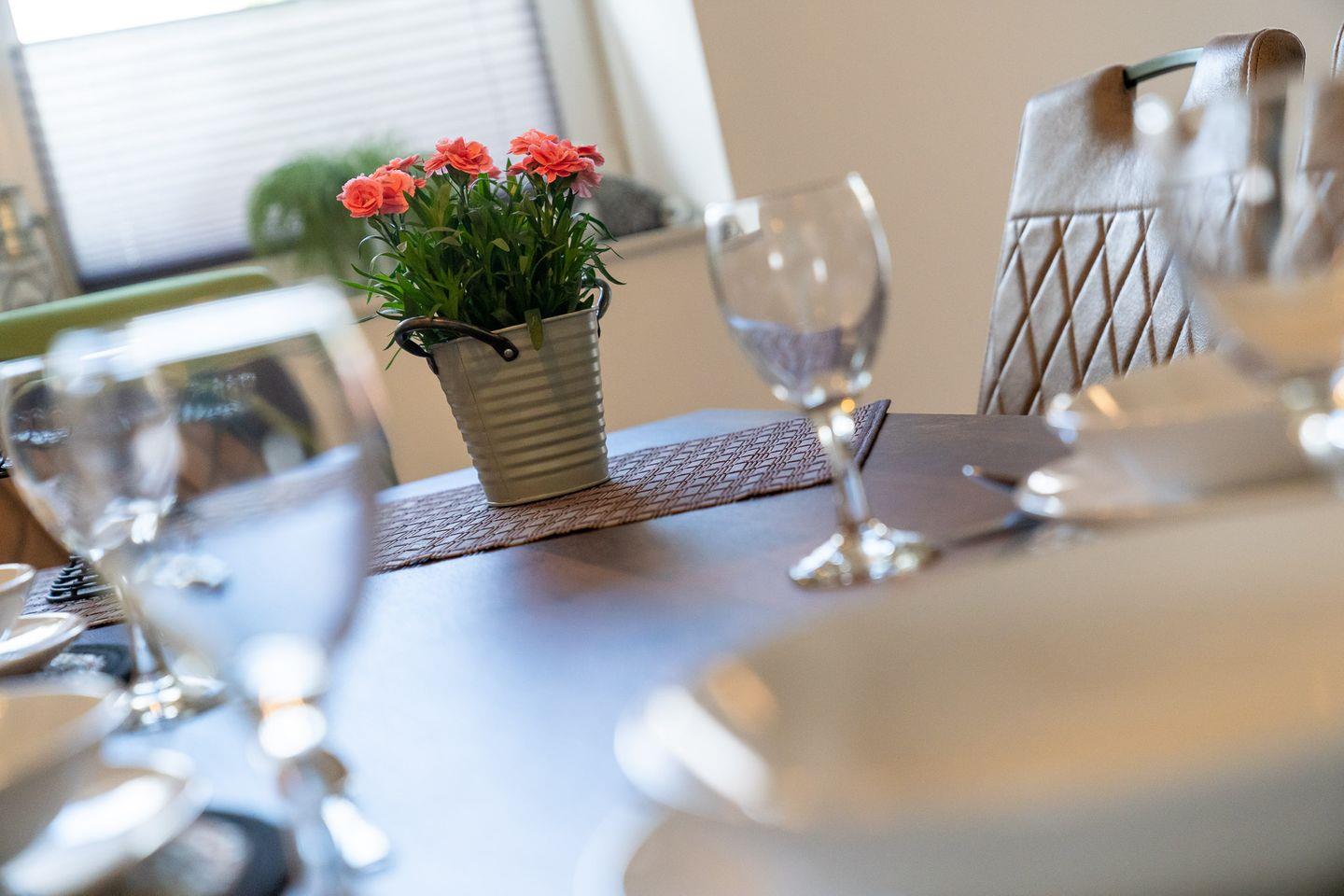 Im Erdgeschoss erwartet Sie ein großzügiger Wohn-Essbereich mit offener Küche, einem großen Esstisch und einer gemütlichen Wohnlandschaft – ideal für gesellige Stunden mit Familie und Freunden. Das erste von vier Schlafzimmern befindet sich ebenfalls im Erdgeschoss und ist mit einem komfortablen Doppelbett (180x200 cm) ausgestattet. Zusätzlich finden Sie hier ein modernes Badezimmer mit bodengleicher Dusche sowie einen kleinen Abstellraum mit Waschmaschine.