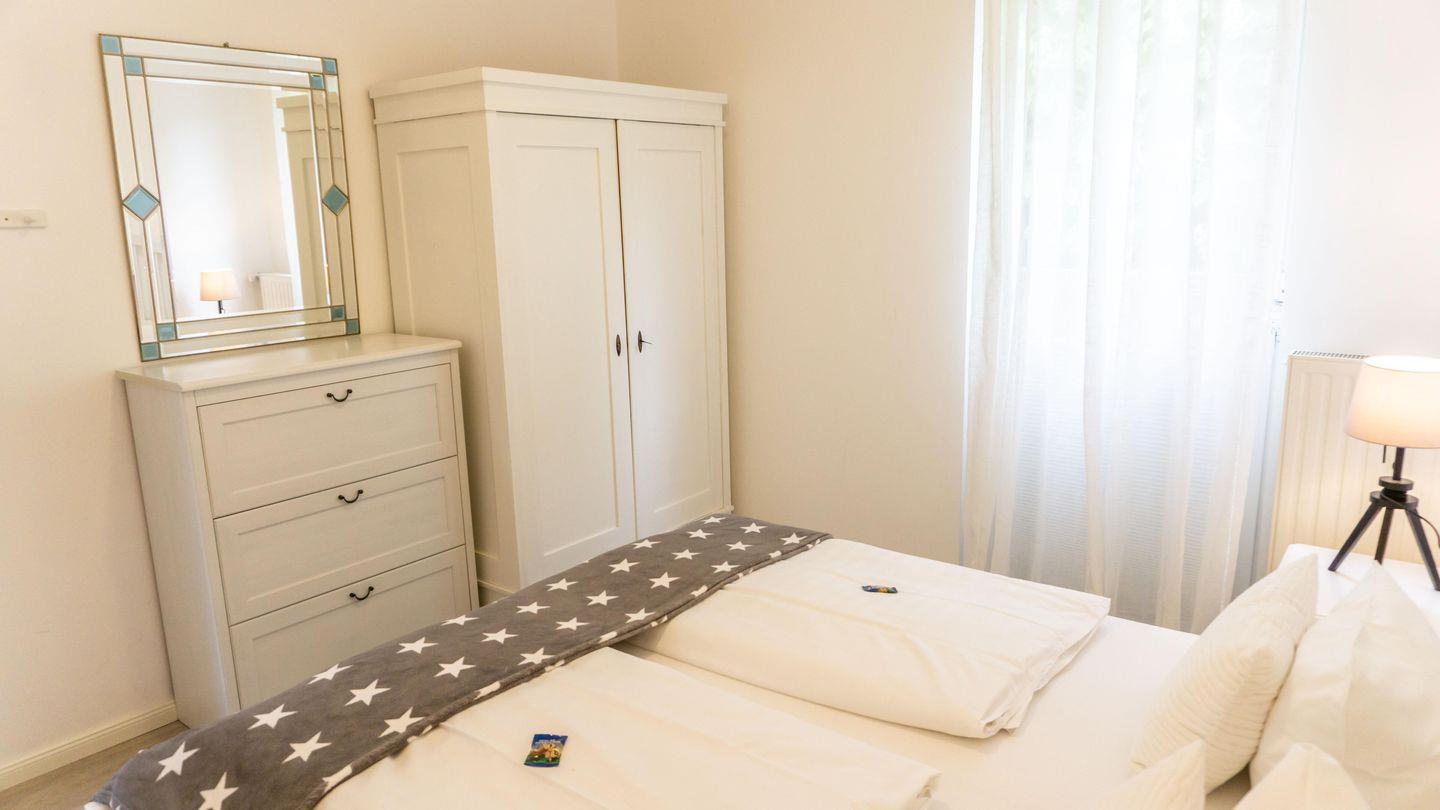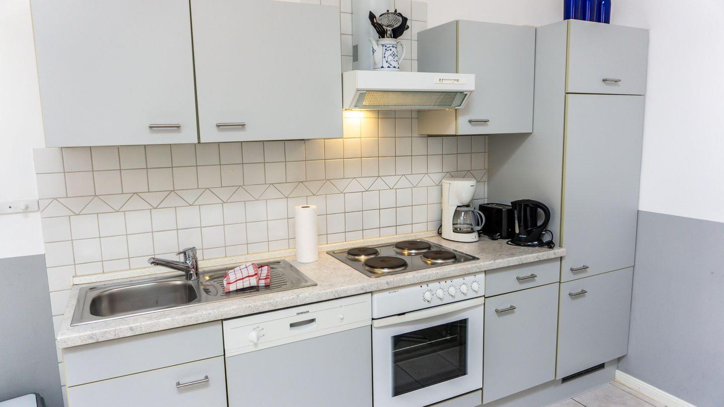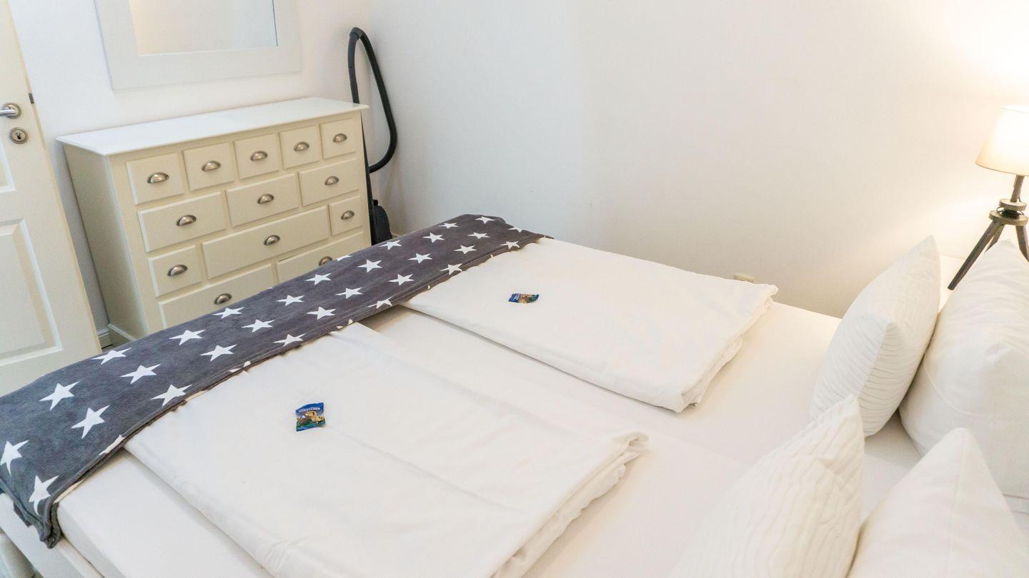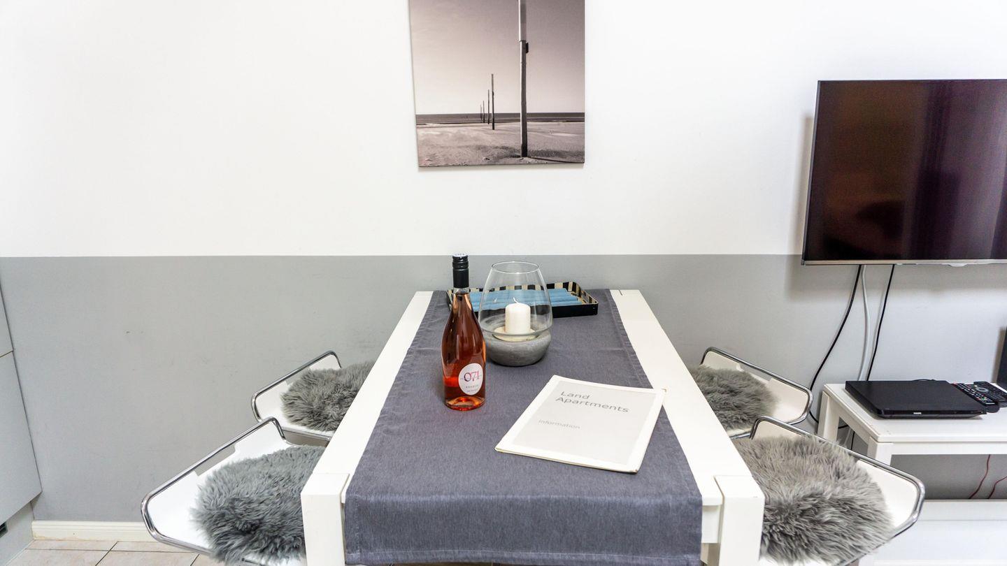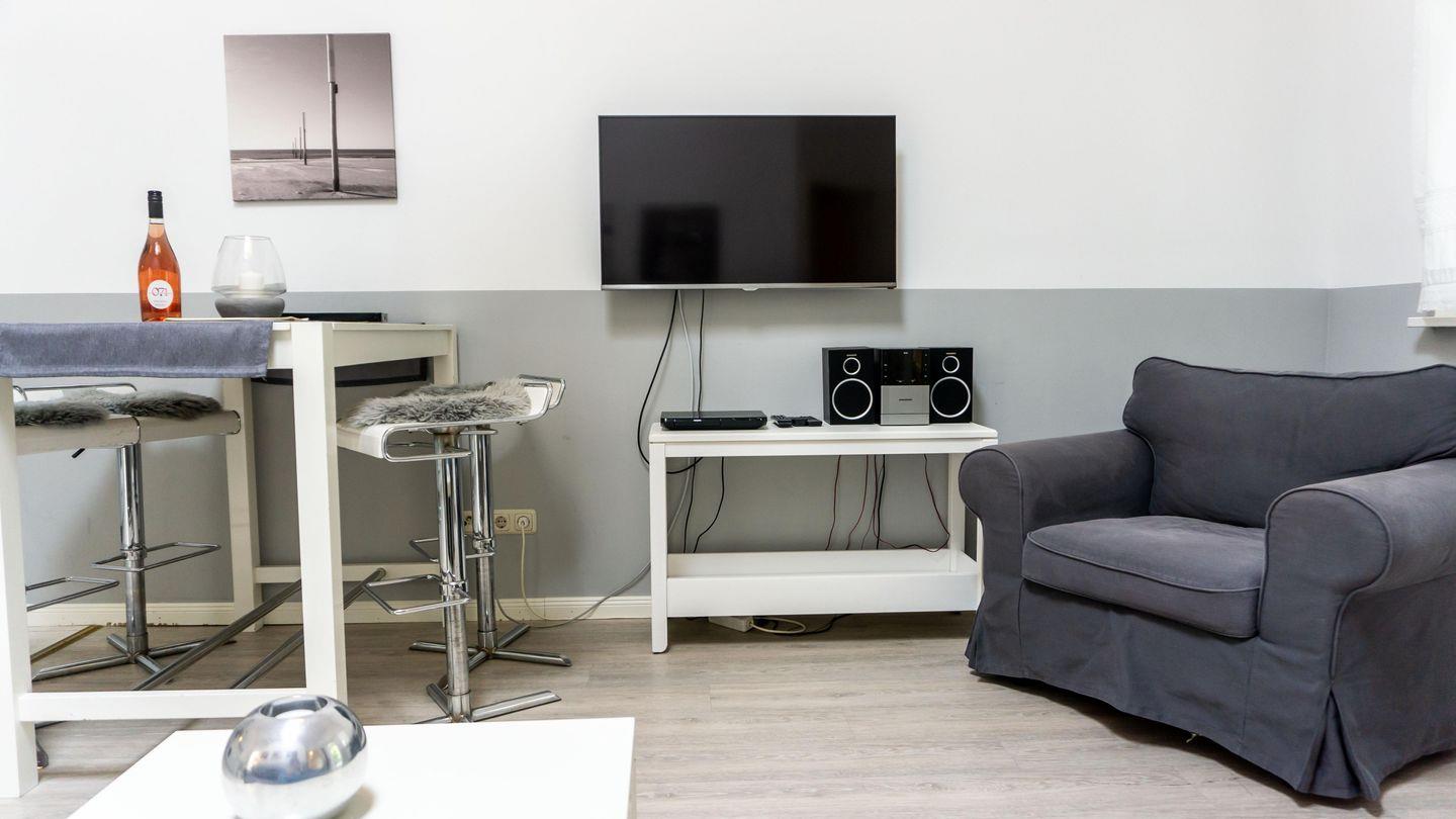 Die Unterkunft befindet sich im ersten Stock und verfügt über zwei geschmackvoll eingerichtete Schlafzimmer, die für erholsame Nächte sorgen. Der helle und einladende Wohnbereich ist offen gestaltet und harmonisch mit der Küche verbunden, wodurch eine angenehme Atmosphäre für gemeinsame Stunden entsteht. Die Ausstattung der Küche lässt keine Wünsche offen: von einem Herd mit Ceranfeld über einen Backofen, eine Spülmaschine bis hin zu einer Kaffeemaschine und einem Toaster – alles steht bereit, um kulinarische Köstlichkeiten zuzubereiten. Ein Hochtisch für angenehme Mahlzeiten sowie eine gemütliche Sofaecke tragen zu einem angenehmen Wohngefühl bei.