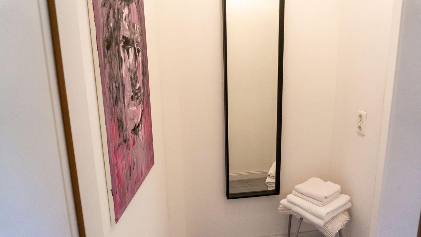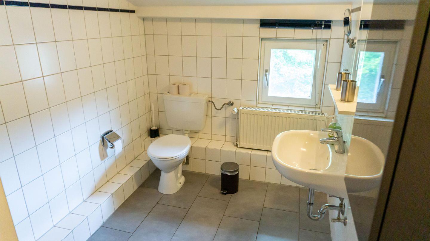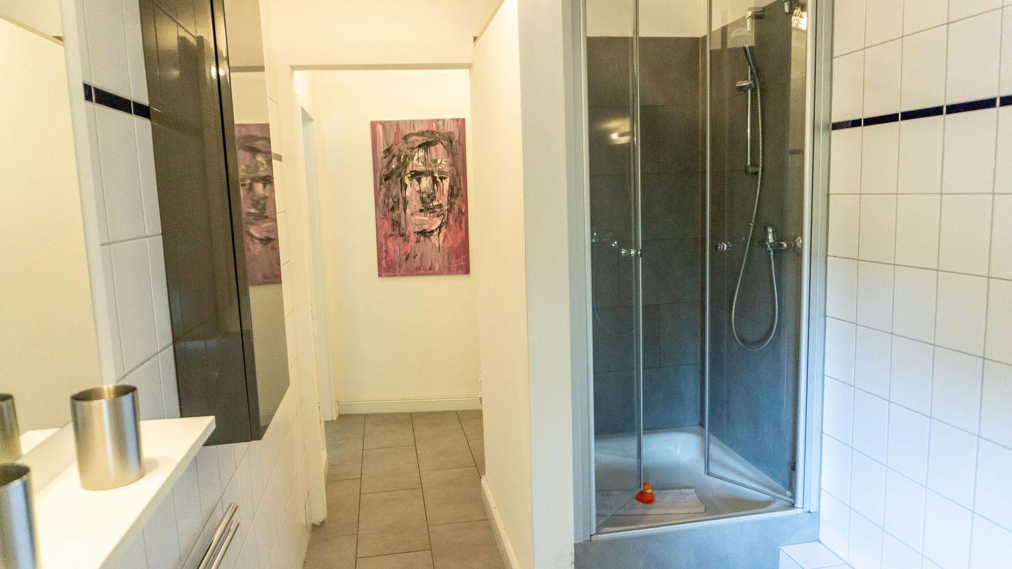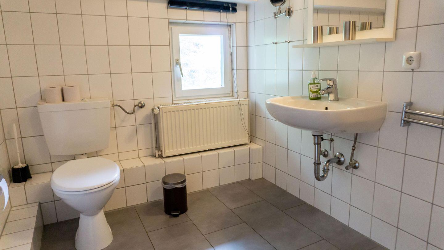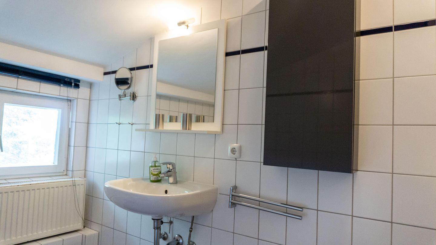 Das Badezimmer ist mit einer Dusche, einem WC, Waschbecken und einem Haartrockner ausgestattet. Ein Kosmetikspiegel rundet die Ausstattung ab.