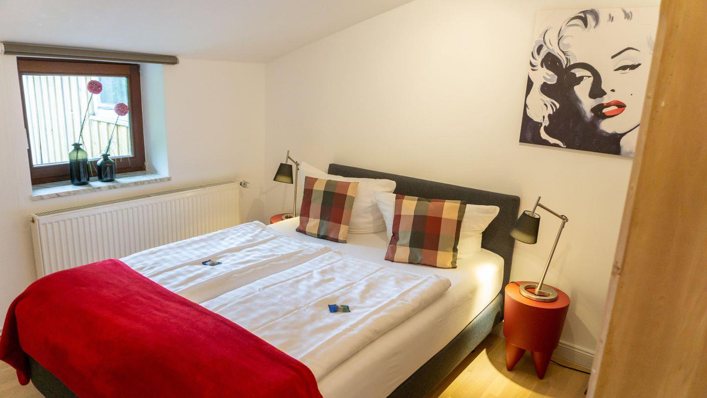Der Schlafbereich ist hell und freundlich gestaltet.