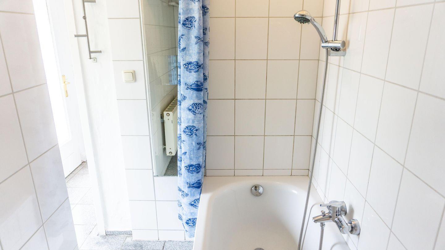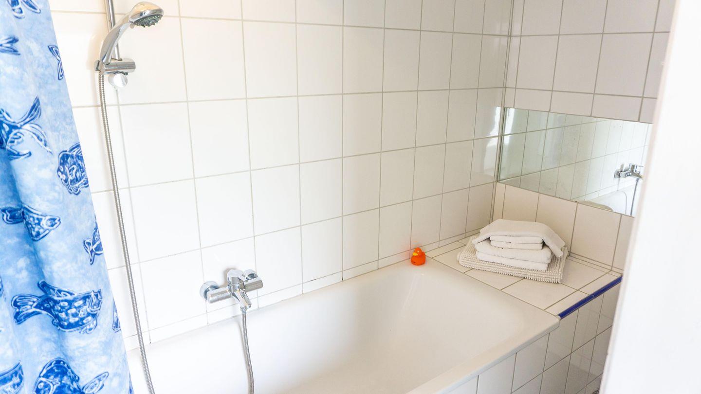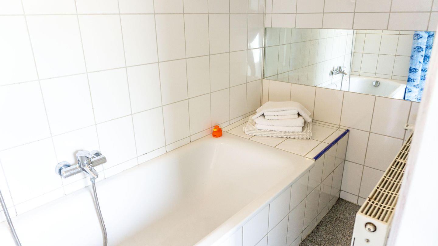 Das Badezimmer hat eine Badewanne mit integrierter Dusche. Standardmäßig finden sich hier auch ein Waschbecken mit Spiegel, Toilette und ein Fön.