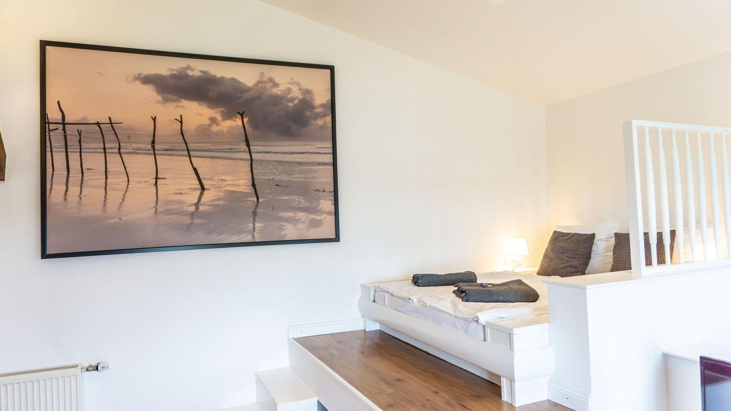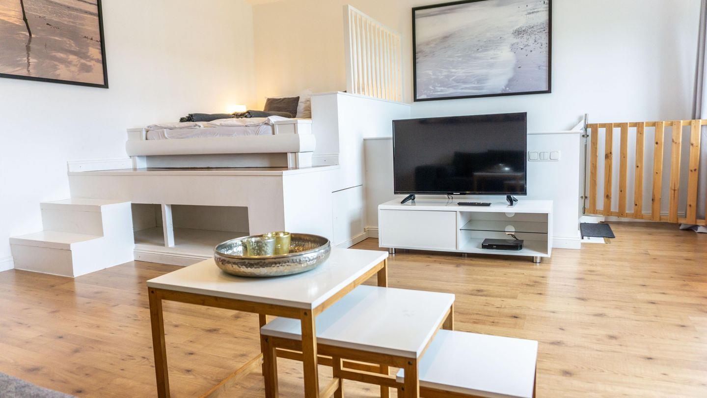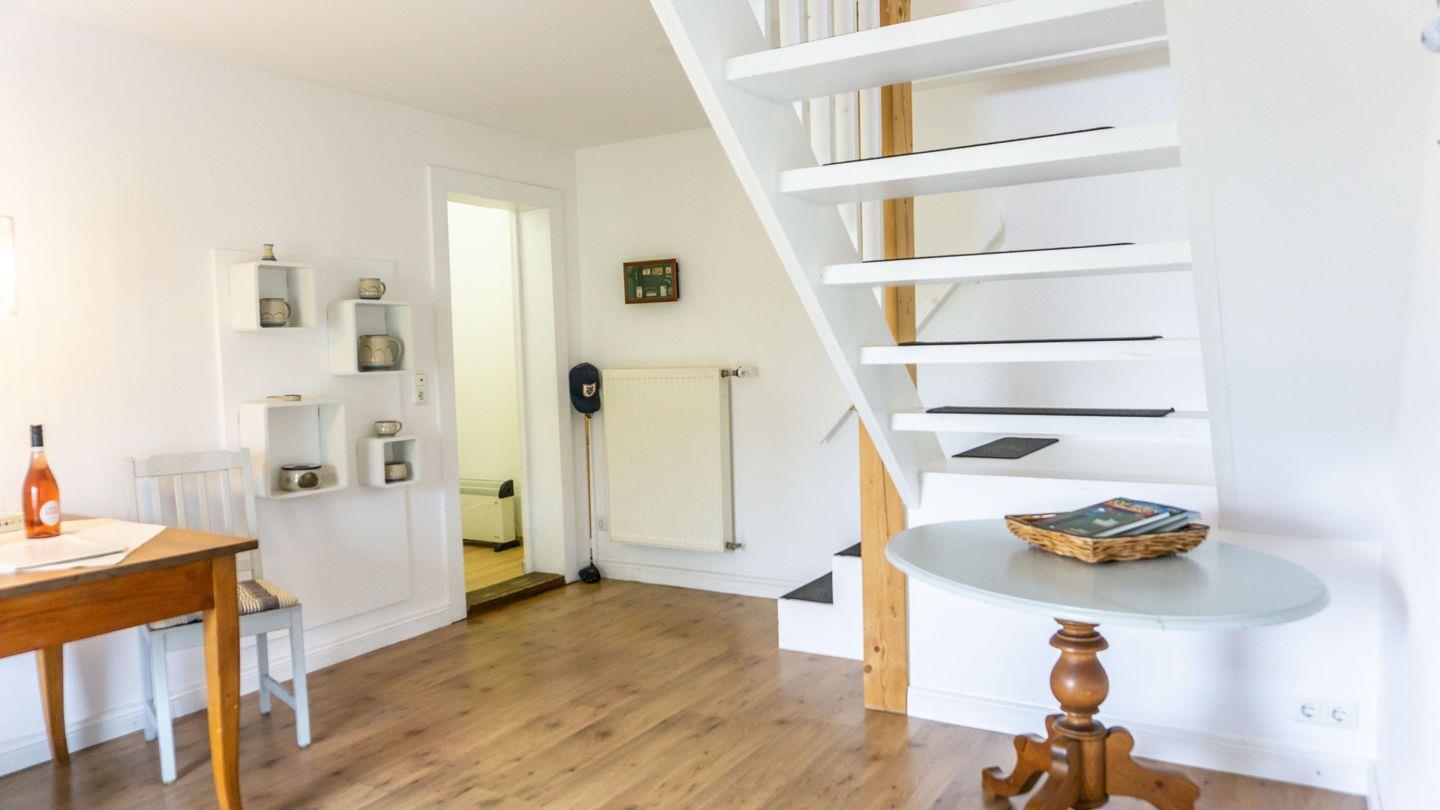 Die Unterkunft ist in einem hellen und freundlichen Stil gestaltet und verfügt über ein Esszimmer und einer vollständig ausgestatteten Küche. Die Küche ist mit 2 Kochplatten,, Backofen, Kühlschrank, Toaster, Wasserkocher, Mikrowelle und einer Kaffeemaschine ausgestattet. Sie finden hier alle notwendigen Küchenutensilien, sodass Sie sich wie zu Hause fühlen können.Der Wohnbereich im 1. OG hat auf einer Empore das Doppelbett ( 180cm x200 cm) integriert. Er bietet eine gemütliche Sofaecke, ideal für entspannte Abende mit Blick auf den Fernseher.