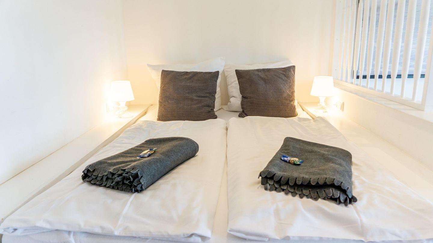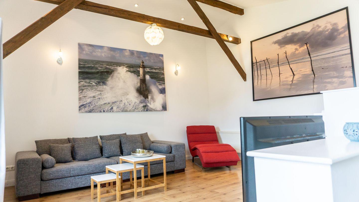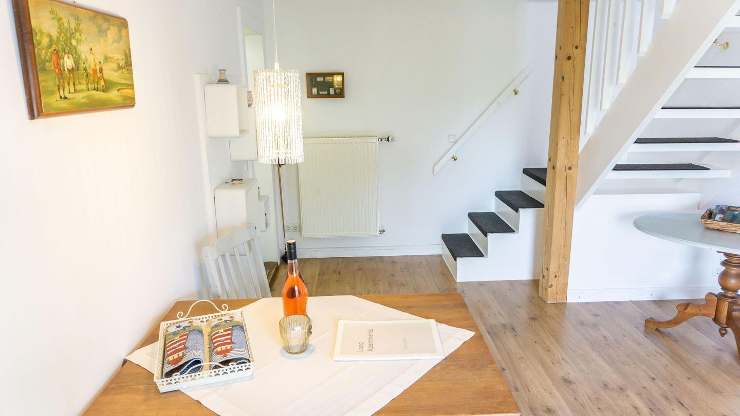 Die Unterkunft ist in einem hellen und freundlichen Stil gestaltet und verfügt über ein Esszimmer und einer vollständig ausgestatteten Küche. Die Küche ist mit 2 Kochplatten,, Backofen, Kühlschrank, Toaster, Wasserkocher, Mikrowelle und einer Kaffeemaschine ausgestattet. Sie finden hier alle notwendigen Küchenutensilien, sodass Sie sich wie zu Hause fühlen können.Der Wohnbereich im 1. OG hat auf einer Empore das Doppelbett ( 180cm x200 cm) integriert. Er bietet eine gemütliche Sofaecke, ideal für entspannte Abende mit Blick auf den Fernseher.