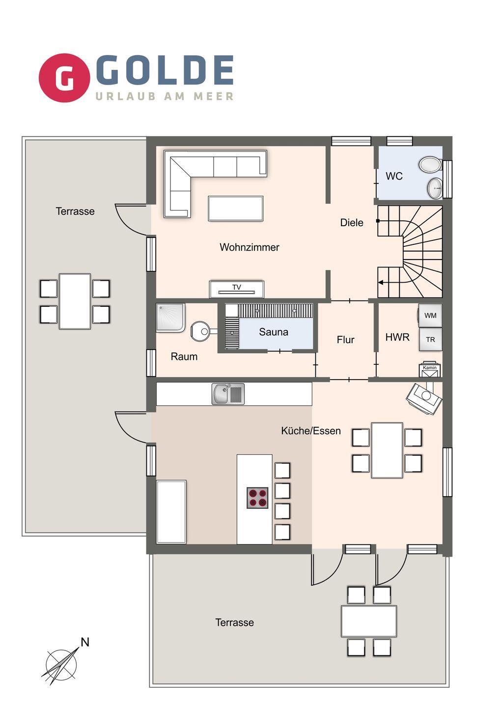 Im Erdgeschoss befindet sich der lichtdurchflutete Wohnraum mit TV, einer großen offenen Küche sowie einem stilvollen Essbereich mit Kamin. Die Wohnräume sind mit exklusiven Möbeln ausgestattet. Die Küche verfügt über hochwertige Elektrogeräte. An den Wohnbereich schließen sich ein Duschbad mit Sauna, ein Hauswirtschaftsraum und ein geräumiger Flur sowie eine Gäste WC an.