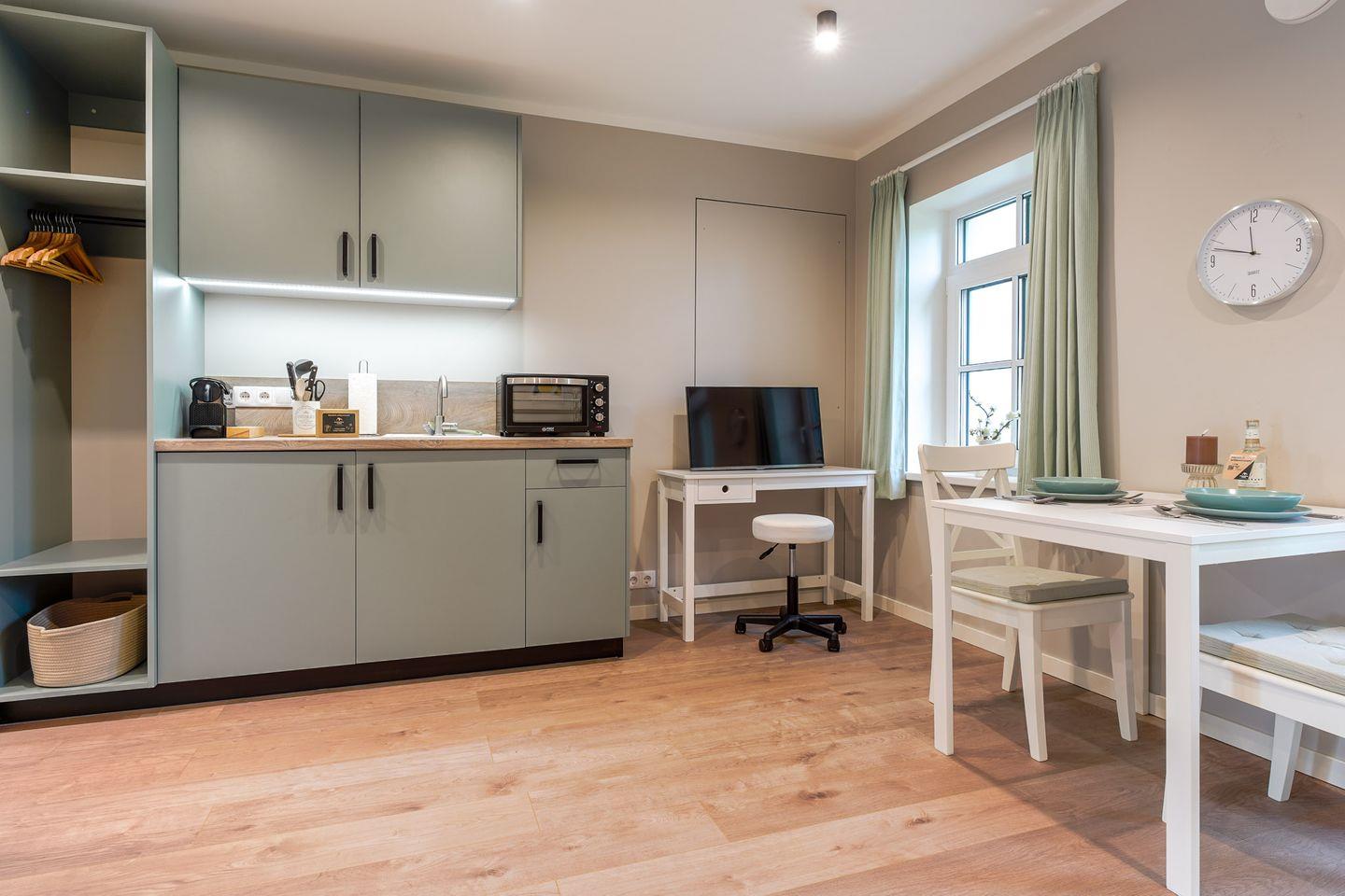 Gemütliches Serviced Apartment (19 m²) in der Alten Schule Tating, perfekt für 1–2 Personen. Nur 5 Min. von SPO! Moderne Ausstattung, eigene Küche & Bad – ideal für Homeoffice, Workation, oder Auszeit!