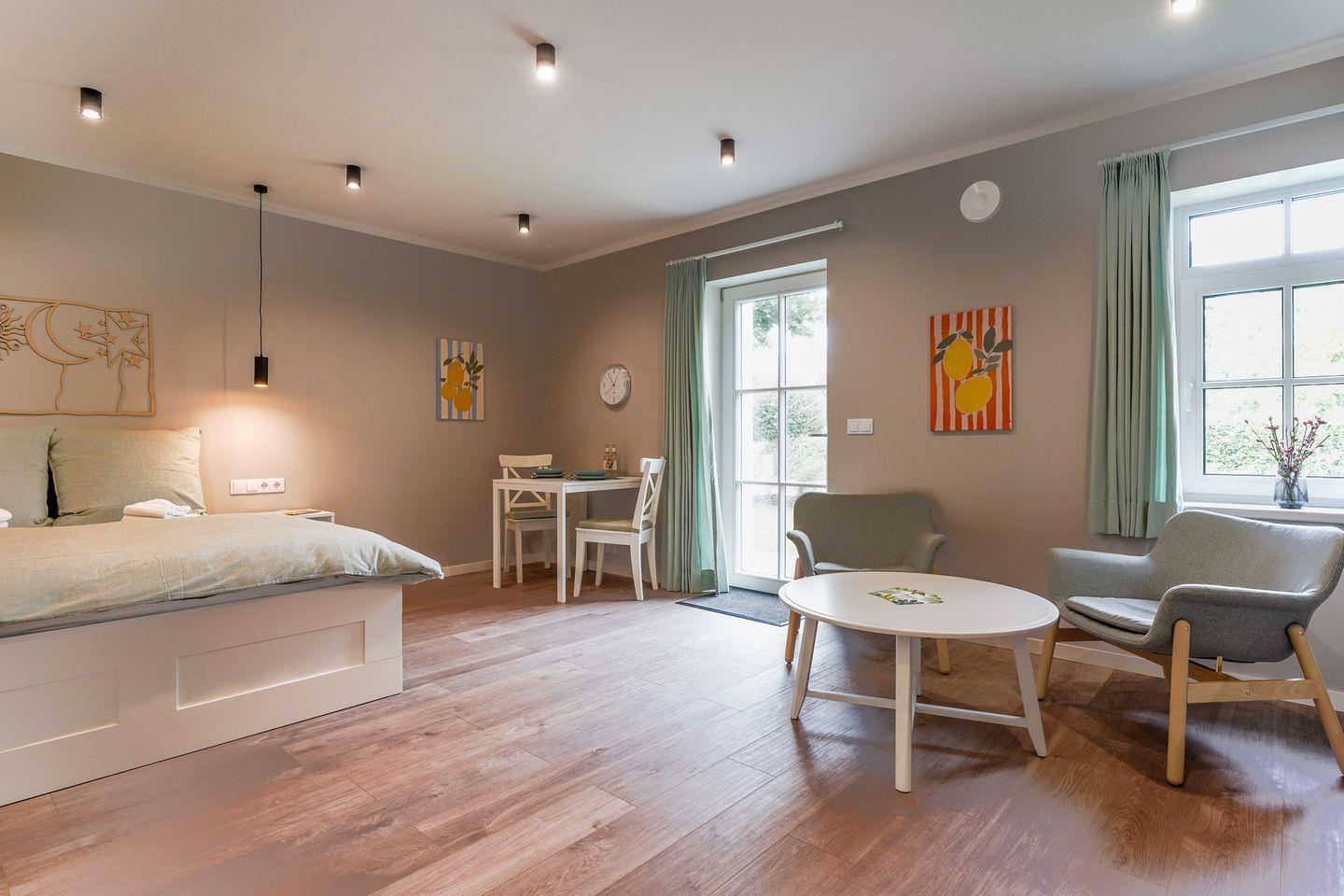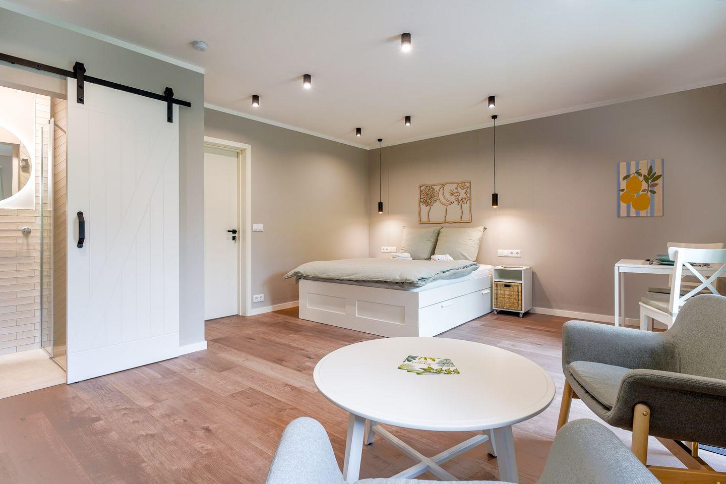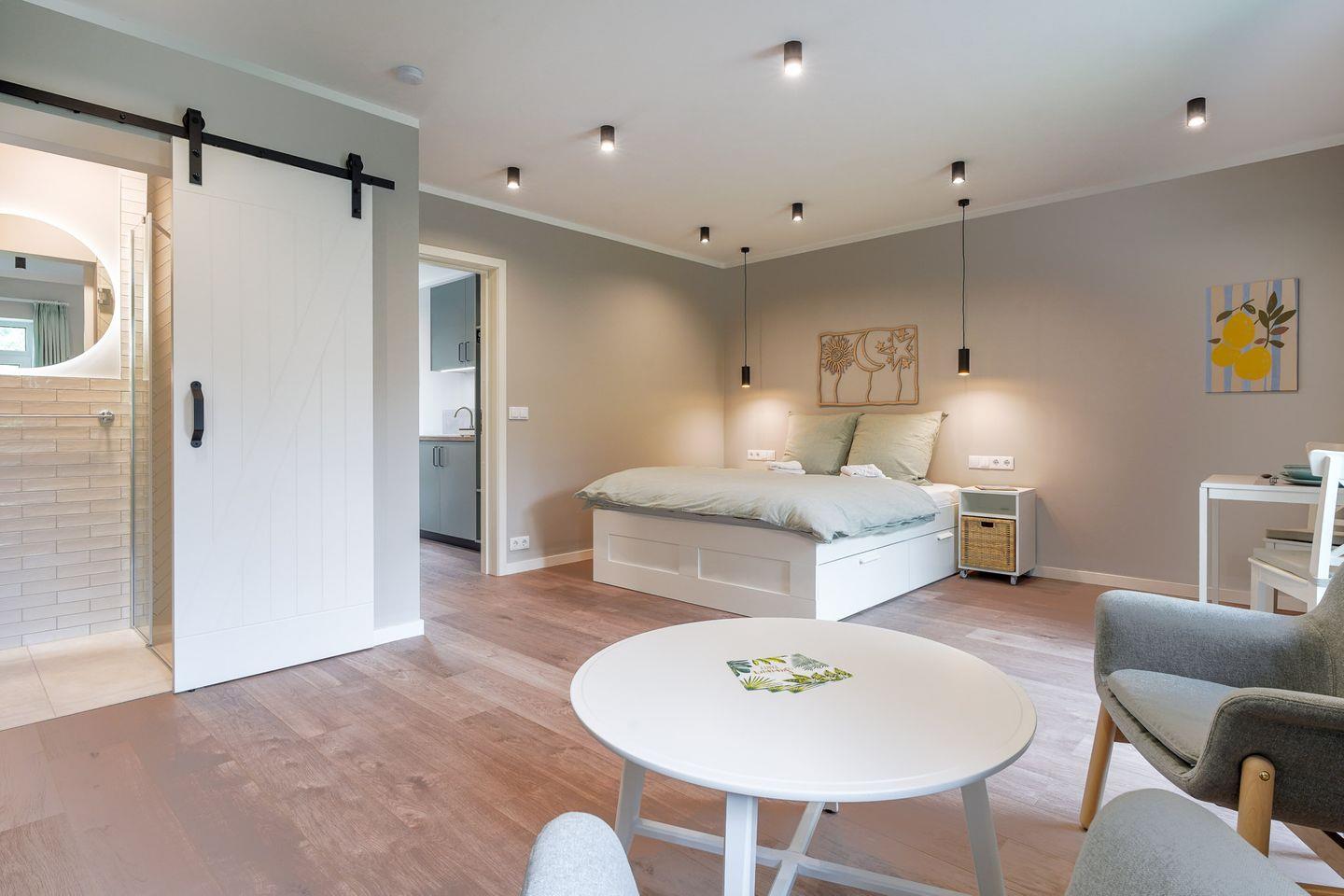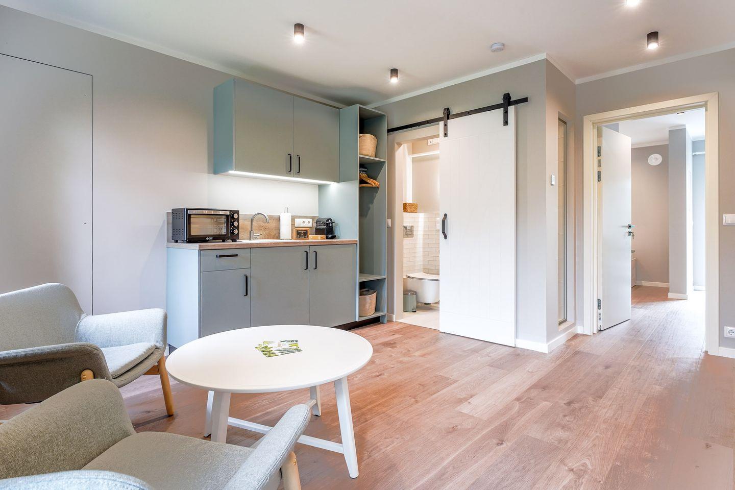Serviced Apartments sind, als abgeschlossene, eigenständige Wohneinheiten vermietete Wohngebäude im Sinne des § 3 Abs. 1 Nr. 33 GEG. Dies umfasst ausdrücklich auch voll ausgestattete Apartments für Kurz-, Mittel- und Langzeitaufenthalte. Genau das erwartet Sie hier: funktional, stilvoll und komplett eingerichtet – für Workation- und Freizeitaufenthalte gleichermaßen.