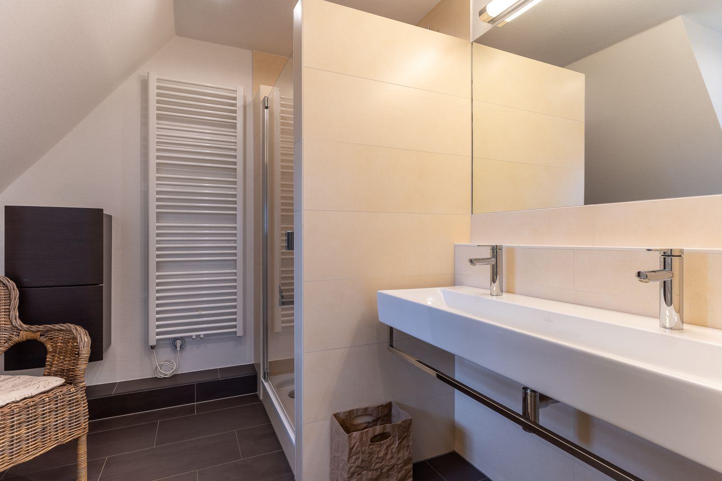Eine Haushälfte unter Reet, ca. 100 m² Wohnfläche auf 2 Ebenen, auf großzügigem Grundstück mit ca. 1.200 m² und Terrasse. Im EG befinden sich ein Duschbad mit barrierefreier Dusche und WC, ein Schlafzimmer mit einem 1,60 x 2 m Doppelbett, das gemütliche Wohn/Esszimmer mit Kaminofen, offener, hochwertiger Küche sowie einem Wirtschaftsraum mit Waschmaschine. Im OG befinden sich das großzügige Elternschlafzimmer mit Boxspringbett 1,80 x 2 m und einem Einbauschrank, ein Kinderzimmer mit zwei Einzelbetten 1 x 2 m plus Einbauschrank sowie einem Duschbad mit Komfortdusche, Doppelwaschbecken und Handtuchheizung und WC. Im gesamten Haus liegt eine Fußbodenheizung, im EG unter Fliesen im OG unter weiß gekalkten Eichendielen.