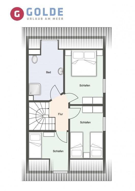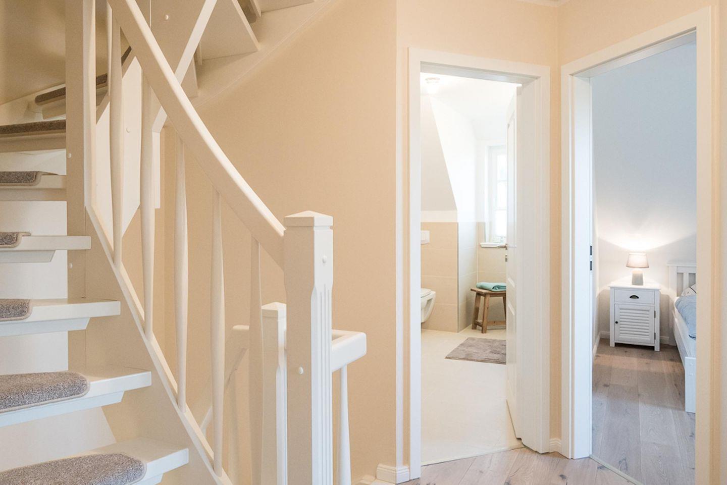 Über eine schöne weiße Holztreppe gelangt man in das mit Parkett ausgelegte Obergeschoss. Hier befinden sich ein Schlafzimmer mit einem Doppelbett (180 x 200cm), ein Schlafzimmer mit 2 Einzelbetten (je 90 x 200cm) und TV. Außerdem ist im Obergeschoss eine Kuschelkoje mit einem Einzelbett (90 x 200cm) vorhanden zum Zurückziehen oder Spielen. Alle Schlafzimmer verfügen über ein Verdunkelungsrollo und sehr gut getestete Matratzen für einen angenehmen gesunden Schlaf. Schränke gewähren Ihnen hinreichend Ablageflächen. Darüber hinaus befindet sich im Obergeschoss ein weiteres, geräumiges Bad mit Dusche. Auch für die kleinen Gäste ist gesorgt: Es gibt Spielzeug, ein Reisebett, einen Kinderhochstuhl, Kindernachtleuchten, einen Kinderhocker im Bad und einen Kinder-WC-Sitz.